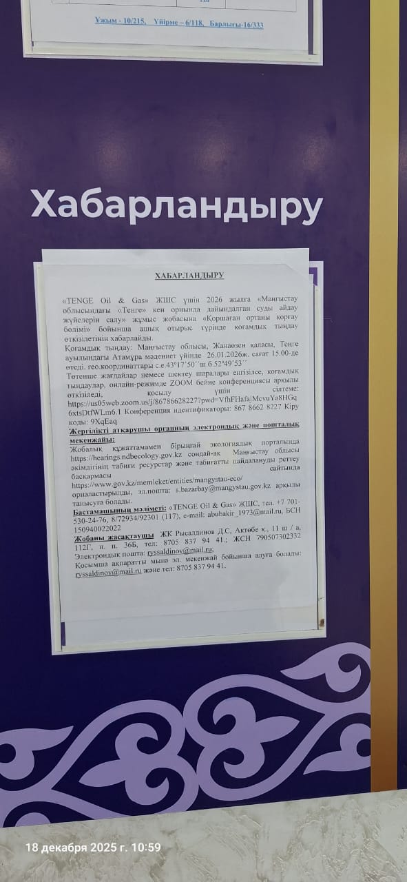 3. Общественные слушания организованны: Управление природных ресурсов и регулирования природопользования Мангистауской области, s.bazarbay@mangystau.gov.kz,