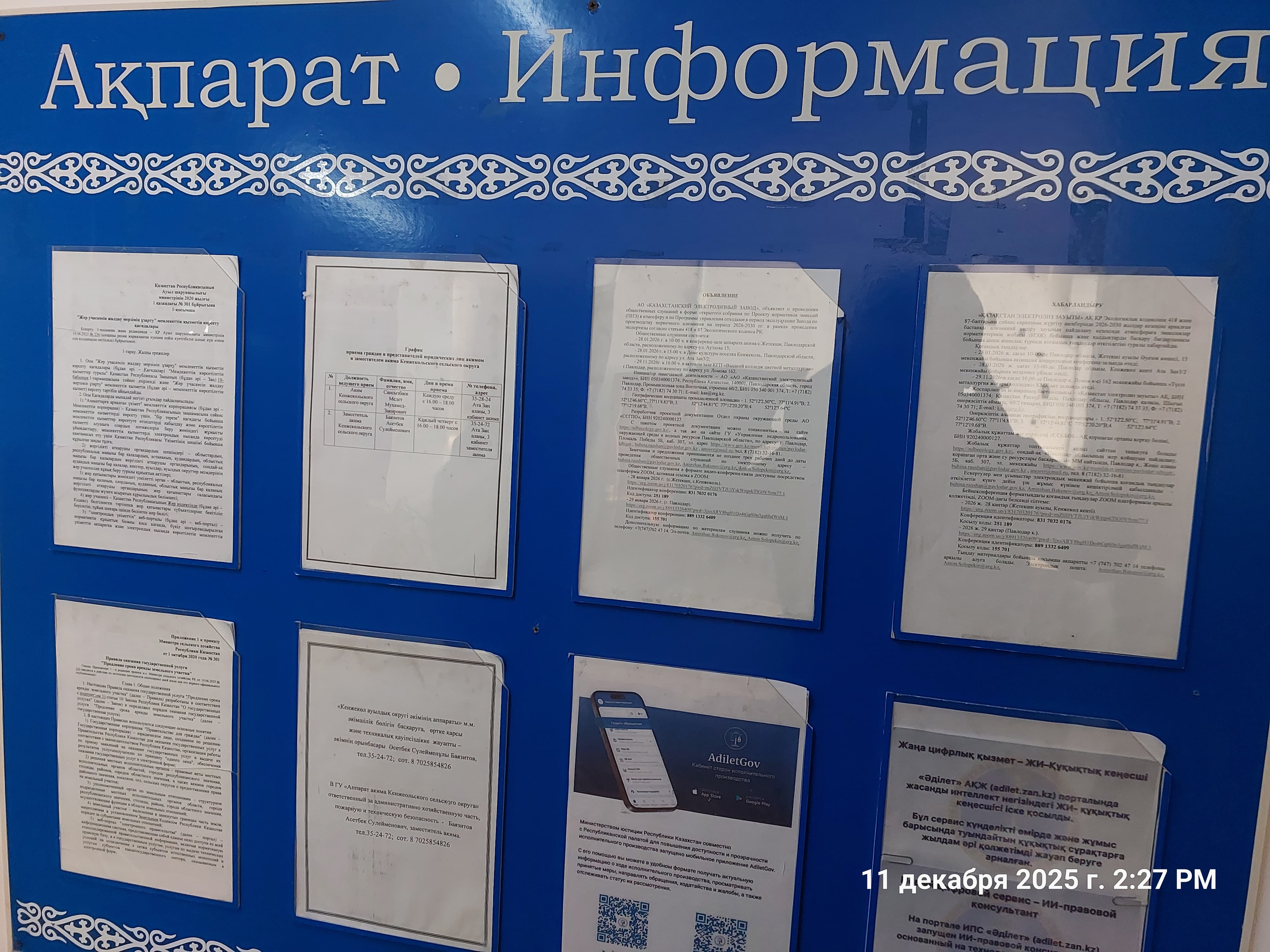 6.3. расположение мест, специально предназначенных для Размещения печатных объявлений (доски объявлений): Информационный стенд аппарата акима с. Жетекши, информационный стенд ГУ "Управление недропользования, окружающей среды и водных ресурсов Павлодарской области", на досках объявлений госучреждении