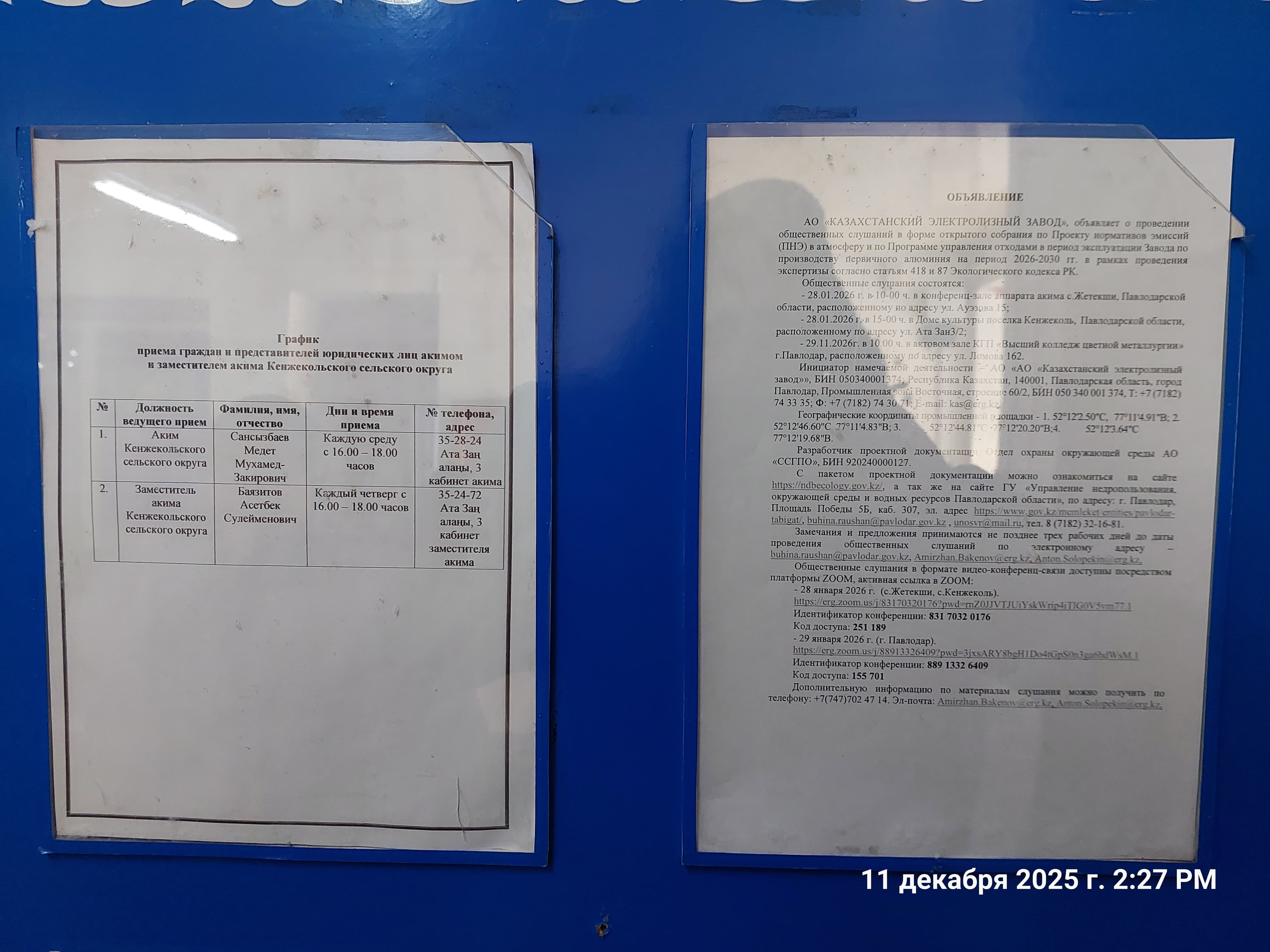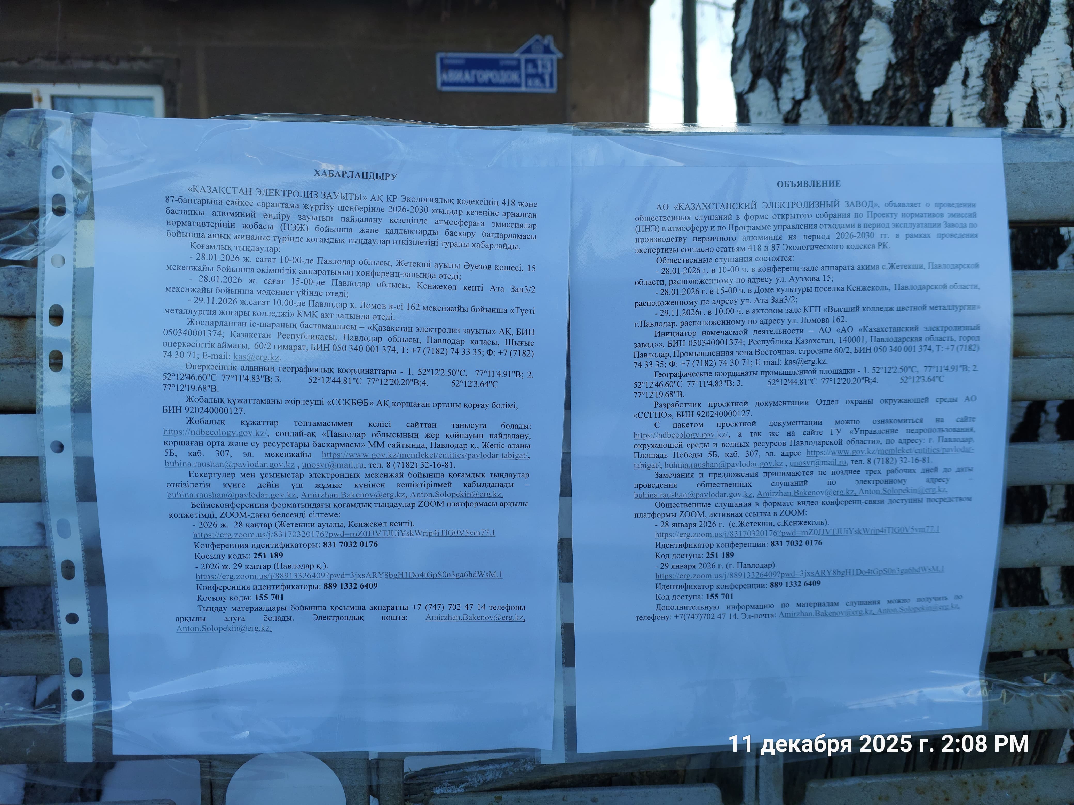 4. Повестка дня общественных слушаний: АО «КАЗАХСТАНСКИЙ ЭЛЕКТРОЛИЗНЫЙ ЗАВОД», сообщает о проведении общественных слушаний в форме открытого собрания по Проекту нормативов эмиссий (ПНЭ) в атмосферу и по Программе управления отходами в период эксплуатации Завода по производству первичного алюминия на период 2026-2030 гг. в рамках проведения экспертизы согласно статьям 418 и 87 Экологического кодекса РК.