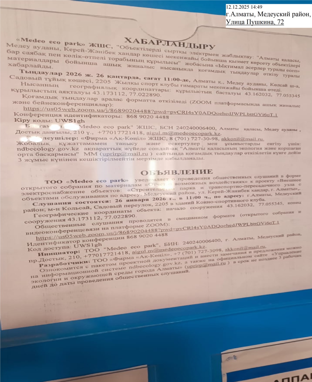 6.3. расположение мест, специально предназначенных для Размещения печатных объявлений (доски объявлений): г.Алматы, Медеуский район, Улица Пушкина, 72