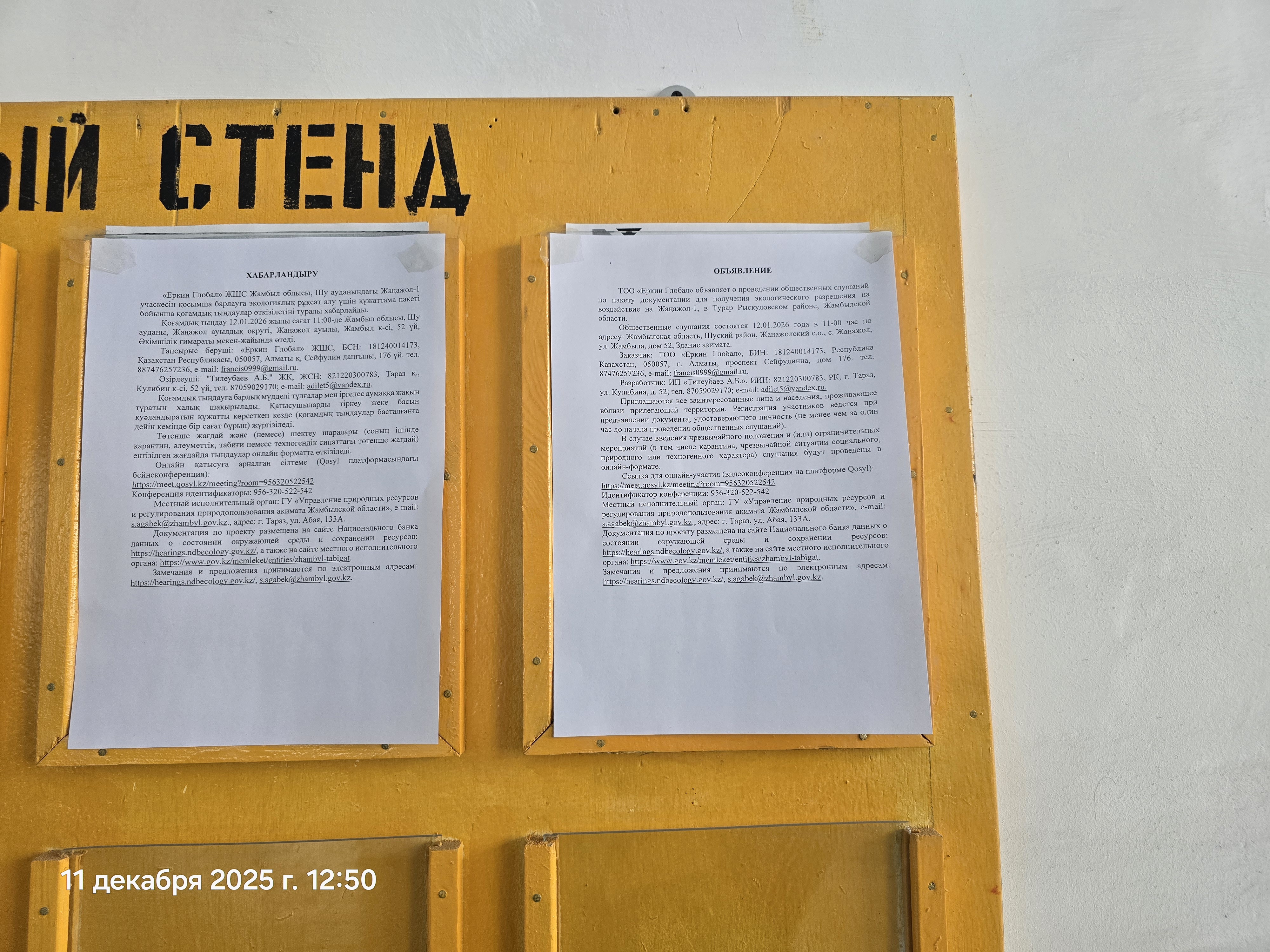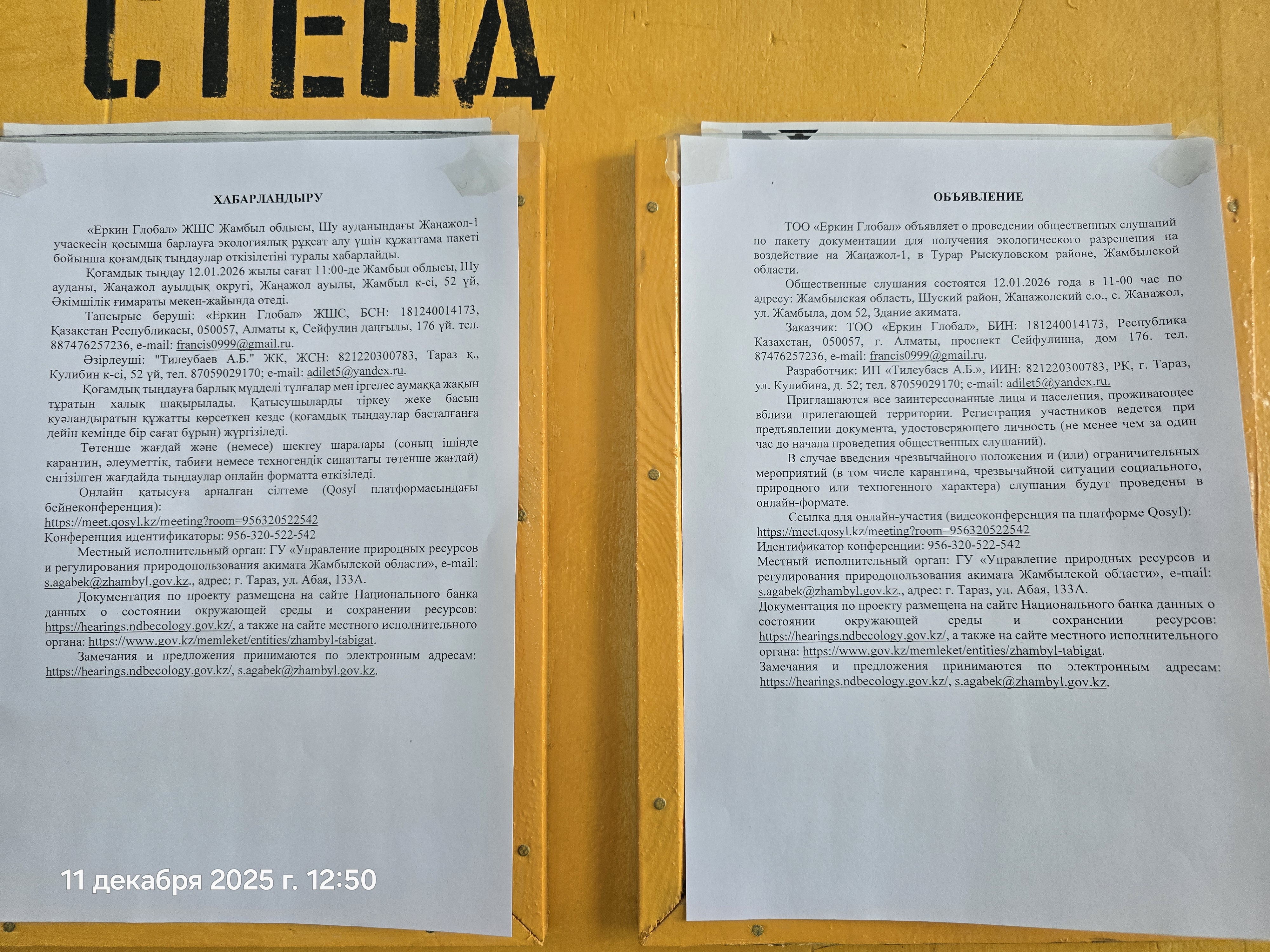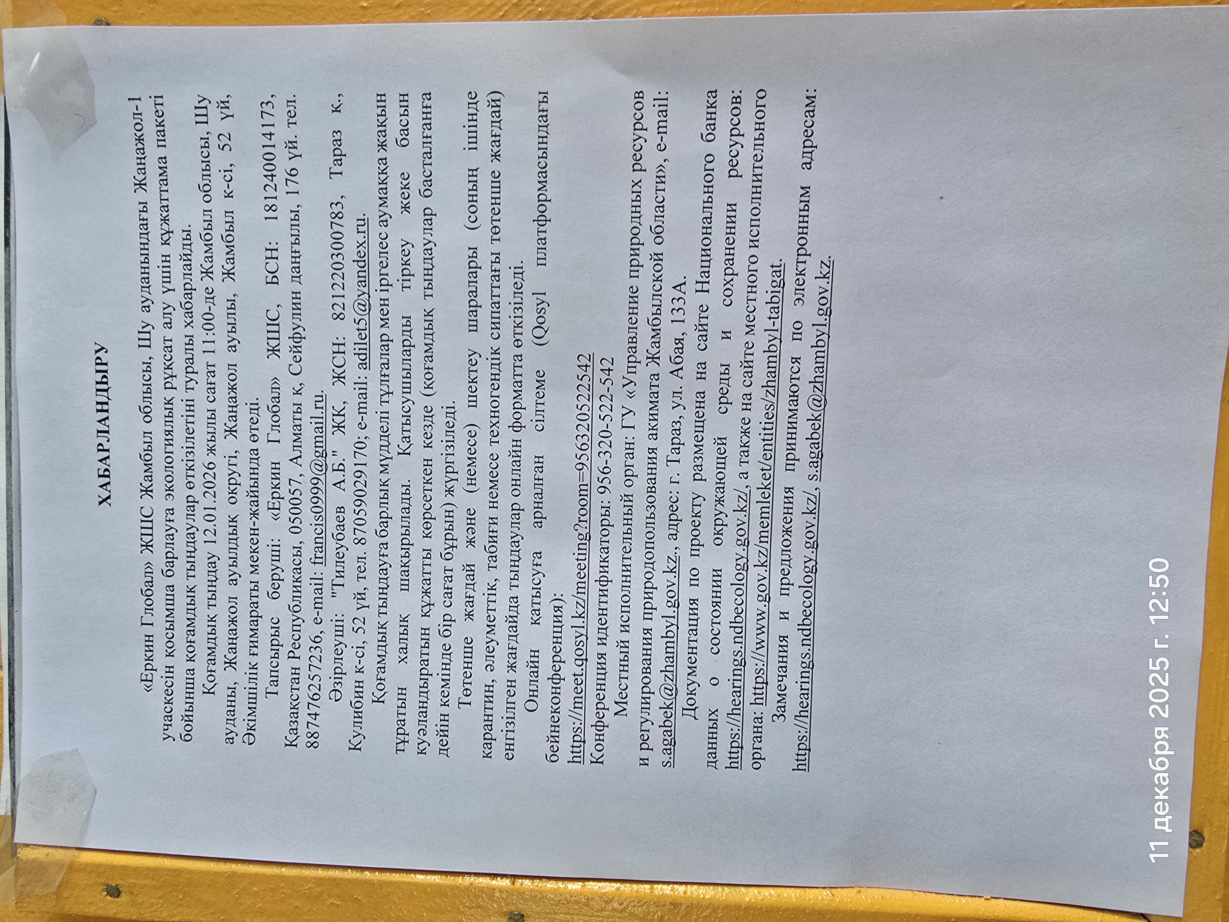 3. Общественные слушания организованны: Управление природных ресурсов и регулирования природопользования Жамбылской области, s.agabek@zhambyl.gov.kz,