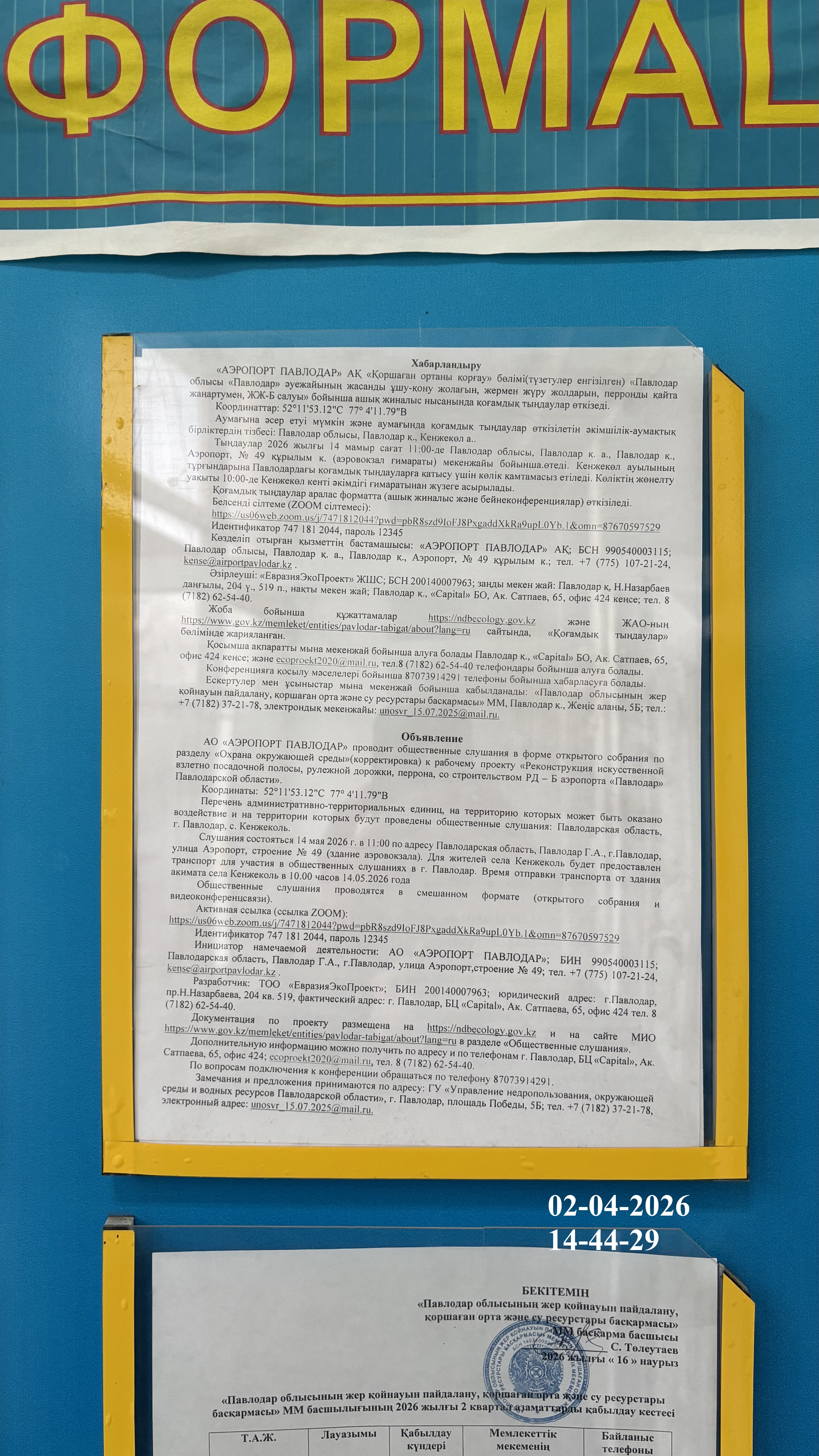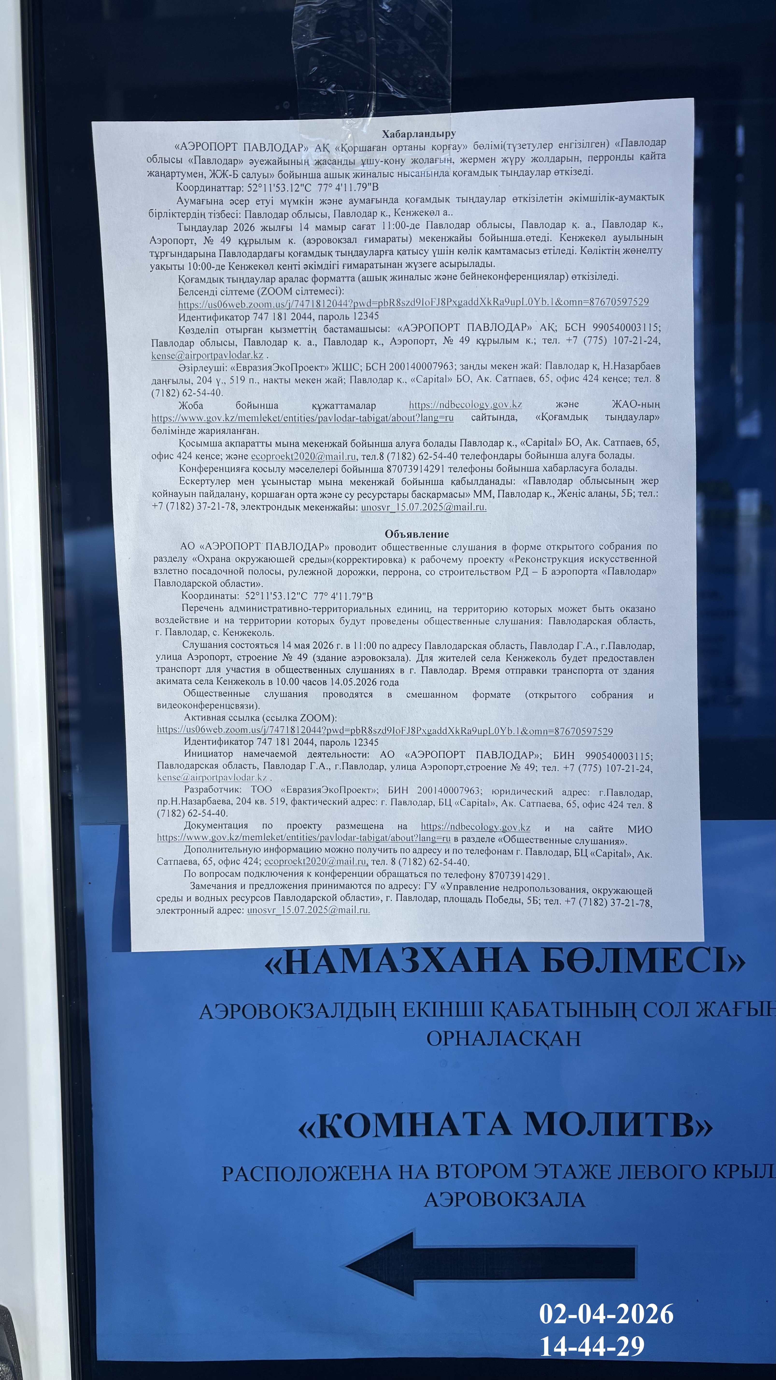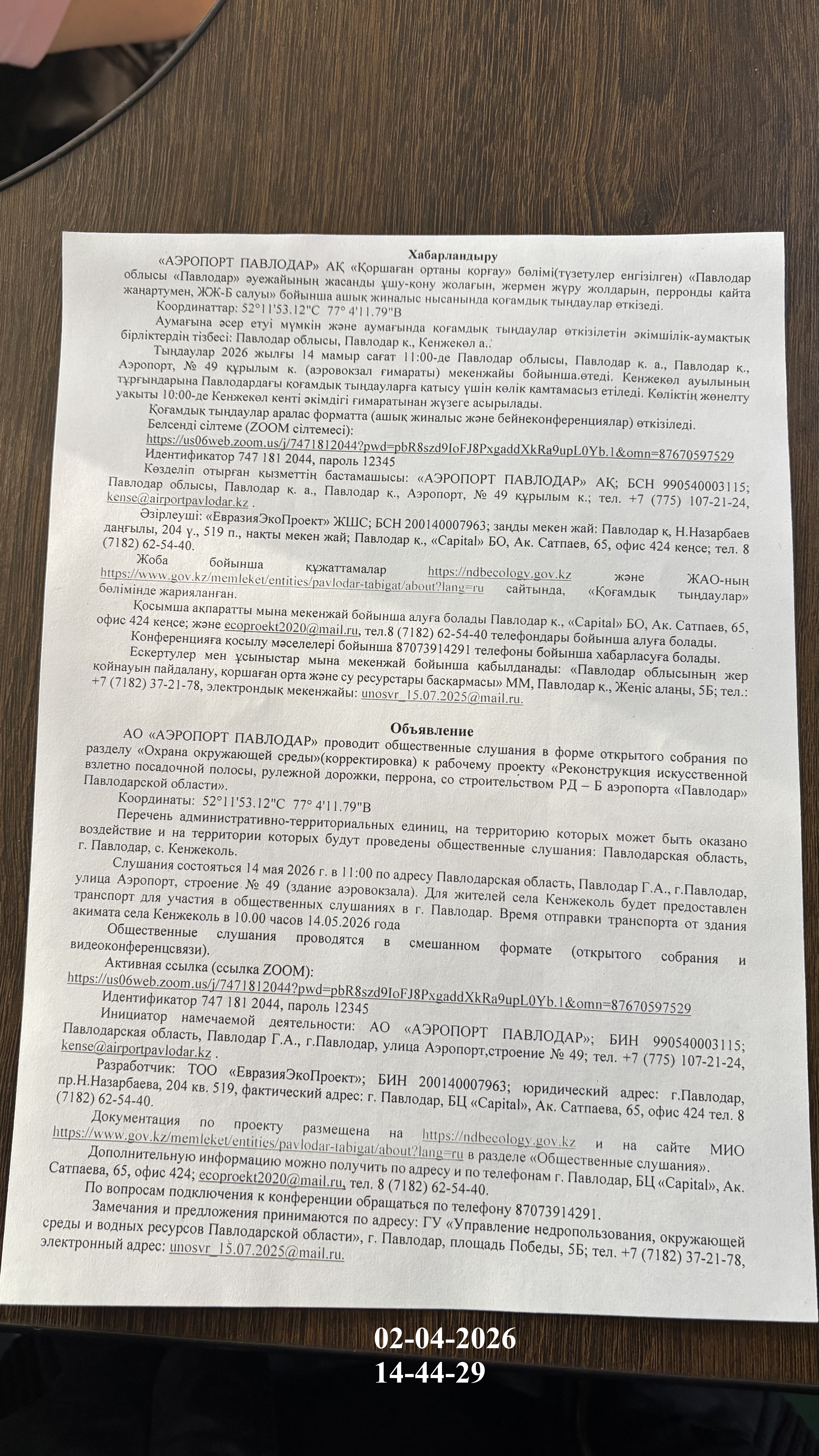 1.4. Описание для подключения к онлайн трансляции при прохождении общественного слушания: Тема: «Реконструкция искусственной взлетно-посадочной полосы, рулежной дорожки, перрона, со строительством РД – Б Аэропорта «Павлодар» Павлодарской области» (период СМР)(корректировка) Время: 14 мая 2026 11:00 AM Астана, Алматы Подключиться к конференции Zoom https://us06web.zoom.us/j/7471812044?pwd=pbR8szd9IoFJ8PxgaddXkRa9upL0Yb.1&omn=87670597529 Идентификатор конференции: 747 181 2044 Код доступа: 12345
