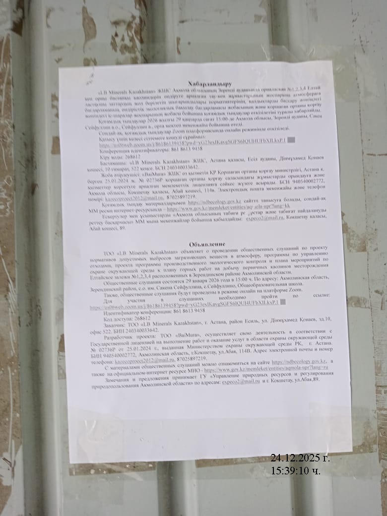 3. Общественные слушания организованны: Управление природных ресурсов и регулирования природопользования Акмолинской области, expeco@mail.ru,