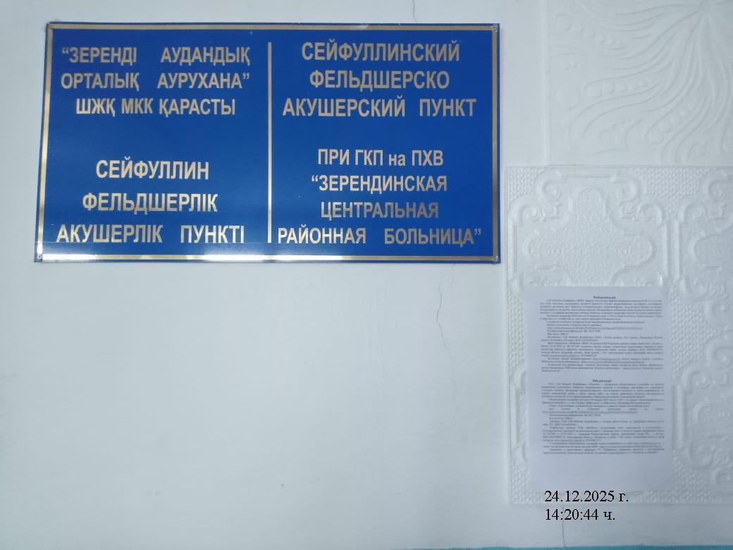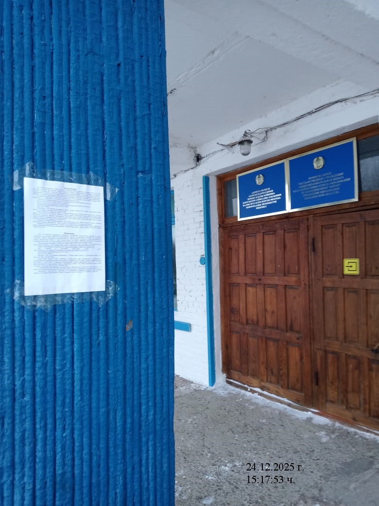 6.3. расположение мест, специально предназначенных для Размещения печатных объявлений (доски объявлений): Акмолинская область, Зерендинский район, с.о.им.Сакена Сейфуллина, с.Сейфуллино, акимат, стенды для объявлений
