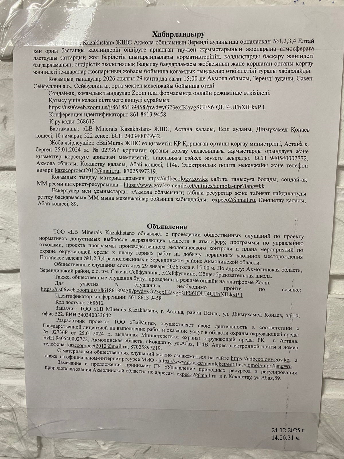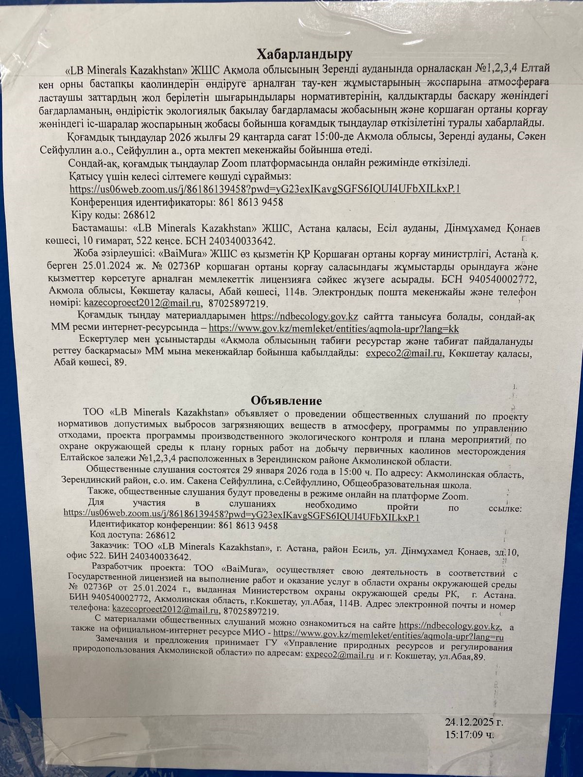 4. Повестка дня общественных слушаний: ТОО «LB Minerals Kazakhstan» намерено получить лицензию на добычу первичных каолинов Елтайского месторождения по Залежам №1,2,3,4 расположенных в Зерендинском районе Акмолинской области. Елтайское месторождение состоит из 4 залежей. Состояние запасов на 01.01.2024 год составляют: Залежь №1 по категории С1 – 10 841 тыс.м3; Залежь №2 по категории В – 4 896 тыс.м3, по категории С1 – 14 692 тыс.м3; Залежь №3 по категории В – 4 231 тыс.м3, по категории С1 – 11 877 тыс.м3; Залежь №4 по категории В – 2 982 тыс.м3, по категории С1 – 18 484 тыс.м3. Всего по месторождению на государственном балансе числятся по категориям А+В+С1 – 68 116 тыс.м3. Каолины Елтайского месторождения являются продуктом выветривания микроклинизированных гранитов и являются комплексным сырьем. ТОО «LB Minerals Kazakhstan» планирует строительство завода по обогащению каолина в Зерендинском районе Акмолинской области. Полезная толща (каолин) Елтайского месторождения будет использована на собственном заводе недропользователя. В административном отношении месторождение первичных каолинов Елтайское расположено на территории Зерендинского района Акмолинской области, в 45 км северо-западнее города Кокшетау, в 4-5 км к северо-западу от поселка Елтай, в 17 км от поселка Бирлестик. Ближайший водный объект – озеро Жолдыбай находится на расстоянии 17 км южнее месторождения, озеро имени Портного в 17 км восточнее месторождения, неподалеку от Алексеевского месторождения, река Чаглинка расположено в 29 км южнее месторождения Елтайское, объект не входит в водоохранную зону и полосу. Согласно заданию на проектирование годовая производительность карьера по полезному ископаемому составляет 150 тыс.м3-2025г, по 250 тыс.м3 – 2026-2034 гг . Годовой объем вскрыши 33,0 тыс.м3(2025-2034гг), объем снятия ПРС - 4,76 тыс.м3 (2025-2029гг). Количество рабочих дней в году – 360, с 7-ми дневной рабочей неделей, количество смен – 1, продолжительность смены 11 часов. Срок службы карьера составляет 10 лет. Вскрытие карьеров предусматривается траншеями внешнего заложения, что обусловлено размерами и глубиной залегания полезного ископаемого. Система разработки принята транспортная с перевозкой вскрыши во внешний отвал. В перспективе, по мере отработки карьеров, появится возможность отсыпки вскрышных пород в выработанное пространство, с целью их рекультивации.