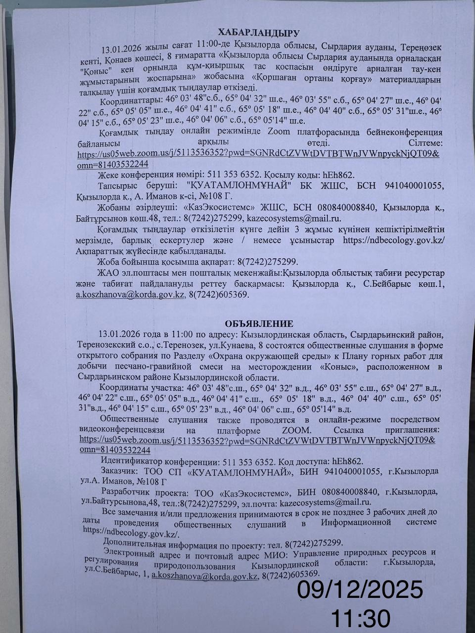 3. Общественные слушания организованны: Управление природных ресурсов и регулирования природопользования Кызылординской области, prd@korda.gov.kz 87242605362, 605369,