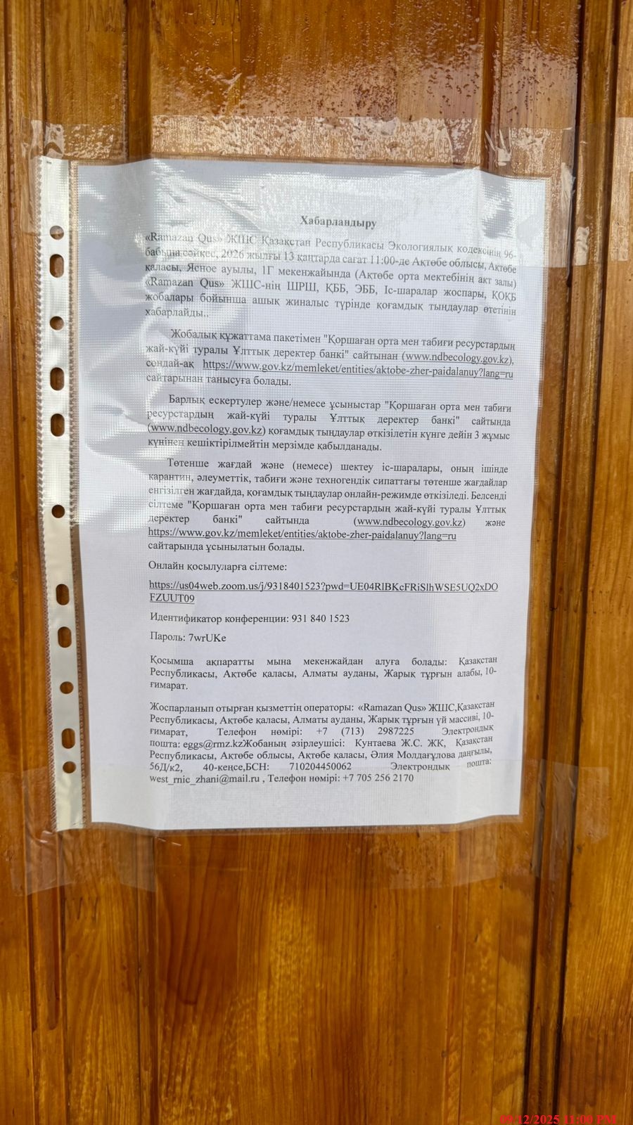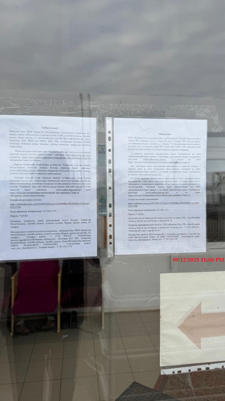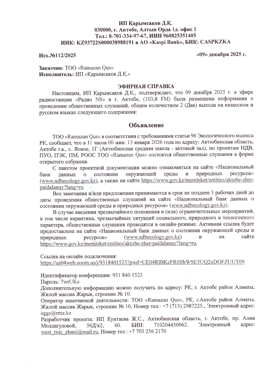 4. Повестка дня общественных слушаний: Наименование предприятия: ТОО «Ramazan Qus». Основной вид деятельности ТОО «Ramazan Qus» - производство яиц. Основной задачей птицефабрики является поставка в продажу качественных куриных яиц. В птичниках было установлено оборудование немецких и испанских производителей, которое позволило автоматизировать все технологические процессы. Месторасположение административного здания: РК, Актюбинская область, г.Актобе, Жилой массив Ясное, строение 10. Площадка предприятия располагается на территории действующего предприятия ТОО «Ramazan Qus» (бывший ТОО «ADM Investment») по адресу: Актюбинская область, г. Актобе, район Алматы, ЖМ Ясное, строение 10. Ближайшая жилая зона расположена от птицефабрики ТОО «Ramazan Qus» расположена на расстоянии 520 м в северо-западном направлении. По румбам от площадки расположены следующие объекты: • Север – пустырь; • Северо-восток, восток, юго-восток – Актюбинское водохранилище на расстоянии 500 м; • Юг – Садоводческий коллектив Птицевод на расстоянии 1000 м; • Юг-запад, запад – жилая зона на расстоянии более 900 м; • Северо-запад – жилая зона на расстоянии 520 м. По степени воздействия на окружающую среду, согласно Экологическому кодексу Республики Казахстан предприятие относится к I категории. Ссылка на онлайн подключения: https://us04web.zoom.us/j/9318401523?pwd=UE04RlBKcFRiSlhWSE5UQ2xDOFZUUT09 Идентификатор конференции: 931 840 1523 Пароль: 7wrUKe