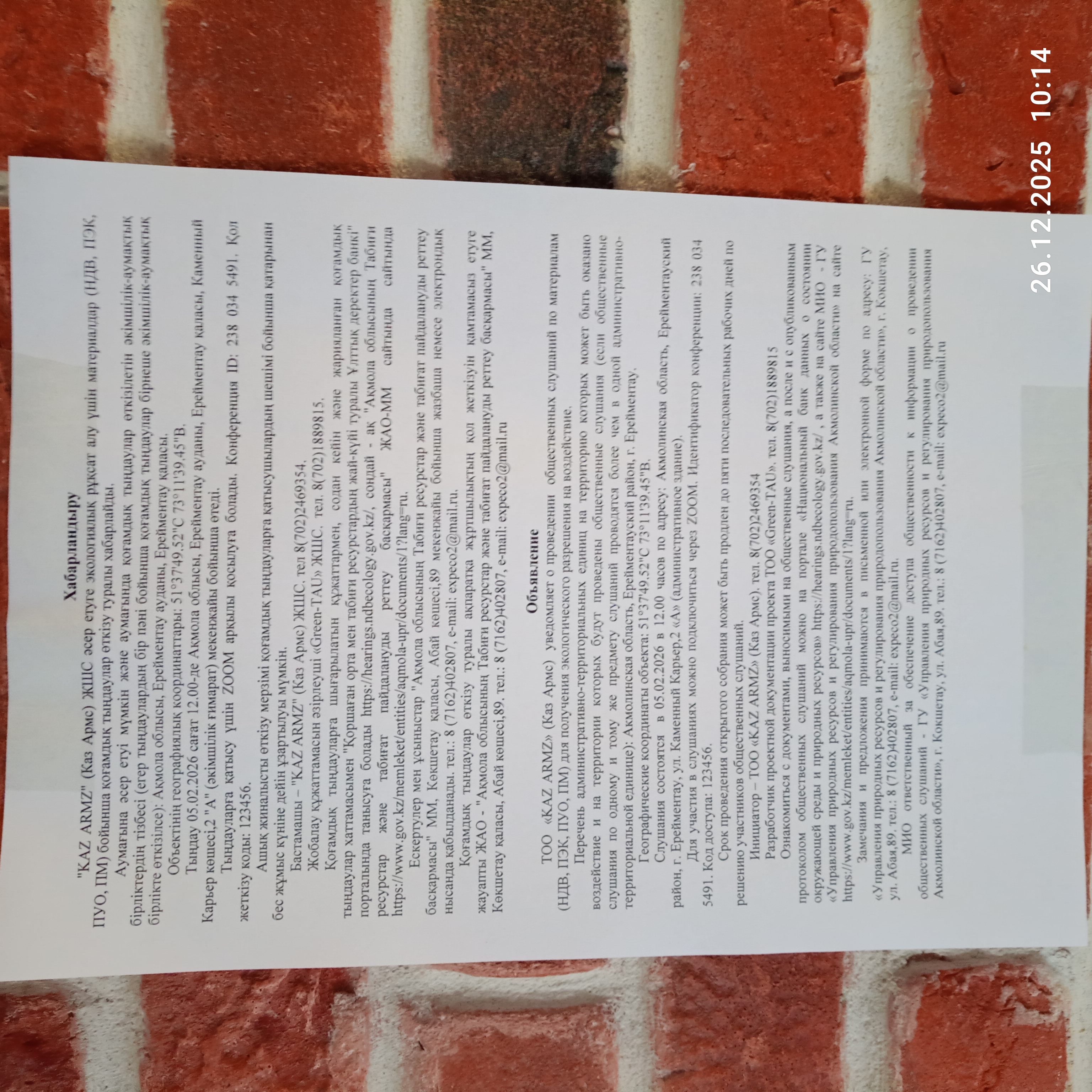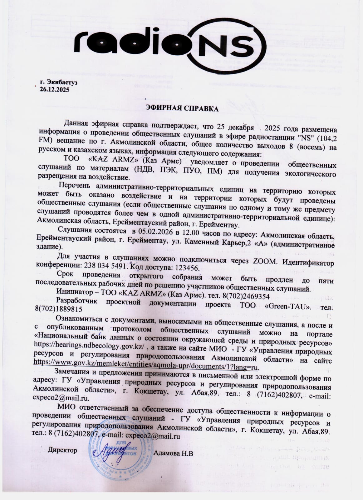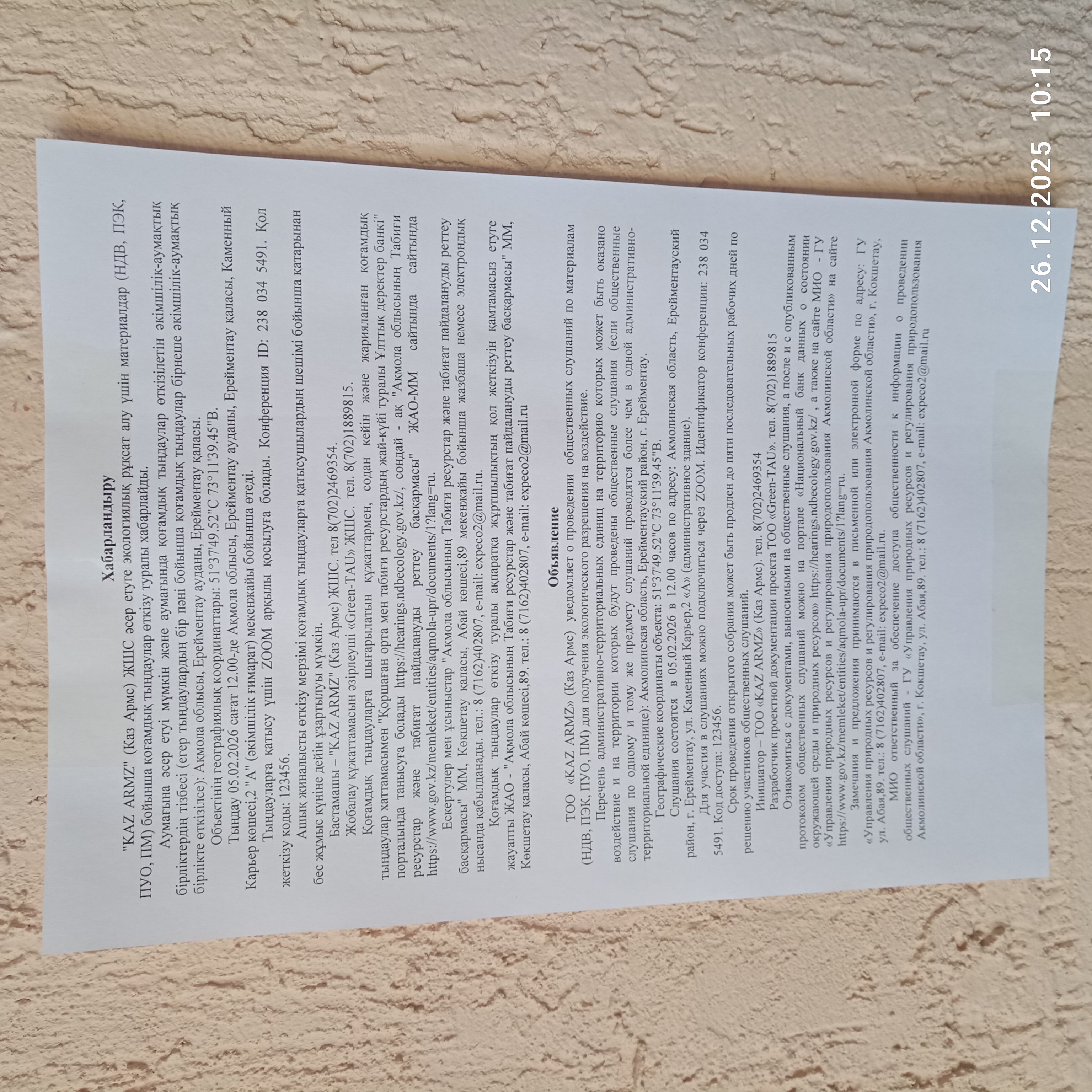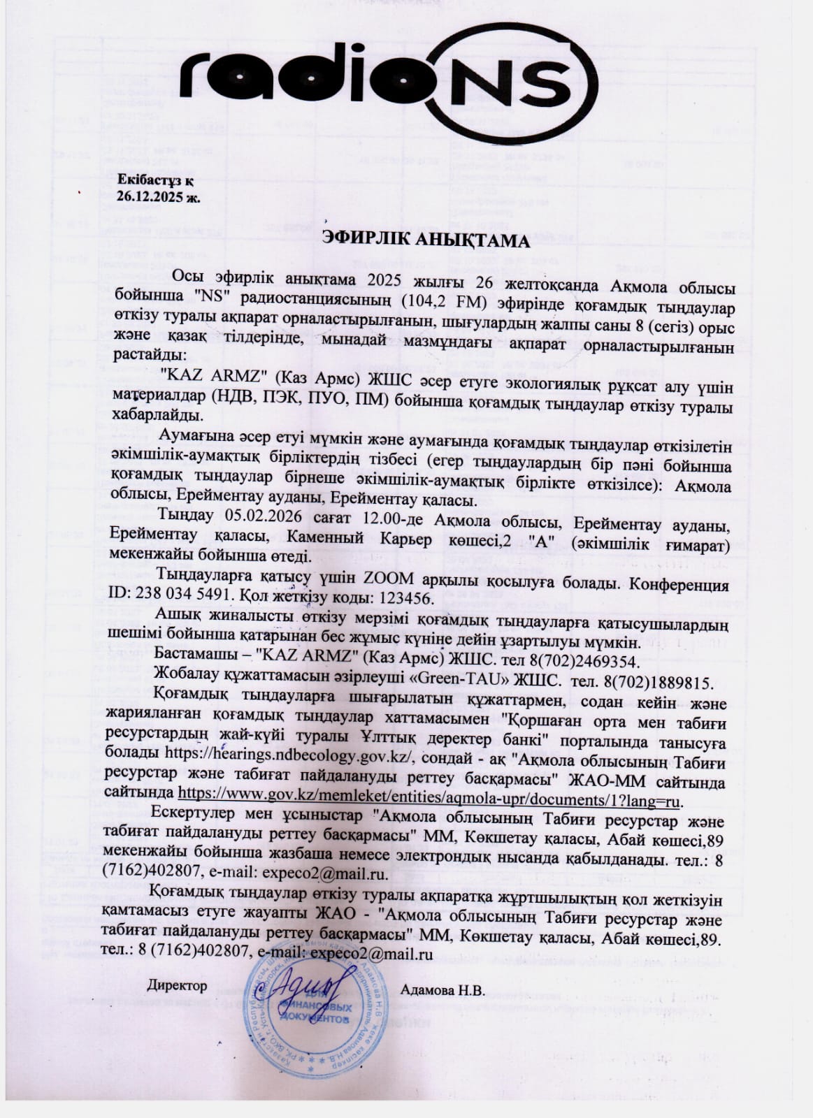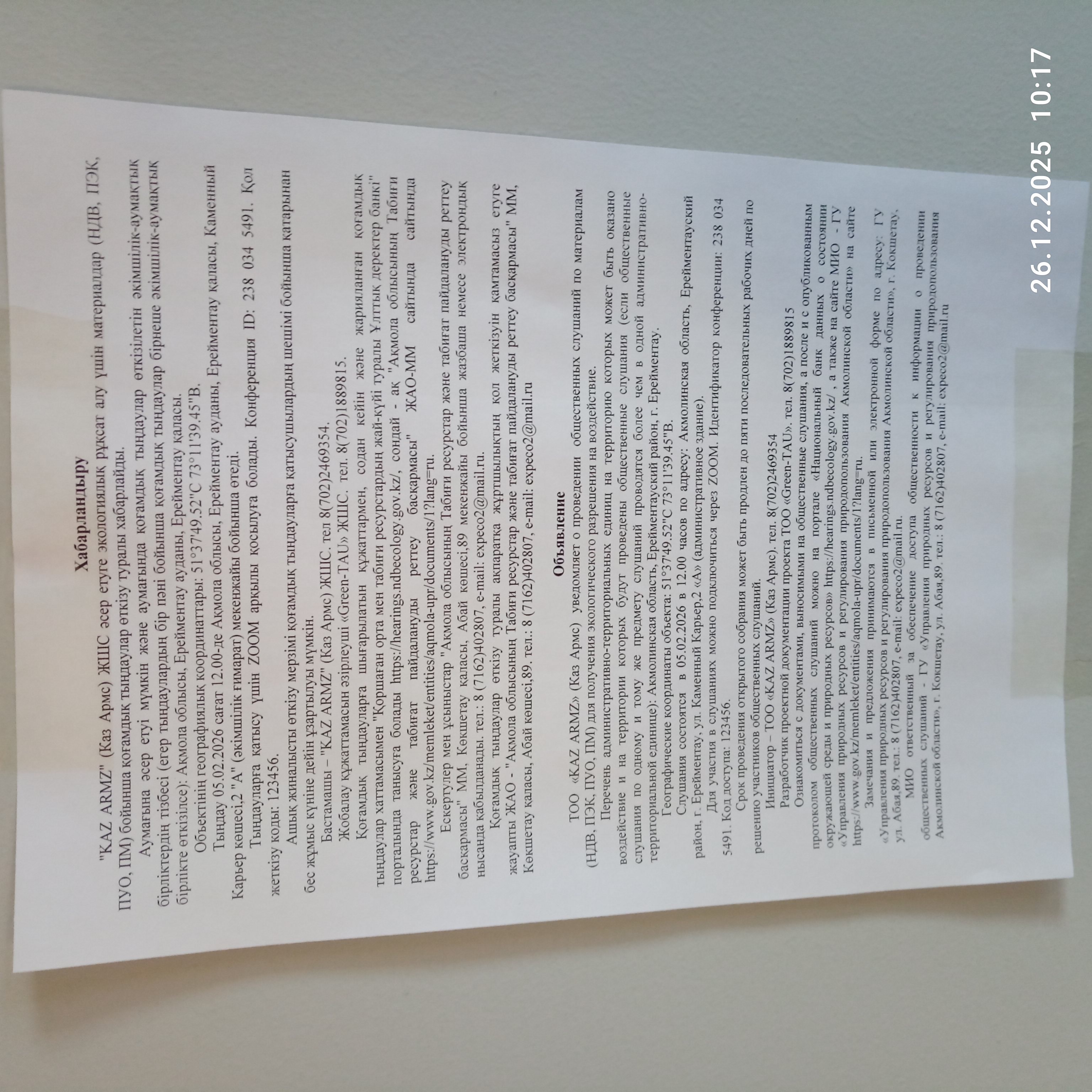 3. Общественные слушания организованны: Управление природных ресурсов и регулирования природопользования Акмолинской области, expeco@mail.ru,