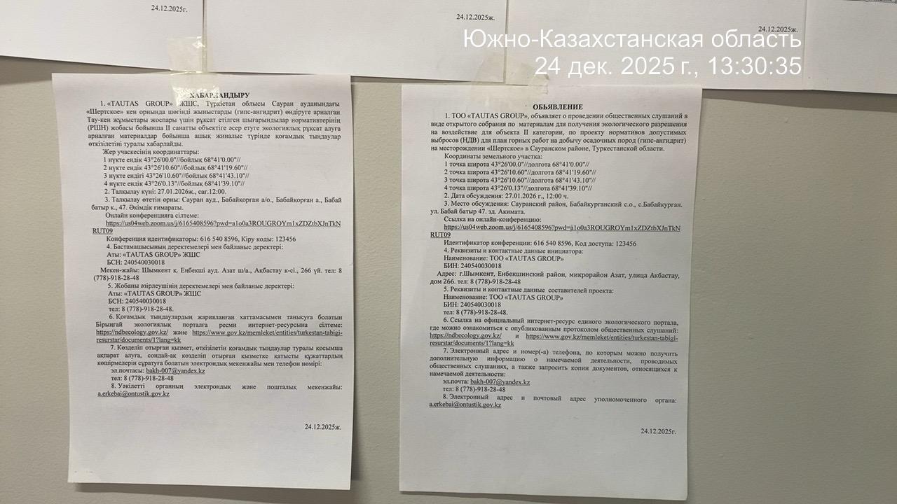 3. Общественные слушания организованны: Управление природных ресурсов и регулирования природопользования Туркестанской области, a.erkebai@ontustik.gov.kz,