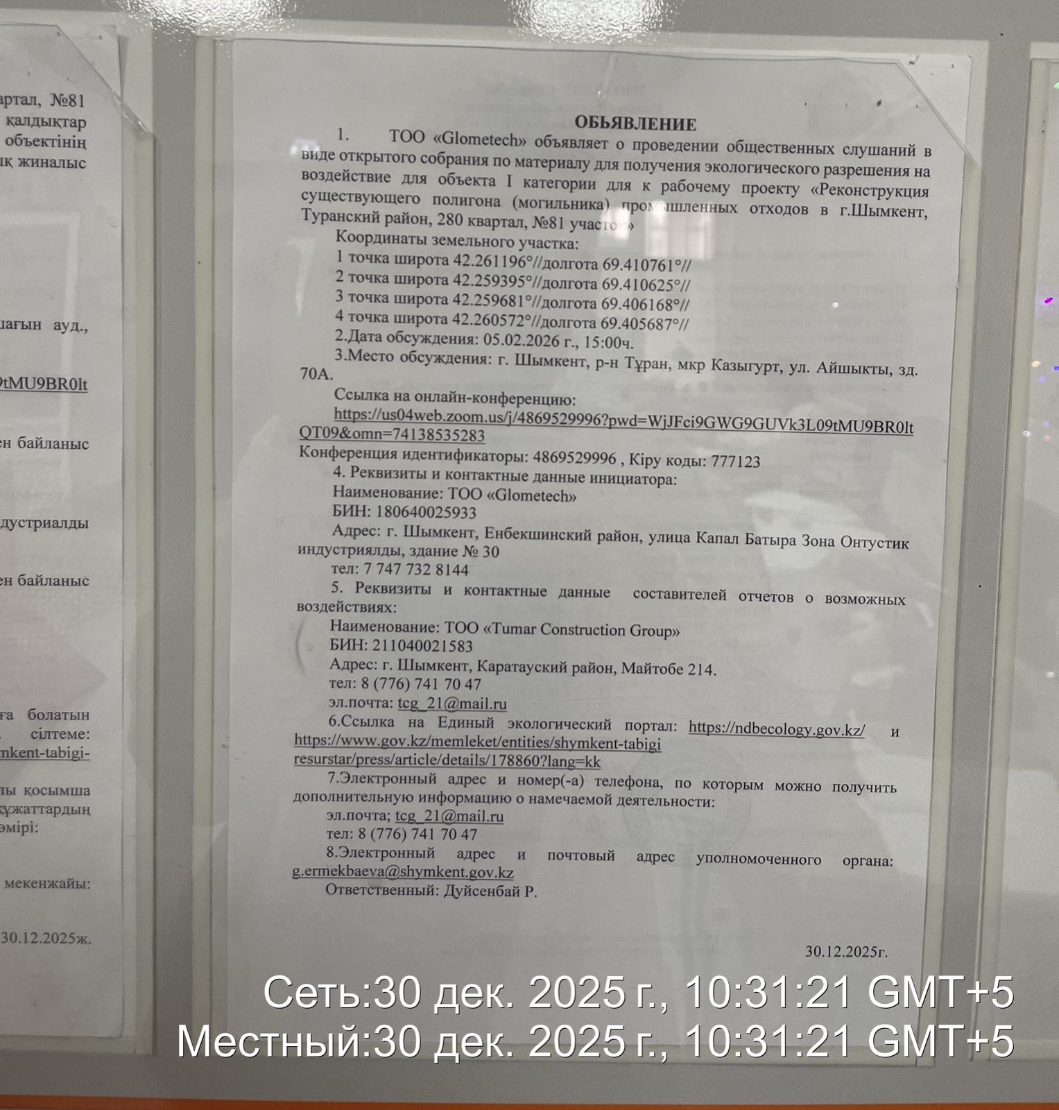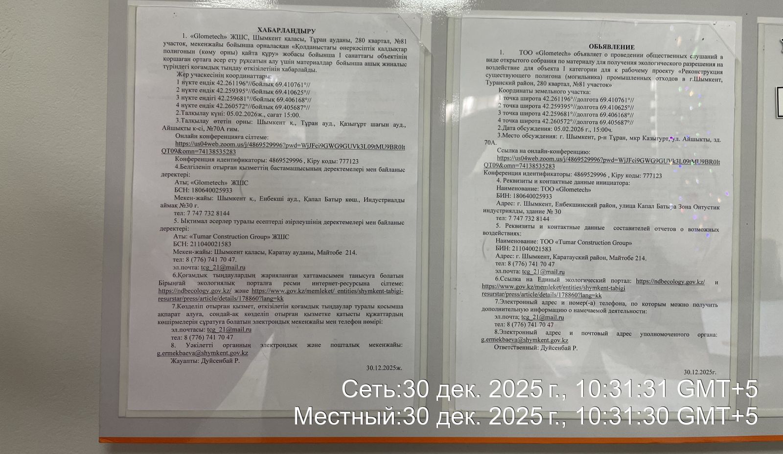 4. Повестка дня общественных слушаний: Полигон по захоронению промышленных отходов расположен в юго-западной части г. Шымкент, вдоль автодороги Шымкент – ГНПС «Шымкент». Участок полигона площадью 6,294 га (кадастровый номер 19-295-110-081) со всех сторон граничит с незастроенными сельскохозяйственными землями. Проектная документация по объекту «Реконструкция существующего полигона (могильника) промышленных отходов в г. Шымкент» предусматривает строительство новой карты №5 на территории действующего полигона. Реализация данного проекта позволит продлить срок эксплуатации полигона. С 4 апреля 2022 года полигон эксплуатируется на основании разрешения KZ14VCZ01765151 по карте №4. В настоящее время планируется строительство карты №5 для расширения площади хранения отходов, что повысит экологическую безопасность объекта. На огражденной и охраняемой территории площадью 6,294 га расположены: • законсервированная карта №1 емкостью 21 400 м³ с арсенатом кальция; • заполненная карта №2 емкостью 16 071 м³ с арсенатом кальция, закисленным грунтом и мышьяксодержащим кеком; согласно требованиям СП РК 1.04-109-2013 карта изолирована уплотнённым слоем местного грунта толщиной 0,5 м с добавлением 10% растительного грунта в верхнем слое толщиной 0,2 м; • заполненная карта №3 в виде прямоугольного углубления емкостью 40 000 м³, с железобетонными стенами и противофильтрационным экраном; согласно требованиям СН РК 1.04-01-2013 карта изолирована уплотнённым слоем местного грунта толщиной 0,5 м с добавлением 10% растительного грунта в верхнем слое толщиной 0,2 м; • действующая карта №4 емкостью 130 000 м³ с противофильтрационным экраном; • пруд-испаритель в виде углубления с противофильтрационным экраном; • эксплуатационные дороги; • пост мойки колёс грузового автотранспорта; • домик охраны; • парковка для легковых автомобилей; • система ливневой канализации. После заполнения карты №4 оператор объекта планирует выполнить рекультивацию нарушенных земель по картам №2, №3 и №4 на основании отдельного проекта рекультивации. В настоящее время планируется строительство карты №5 для расширения площади хранения отходов, что повысит экологическую безопасность полигона, а также перенос пруда-испарителя. Полигон (могильник) по захоронению промышленных отходов предназначен для минимизации негативного воздействия промышленных, в том числе токсичных, отходов на окружающую среду путём их долговременного хранения или захоронения. Карта №5 проектируется на месте существующего пруда-испарителя, который в свою очередь будет перенесён на участок, расположенный к югу от карты №2. Необходимость переноса обусловлена тем, что конструкция действующего пруда-испарителя устарела и не соответствует установленным требованиям (в частности, отсутствует необходимое изоляционное покрытие). Проектными материалами предусмотрено: • проектируемая карта №5 объёмом 138 888 м³, глубиной 20 м, имеет форму пятиугольника; её размеры по верху — 139,9 × 72,0 × 71,7 × 72,7 × 47,0 м, по низу — 115,9 × 48,0 × 57,6 × 62,2 × 26,6 м; • пруд-испаритель объёмом 6 436 м³ и глубиной 3 м, имеет Г-образную форму; размеры по верху — 80,0 × 33,3 × 24,2 × 52,0 × 105,6 × 12,2 м, по низу — 80,3 × 33,5 × 20,0 × 48,0 × 102,0 × 8,4 м. При этом увеличение проектной мощности существующего полигона не предусматривается. Проектная мощность остаётся неизменной и составляет: — по мышьяксодержа