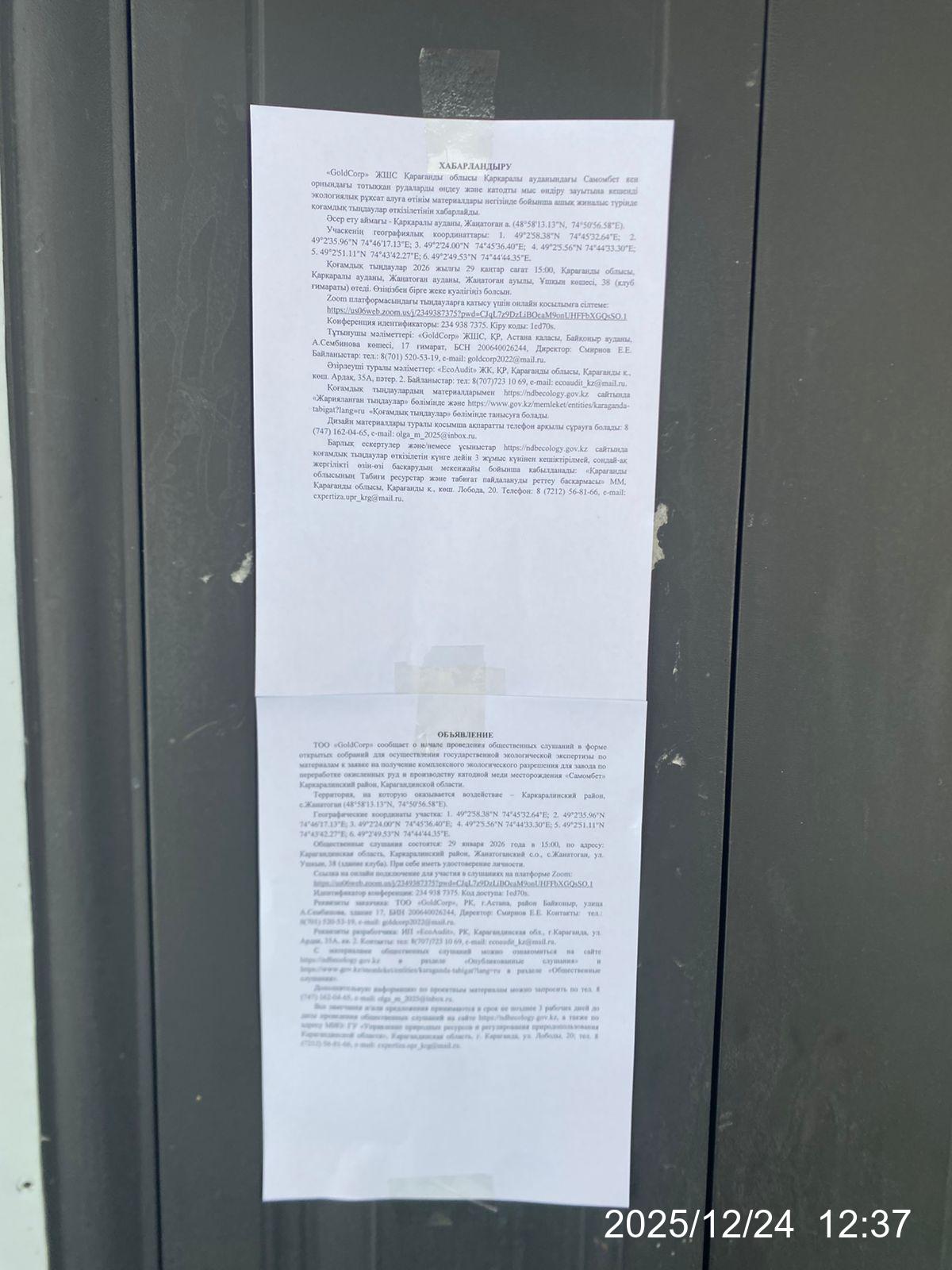 1.2. Место проведения: Карагандинская область, Каркаралинский район, Жанатоганский с.о., с.Жанатоган, ул. Ушкын, 38 (здание клуба). Ссылка на онлайн подключение для участия в слушаниях на платформе Zoom: https://us06web.zoom.us/j/2349387375?pwd=CJqL7z9DzLiBOeaM9onUHFFbXGQsSO.1 Идентификатор конференции: 234 938 7375. Код доступа: 1ed70s
