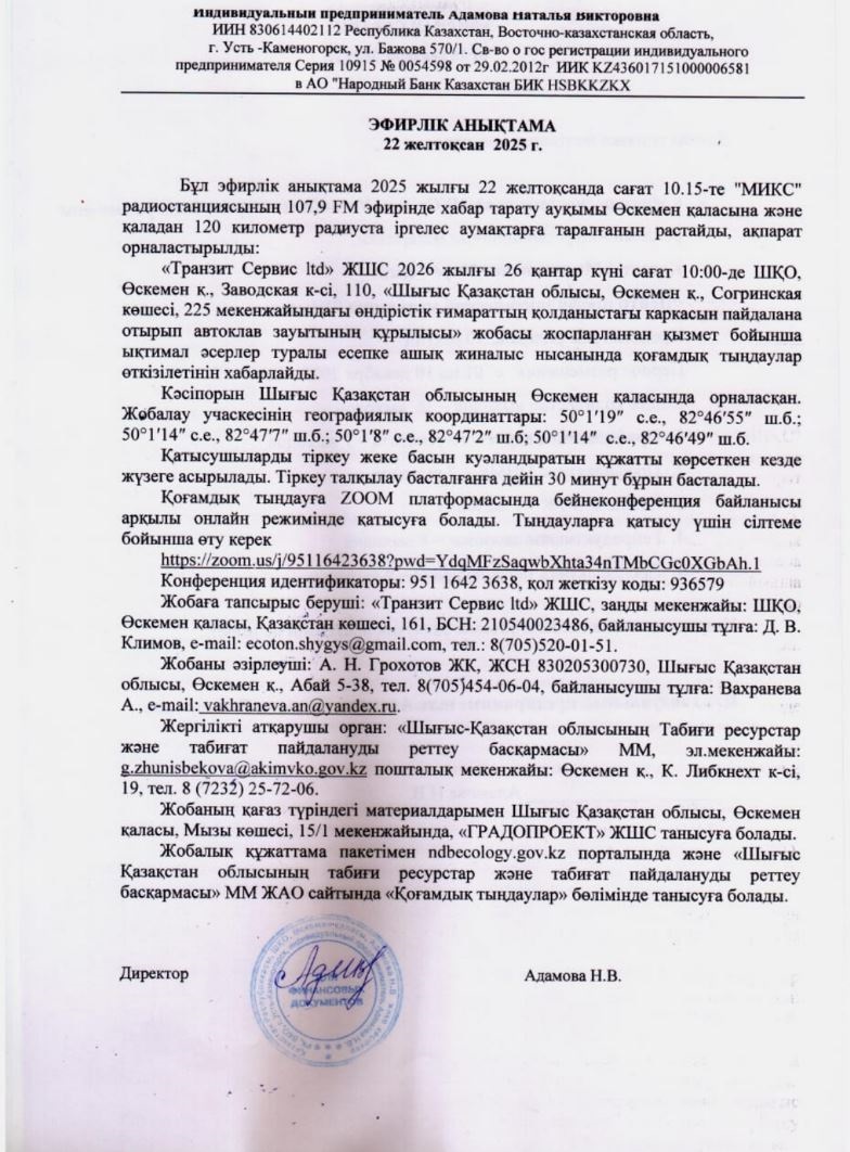 3. Общественные слушания организованны: Управление природных ресурсов и регулирования природопользования Восточно-Казахстанской области, g.zhunisbekova@akimvko.gov.kz,