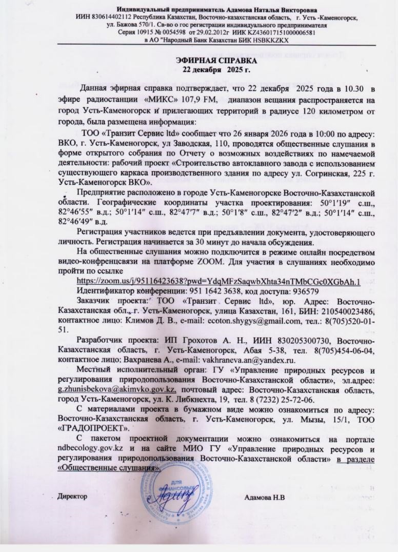 4. Повестка дня общественных слушаний: ТОО «Транзит Сервис ltd» планирует строительство автоклавного завода с использованием существующего каркаса производственного здания по адресу ул. Согринская, 225 г. Усть-Каменогорск ВКО. Завод будет выпускать газобетон автоклавного твердения в количестве 150 000 м³/год, 435 м³/сут. Основным сырьем при производстве газобетона на проектируемом заводе является золошлам Согринской ТЭЦ. В качестве резервного сырья предусматривается использование песка. Помимо золошлама и песка сырьем для производства газоблоков является цемент, гипс, известь и алюминиевая паста. Цемент поставляется автоцементовозами, пневмонасосом перекачивается в накопительные силосы. Из них по необходимости цемент перекачивается в расходный бункер, а при длительном хранении производится перекачивание цемента из одного силоса в другой для предотвращения слёживаемости. Комовая известь и гипс поставляются навалом автотранспортом и разгружаются на закрытом складе сыпучих материалов. Со склада известь и гипс отгружаются фронтальным погрузчиком, в помещение цеха, где они загружаются в приемный бункер мельницы сухого помола, измельчаются и закрытым спиральным (шнековым) транспортером, передаются на ковшовый элеватор (норию), с которого распределяются в расходные бункеры извести и гипса при помощи шнекового транспортера. Подача гипса и извести осуществляется поочередно, расходные бункеры могут менять назначение хранения материалов. Приемный бункер шаровой мельницы сухого помола и транспортер оборудованы аспирацией. Запыленный воздух направляется в импульсный пылеуловитель LDMS-50, откуда очищенный воздух и уловленная пыль возвращаются в мельницу и на транспортер, выброс загрязняющих веществ от участка отсутствует. Алюминиевая пудра поступает в герметичных контейнерах на склад алюминиевой пудры. Со склада контейнеры доставляются в помещение главного смесителя, где они вскрываются и заряжаются в автоматизированную установку, в которой пудра смешивается с раствором ПАВ и образуется алюминиевая суспензия. Приготовление блоков начинается со смешивания компонентов в смесителе. Цемент, гипс и известь подаются дозирующими шнековыми транспортерами из расходных бункеров. Золошлам или песчаный шлам, вода и обратный шлам подаются насосами. Водная суспензия алюминиевой пудры подается пневматически по трубам. Заливка ячеисто-бетонной смеси осуществляется в формы, которые заранее смазываются смесью отработанного масла с водой в соотношении 1:4. В формах смесь созревает и отстаивается, затем подается на резку, резка осуществляется с помощью струн. Поддон с разрезанным массивом перемещается на автоклавную тележку, на которой закатывается в автоклав, где производится термообработка массива. Освобождающийся отработанный пар и конденсат передается в аккумулятор отработанного пара и отводится на участок регенерации тепла. После термообработки блоки разделяются, укладываются на паллеты и упаковываются, а затем транспортируются на склад готовой продукции. Освободившиеся поддоны очищаются в щёточной машине и направляются на повторную загрузку, либо на склад.