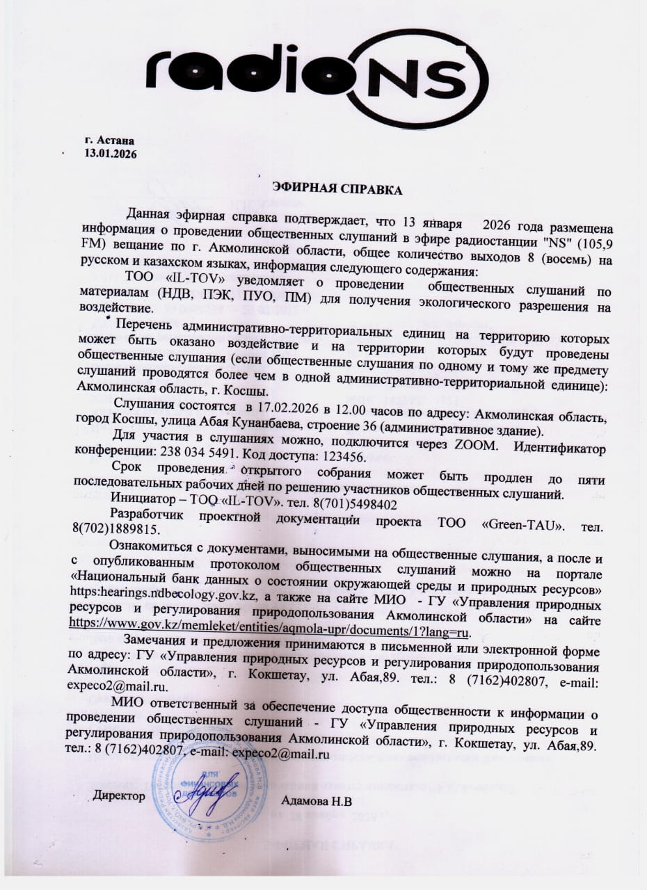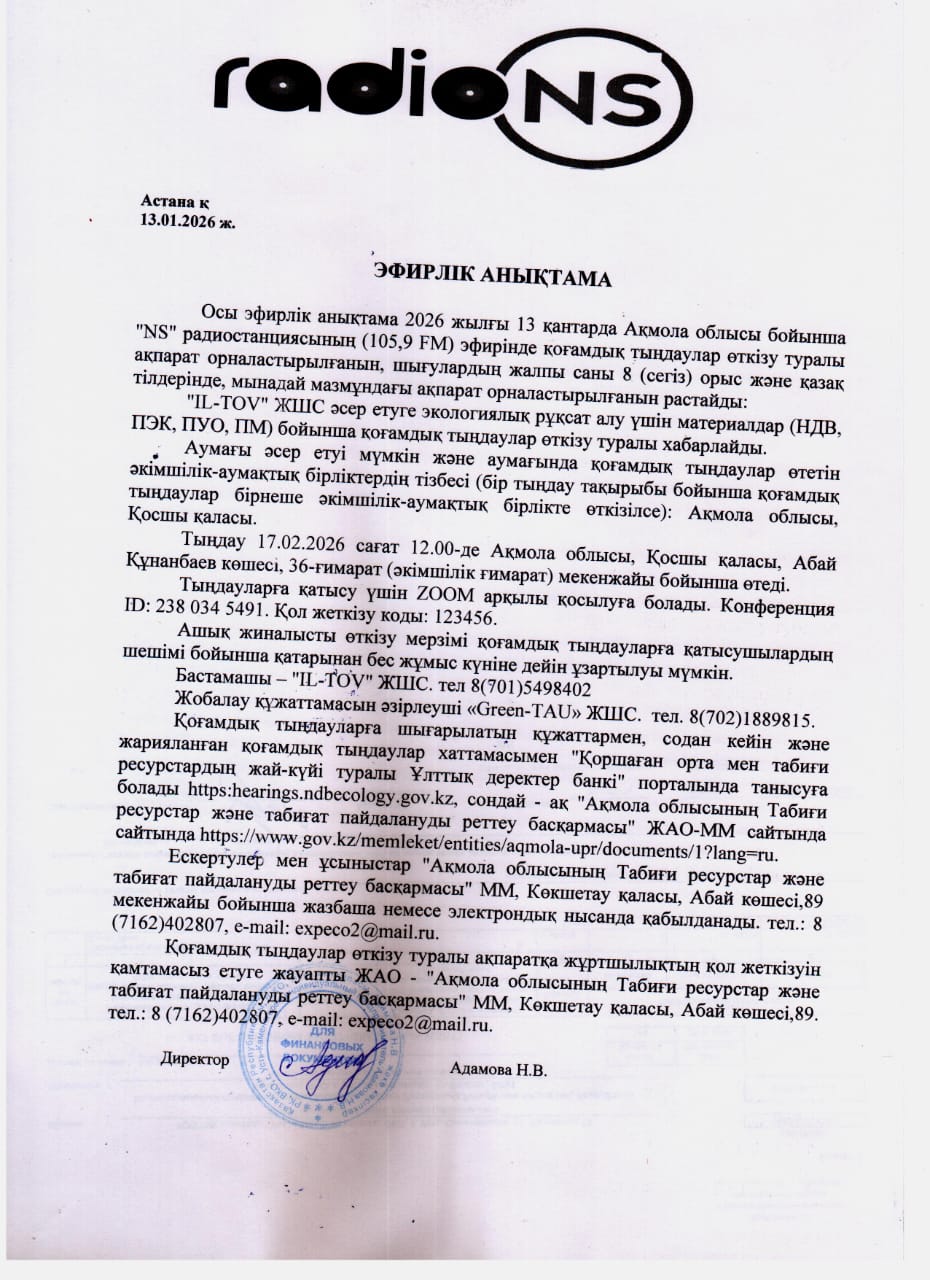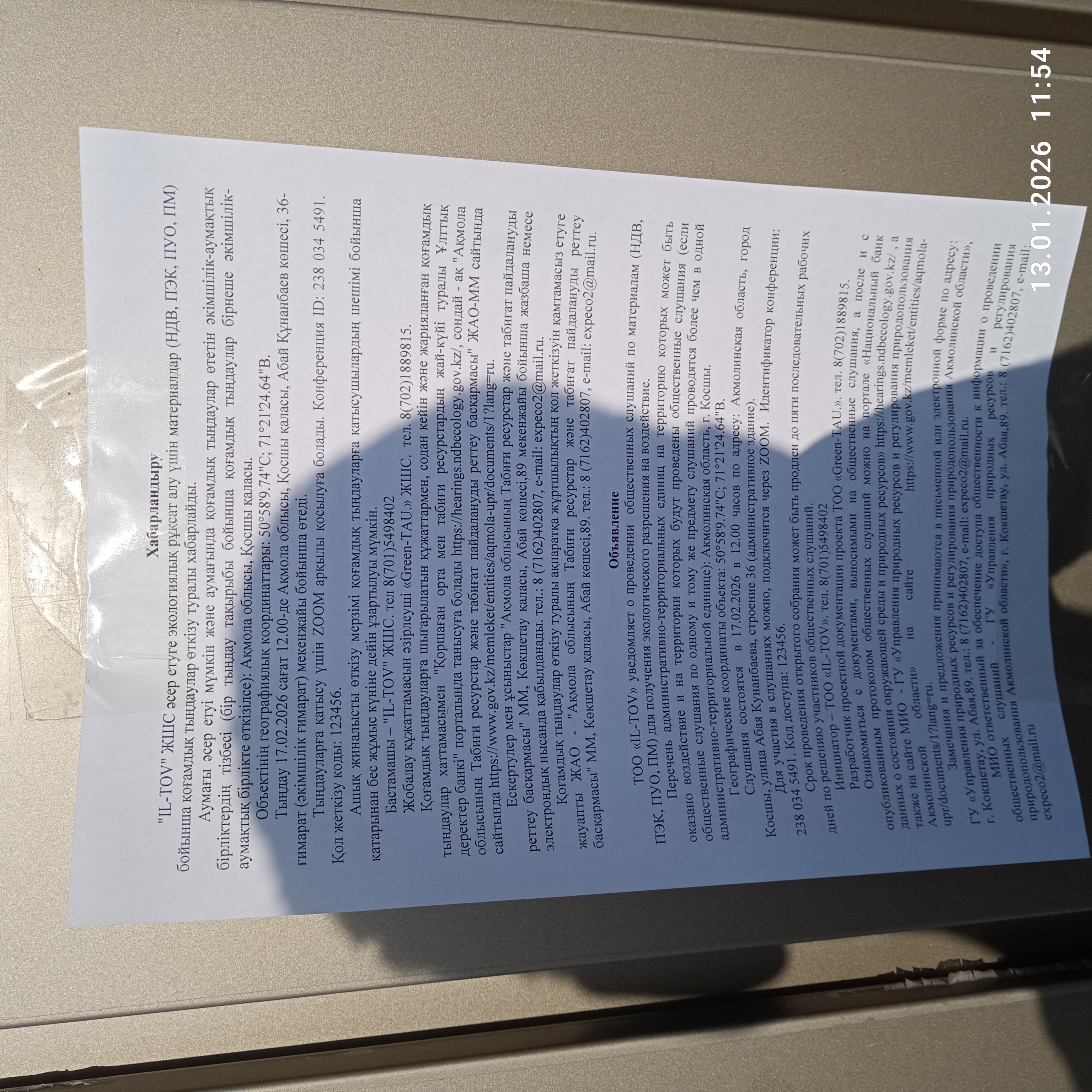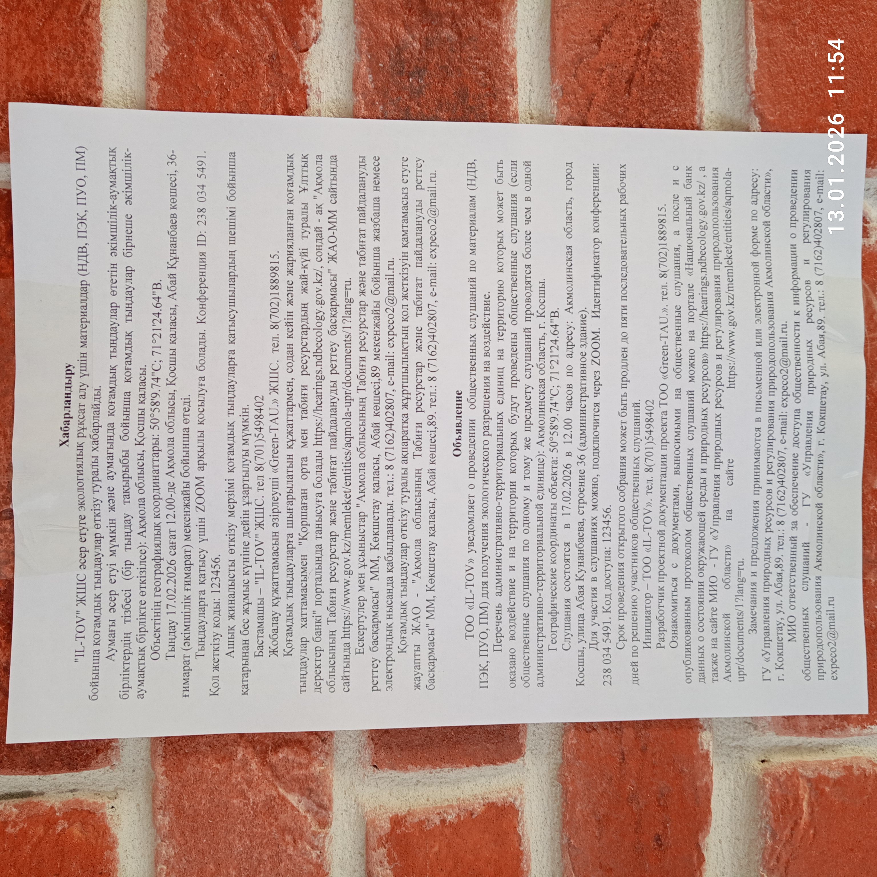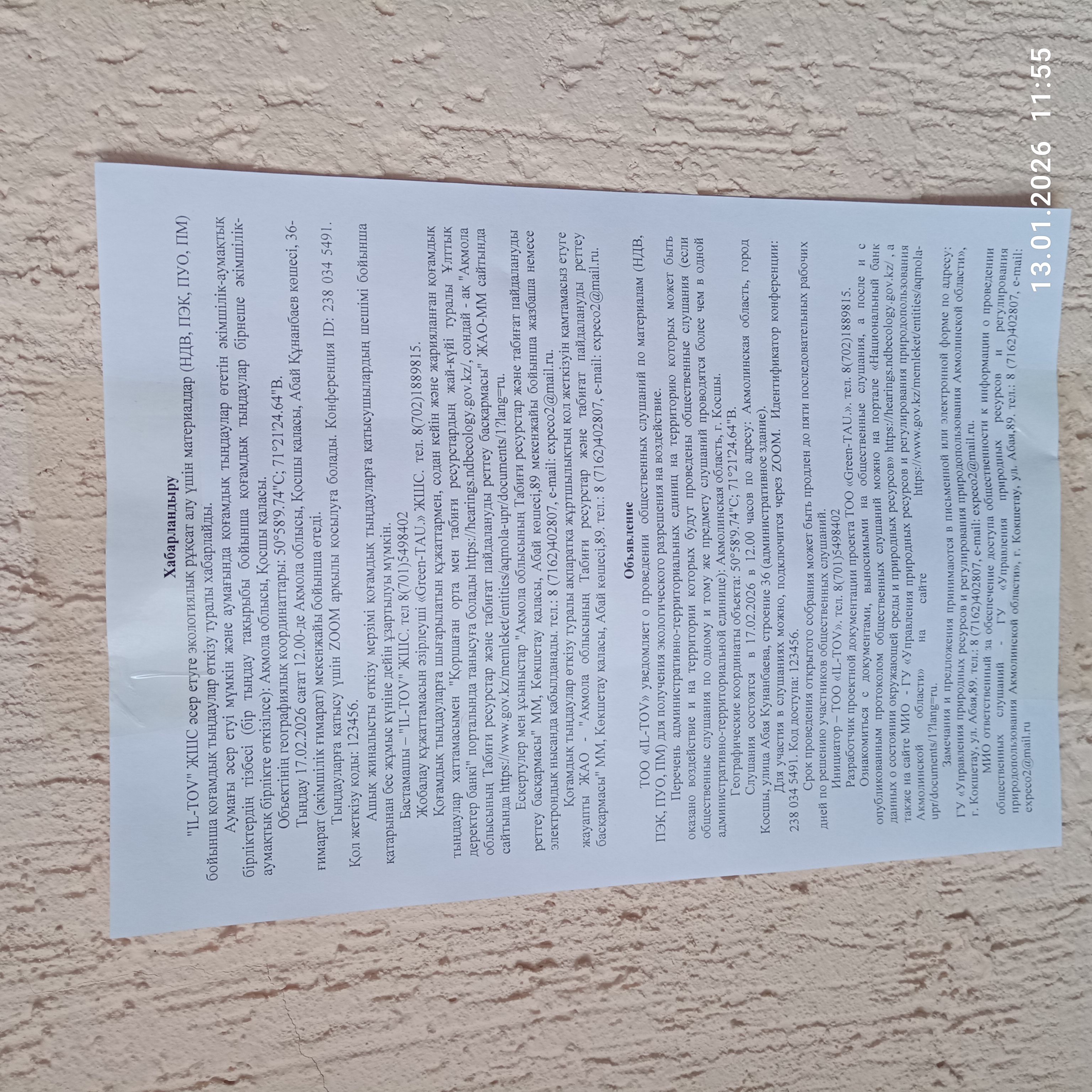 3. Общественные слушания организованны: Управление природных ресурсов и регулирования природопользования Акмолинской области, expeco@mail.ru,