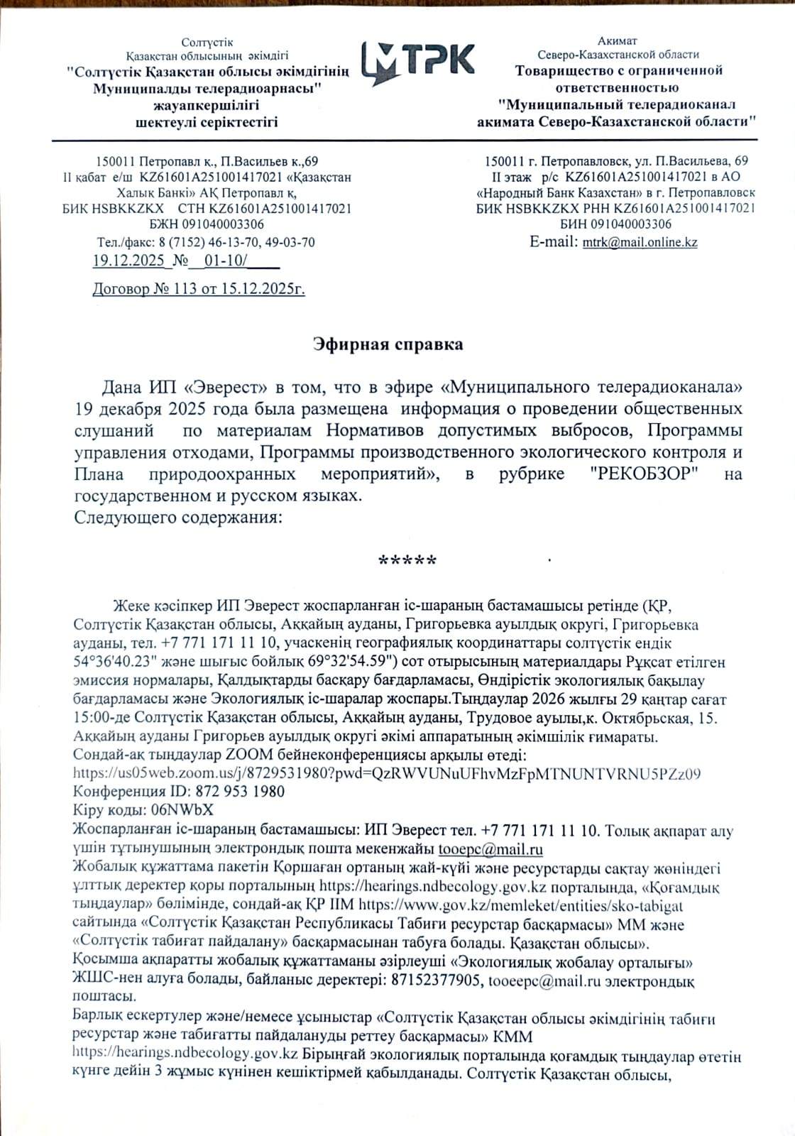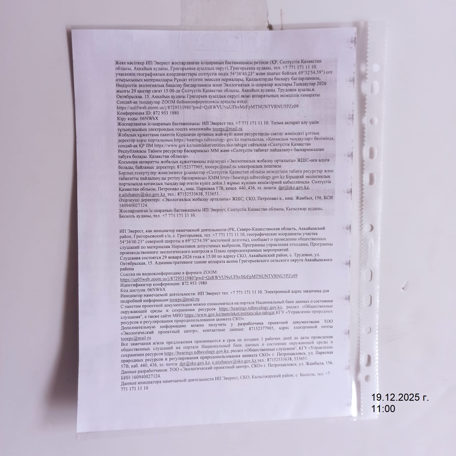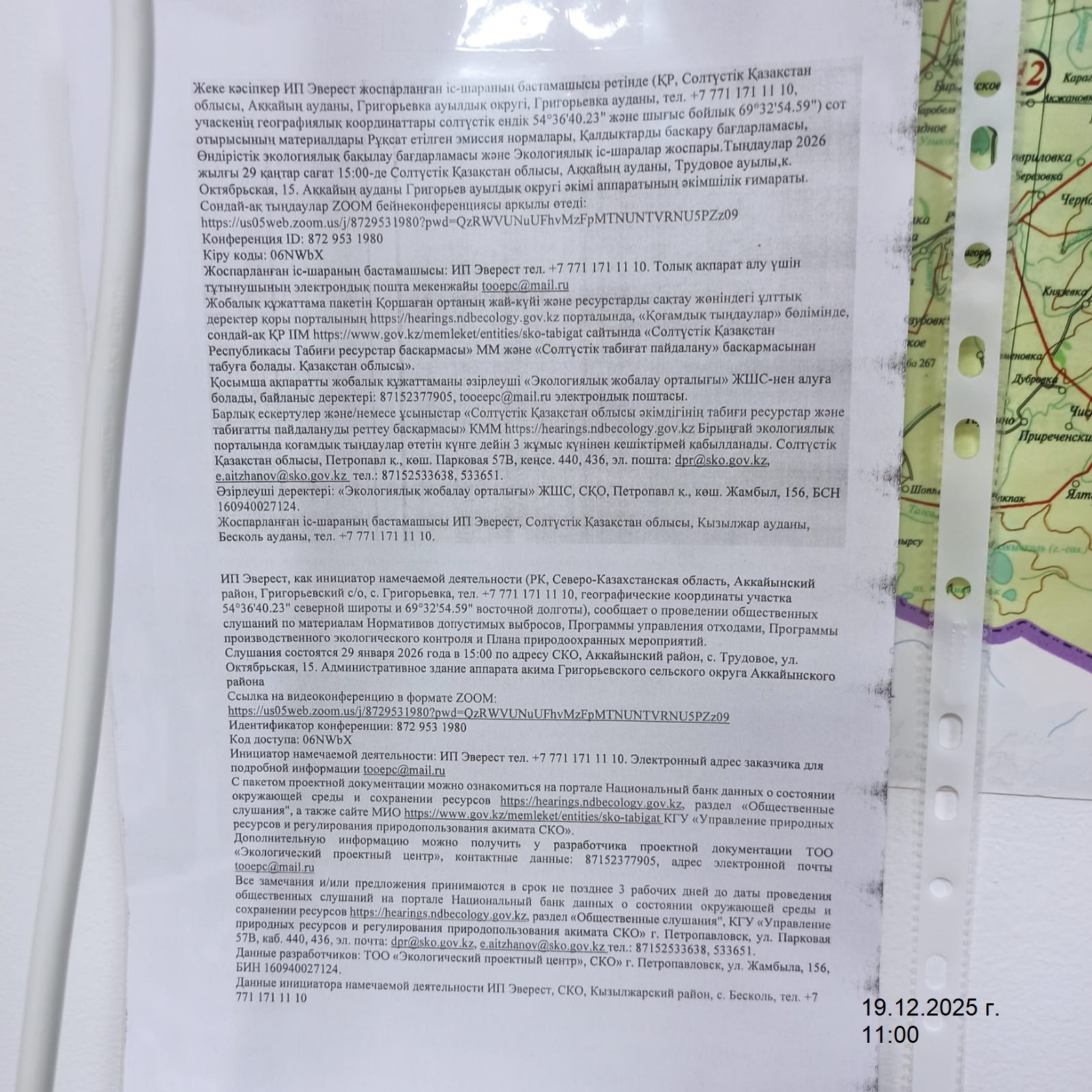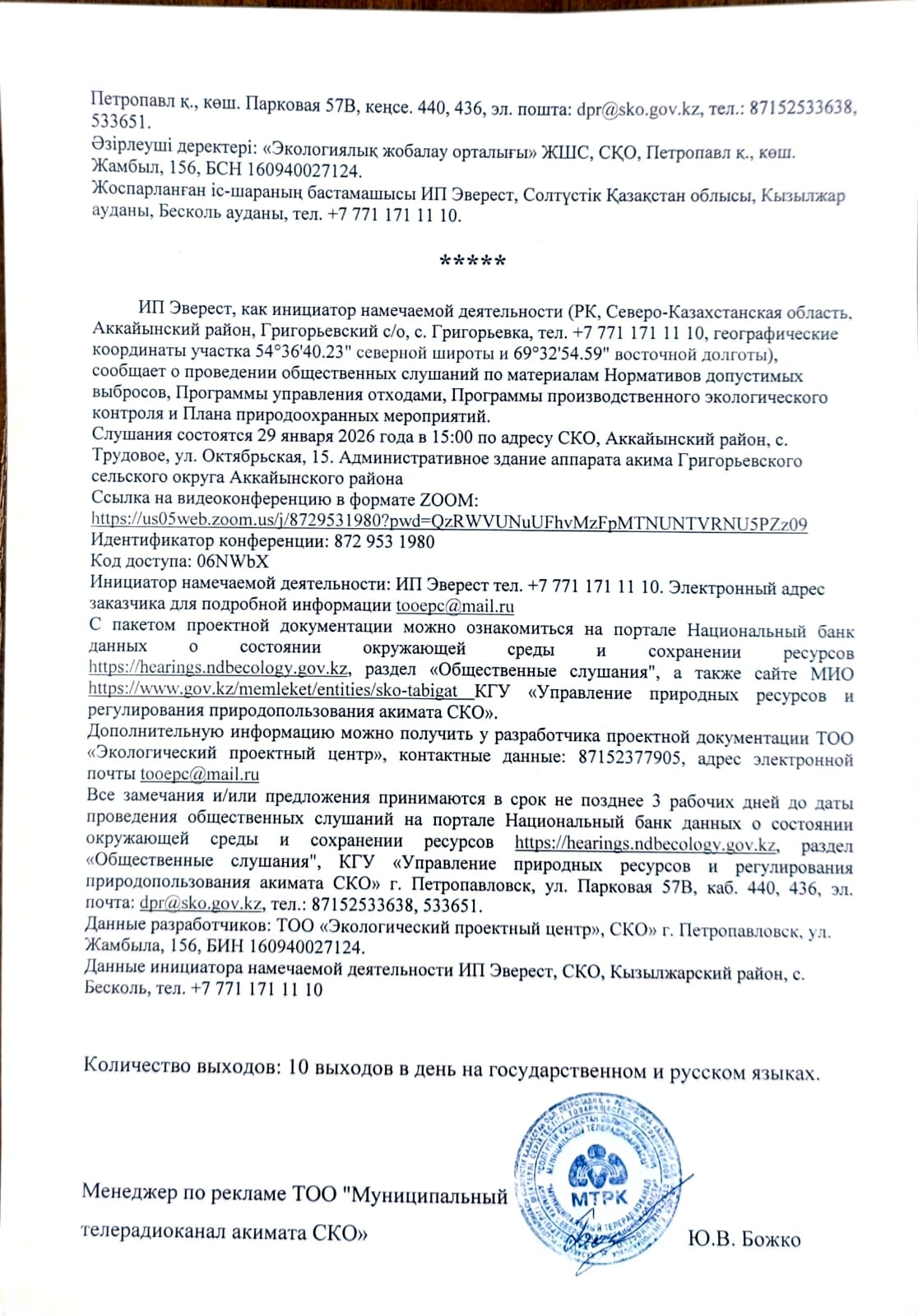 3. Общественные слушания организованны: Управление природных ресурсов и регулирования природопользования Северо-Казахстанской области, e.aitzhanov@sko.gov.kz,