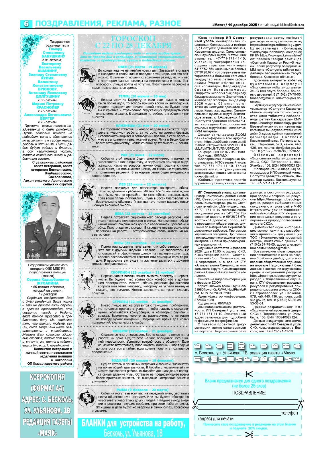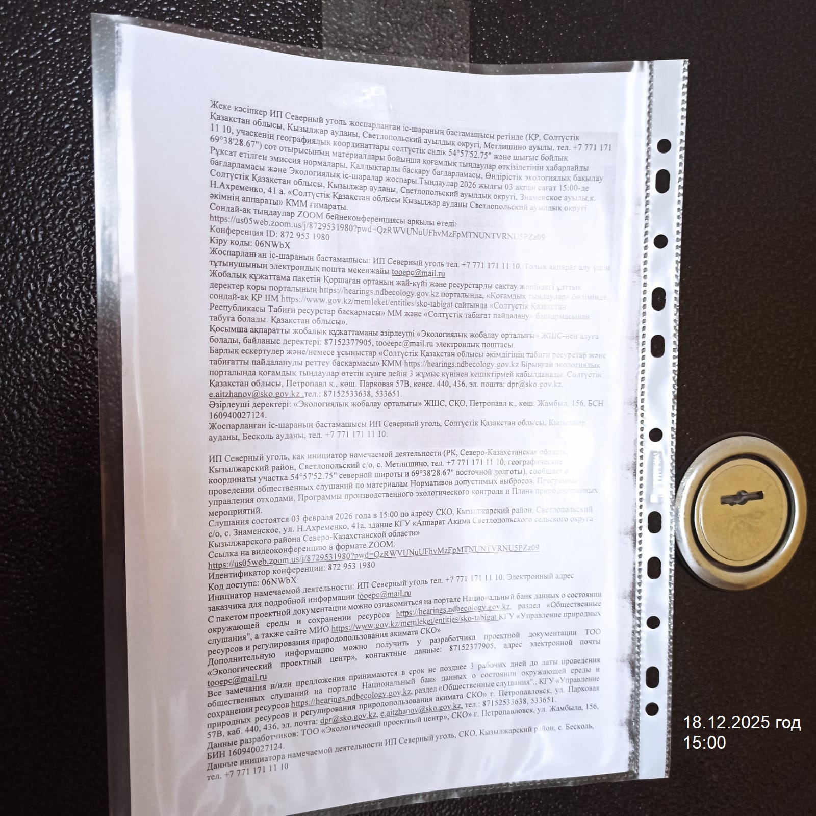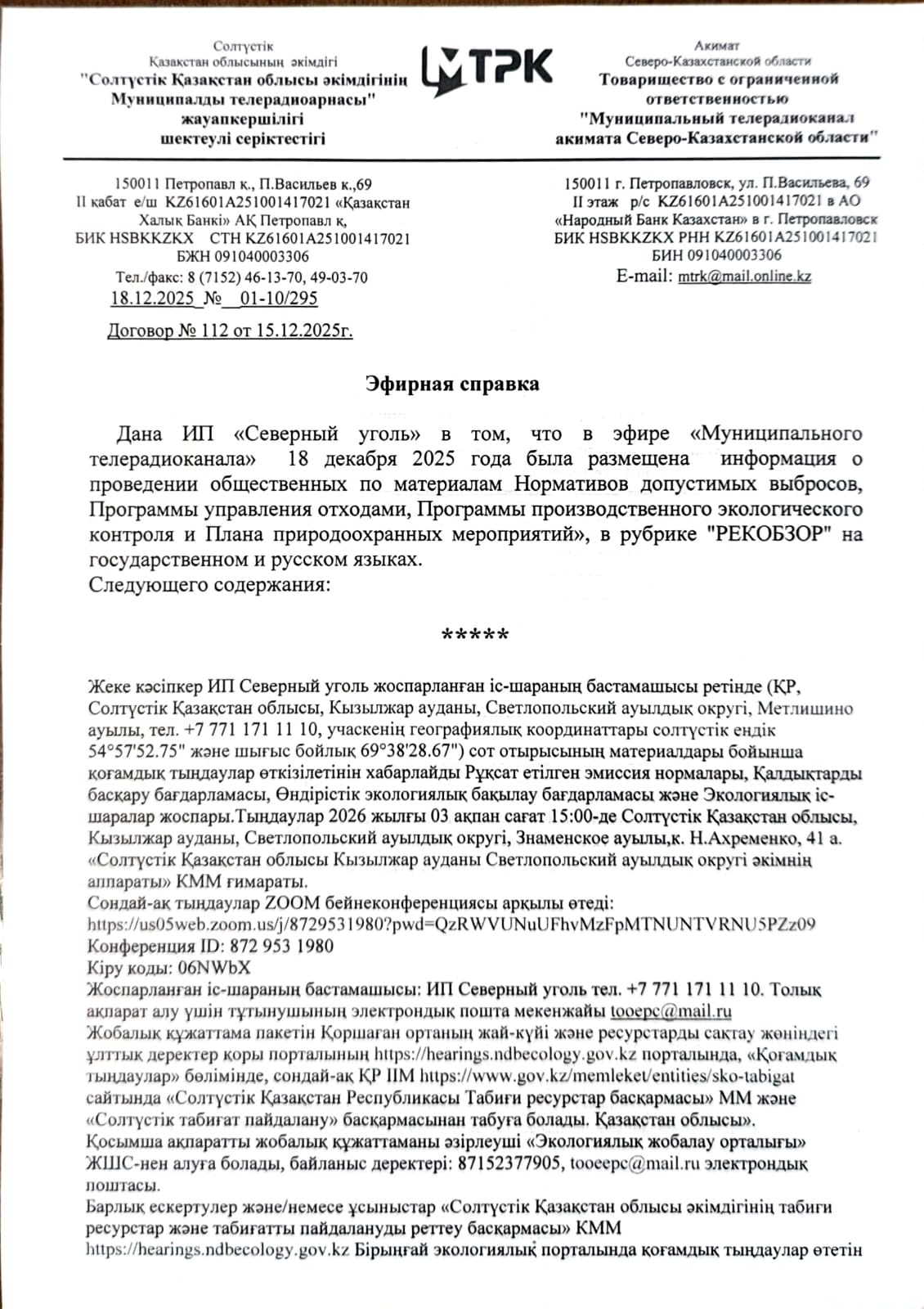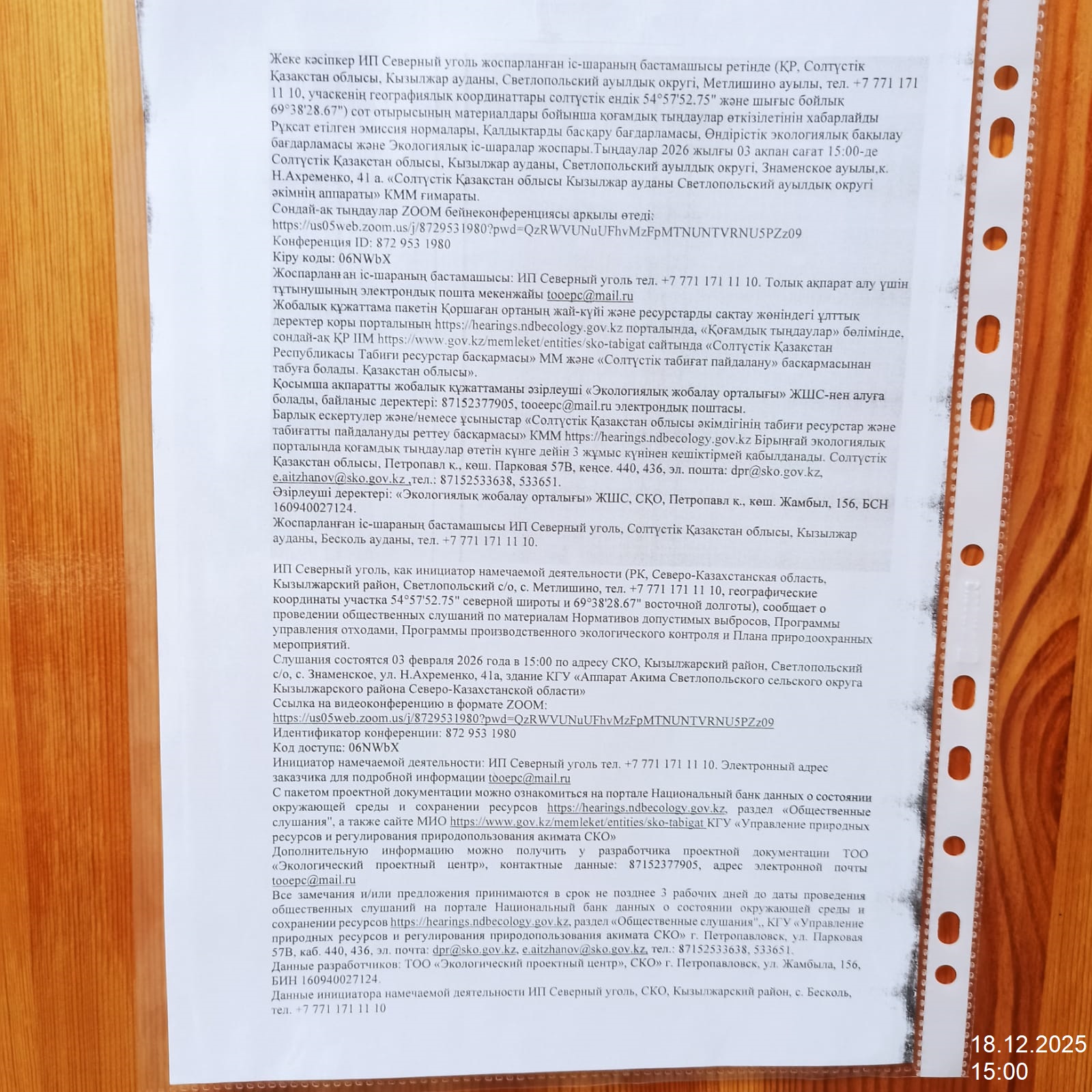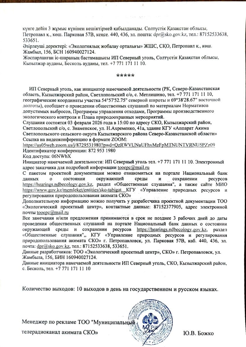 3. Общественные слушания организованны: Управление природных ресурсов и регулирования природопользования Северо-Казахстанской области, e.aitzhanov@sko.gov.kz,