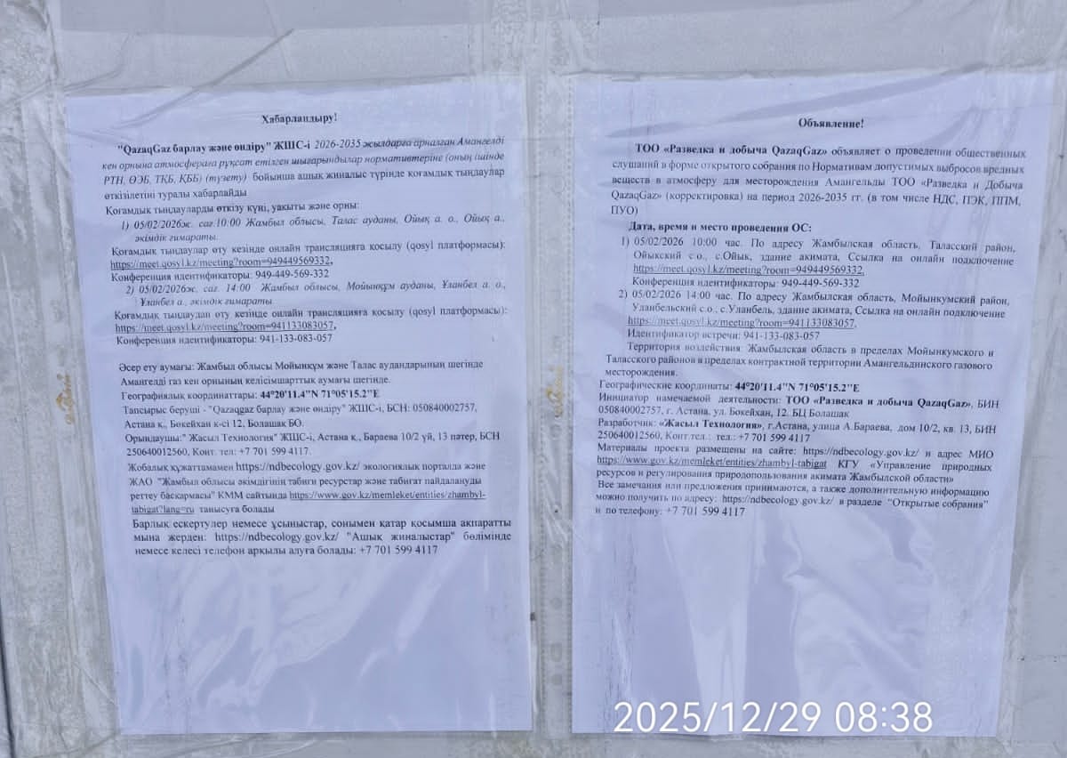 4. Повестка дня общественных слушаний: ТОО « Разведка и добыча QazaqGaz » расположено в Жамбылской области в пределах Мойынкумского и Таласского районов в пределах контрактной территории Амангельдинского газового месторождения.Основанием для корректировки НДВ на 2026-2035 годы является исключение и добавление новых источников. В проект НДВ также будут включены нормативы месторождения Амангельды,переходящий проект раздела ООС на период строительство и эксплуатации на 2026 год (так как в 2025 г строительство началось 4 квартале): РООС «Обустройство 3-х эксплуатационных скважин месторождения Амангельды (скважины №142, 143, 144)».По степени воздействия на окружающую среду Месторождение Амангельды ТОО «Разведка и добыча QazaqGaz» относится к I категории. Аварийные и залповые выбросы отсутствуют.