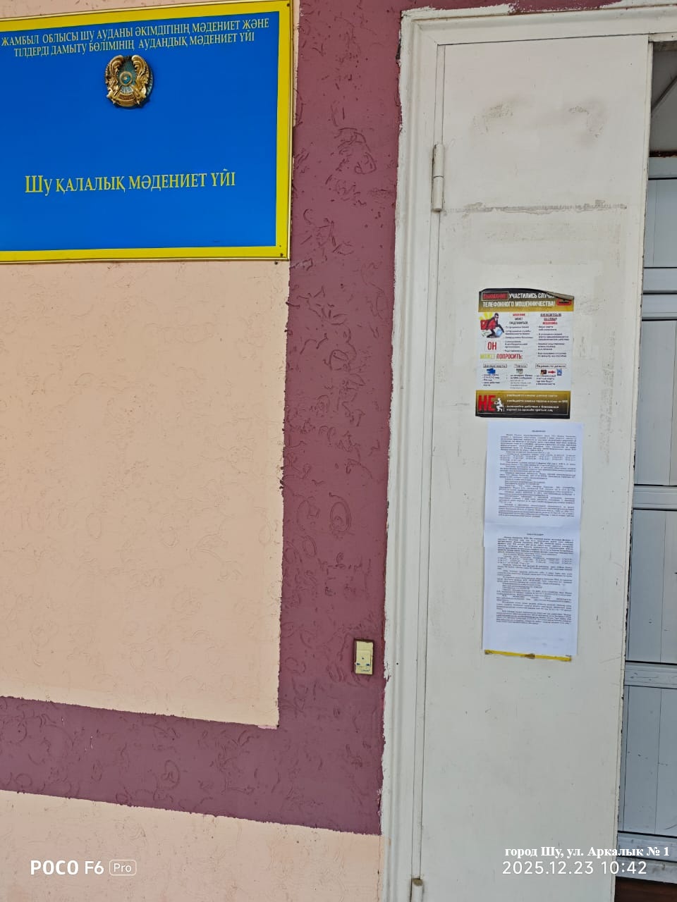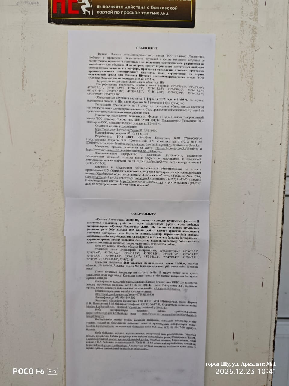 6.3. расположение мест, специально предназначенных для Размещения печатных объявлений (доски объявлений): Доска объявлений Аппарата Акима города Шу Шуйского района Жамбылской области (город Шу, ул. Конаева 23), Доска объявлений Казпочта (город Шу, ул. К. Сатпаева 10А), Доска объявлений Дома культуры города Шу (город Шу, ул. Аркалык № 1)