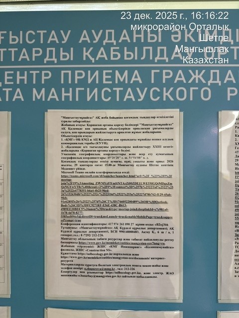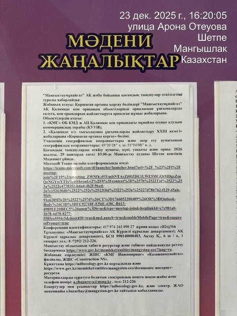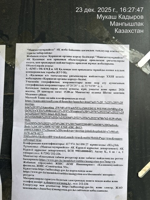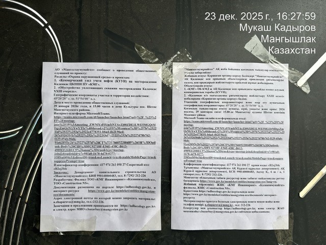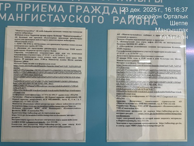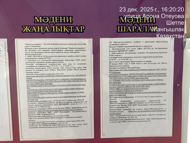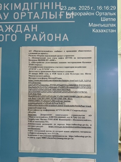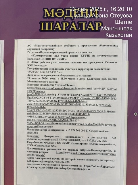 1.4. Описание для подключения к онлайн трансляции при прохождении общественного слушания: Интернет-платформа MicrosoftTeams. Идентификатор конференции: 417 974 261 090 27 Секретный код: cB2oj3bh https://teams.microsoft.com/l/meetup-join/19%3ameeting_ZWNlYzFlYmItNTAyZi00ZDE1LWE5MGQtMDgxZmQzNGYwYTIx%40thread.v2/0?context=%7b%22Tid%22%3a%22e4778351-b6a4-4b2f-96ed-267c152630db%22%2c%22Oid%22%3a%227d78b762-f129-45ab-9feb-91e6285f3c2b%22%7d 29 января 2026г года, в 15.00 часов в доме Культуры пос. Шетпе Мангистауского района. АО «Мангистаумунайгаз» сообщает о проведении общественных слушаний по проекту: Разделы «Охрана окружающей среды» к проектам: 1. «Коммерческий узел учета нефти (КУУН) на месторождении Каламкас ЦКППН ПУ «КМГ». 2. «Обустройство уплотняющих скважин месторождения Каламкас XXIII очередь».