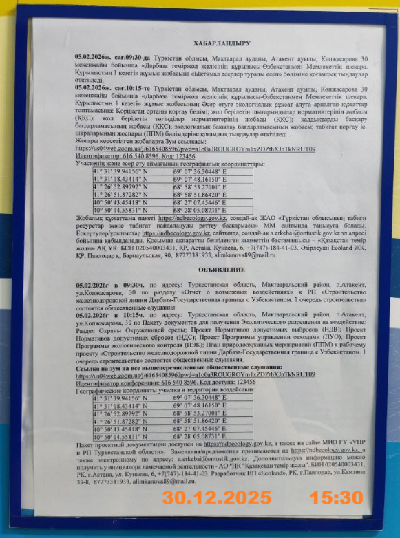 3. Общественные слушания организованны: Управление природных ресурсов и регулирования природопользования Туркестанской области, a.erkebai@ontustik.gov.kz,