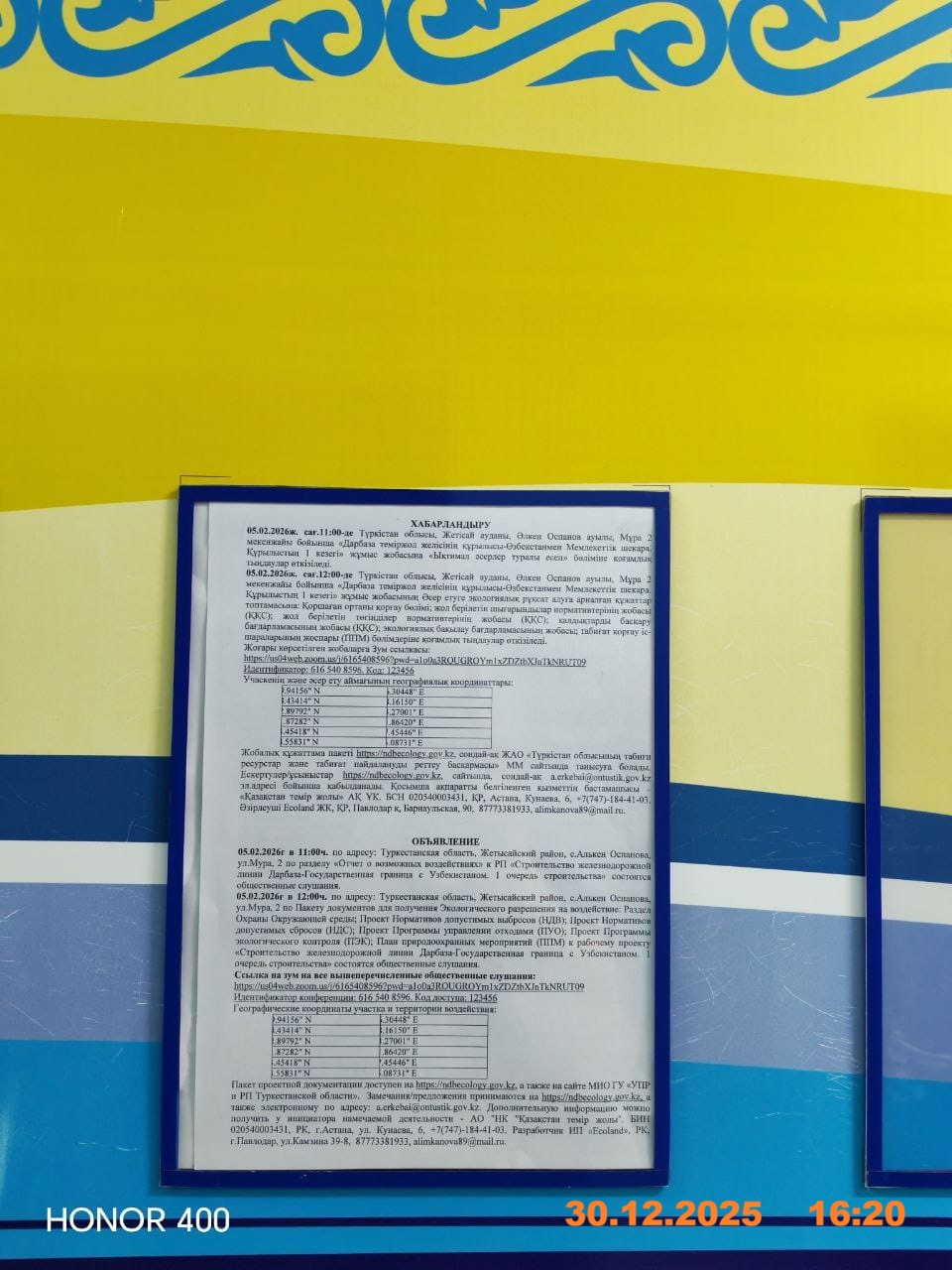 3. Общественные слушания организованны: Управление природных ресурсов и регулирования природопользования Туркестанской области, a.erkebai@ontustik.gov.kz,