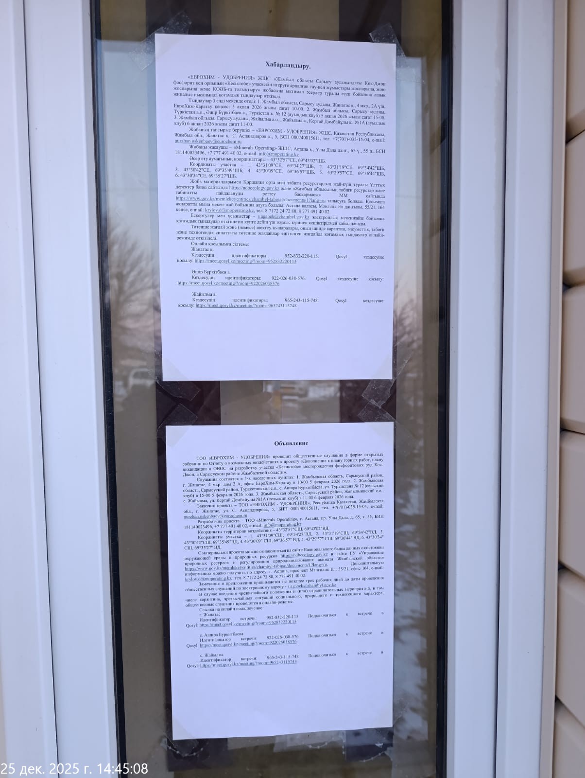 3. Общественные слушания организованны: Управление природных ресурсов и регулирования природопользования Жамбылской области, s.agabek@zhambyl.gov.kz,