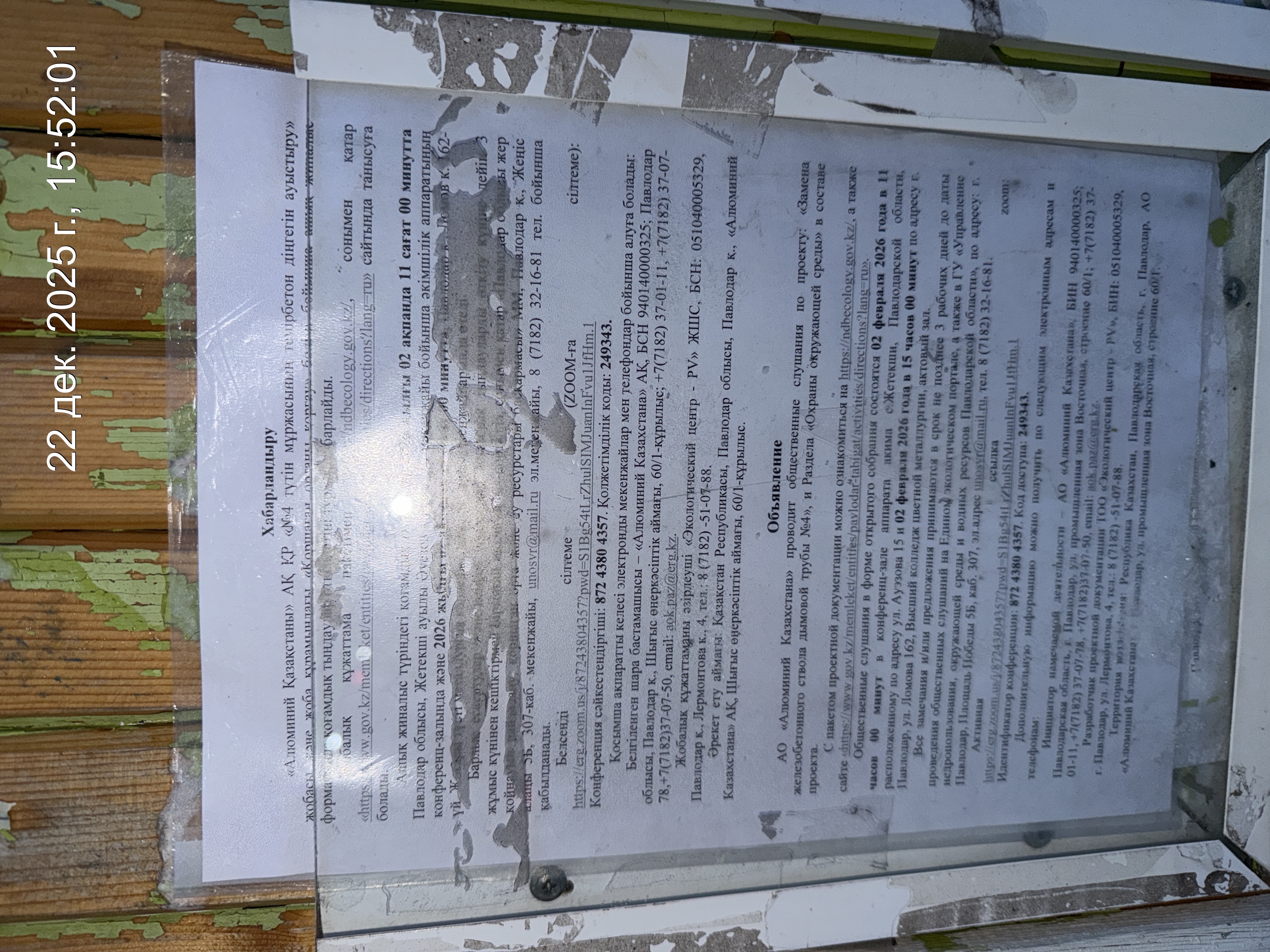 4. Повестка дня общественных слушаний: Проектом предусмотрено строительство дымовой железобетонной трубы №4 цеха спекания ПАЗ АО «Алюминий Казахстана» взамен аварийной существующей трубы №4. Строительно-монтажные работы по демонтажу существующей и строительству новой дымовой трубы № 4 будут производиться без остановки технологического процесса на АО «АК». В период проведения работ отвод дымовых газов от печи № 1 и печи № 8 будет осуществляться через действующие газоотводящие каналы иных дымовых труб. Временная схема предусматривает подключение печи № 1 к дымовой трубе № 1 (источник №0413), а печи № 8 — к дымовой трубе № 3 (источник №0415). Подключение к существующим дымовым трубам будет осуществляться после имеющихся систем очистки (гибридный фильтр печи №1, электрический фильтр печи №8), посредством резервных газоходов. Указанное техническое решение не повлечет увеличения суммарного валового выброса загрязняющих веществ в атмосферу предусмотренных разрешением KZ77VCZ00749882, так как изменение носит исключительно перераспределительный характер и предусматривает временное перераспределение существующего объема эмиссий между действующими источниками без превышения ранее установленных нормативов. Кроме того, замена трубы №4 не предполагает на период эксплуатации образование дополнительных источников выбросов загрязняющих веществ и отходов вследствие чего, влияние на объем, количество и (или) интенсивность эмиссий и иных форм негативного воздействия такого объекта на окружающую среду в пределах существующей промплощадки не окажет. Предприятие АО «Алюминий Казахстана» имеет две производственные площадки – Павлодарский алюминиевый завод (ПАЗ) и теплоэлектроцентраль (ТЭЦ). ПАЗ - металлургическое предприятие по производству глинозема (из бокситового сырья). ТЭЦ – энергетическое предприятие по производству электрической и тепловой энергии в виде горячей воды и пара для собственных нужд ПАЗ, а также нужд жилого сектора и некоторых промышленных предприятий г. Павлодара.