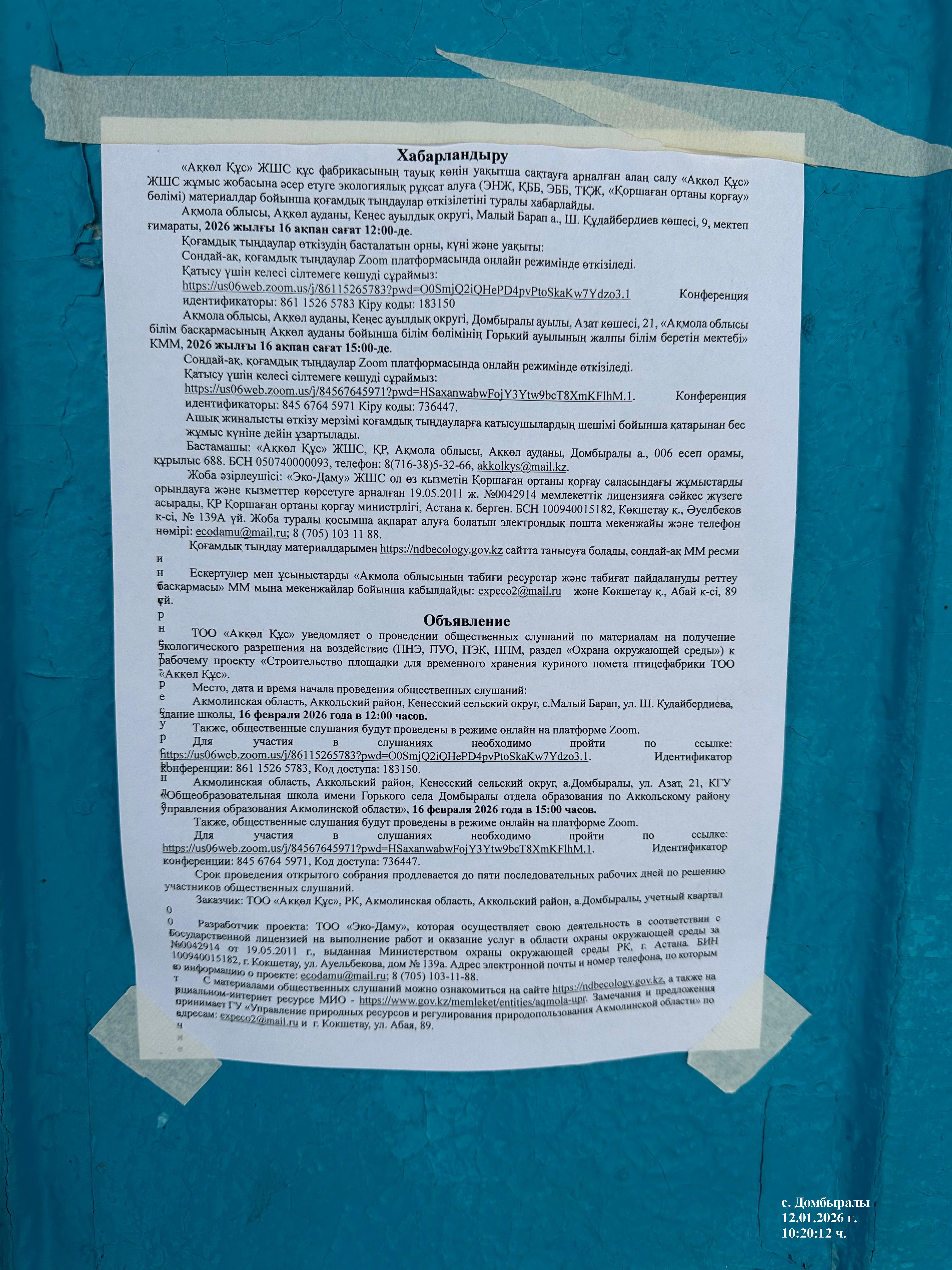 4. Повестка дня общественных слушаний: ТОО «Ақкөл Құс» действующее предприятие которая реализует яйца качественной племенной сельскохозяйственной птицы кур яичных кроссов оптом и в розницу. Птицефабрика мощностью 90млн. штук в год, а также дополнительной продукции – 300 тонн куриного мяса в год. Птицефабрика рассчитана на содержание кур-несушек поголовье 237500 голов, поголовье ремонтного молодняка 142 500 голов. ТОО «Ақкөл Құс» планирует строительство новой площадки временного хранения и переработки куриного помета в удобрение, образующиеся от птицефабрики предприятия. Новая площадка временного хранения и переработки куриного помета является производственным подразделением, которое располагается по адресу: Акмолинская область, Аккольский район, Кенеский сельский округ, село Домбыралы. Отведенная территория под объекты площадки, составляет – 10.0 га. Обоснование выбора места: акт на земельный участок за № 2025-3999083 от 19 марта 2025 года. Режим эксплуатации площадки круглогодичный. Планируемое строительство вызвано потребностью птицефабрики во временном хранении куриного помета, образующегося в процессе жизнедеятельности кур-несушек при производстве товарного яйца. В процессе временного хранения помета будет осуществляться производство ценнейшего естественного органического удобрения, которое будет реализовываться предприятиям сельскохозяйственного направления. СМР. В процессе строительства будут проведены следующие виды работ: снятие ПРС, планировка территории, выемочно-погрузочные работы, устройство грунтового покрытия, устройство песчаного покрытия, устройство щебеночного покрытия, строительство КПП. Эксплуатация. На площадке временного хранения помета будут выполняться следующие виды работ: прием, складирование, изоляция помета, вывоз органического удобрения. На территории площадки будут приниматься только твердые фракции помета, где их будут складировать в бурты шириной – 6,27 м, высотой – 2,1 м, длинной – 71 м. всего рабочих карт будет -13. Объем складирование одной карты – 750 м3, средняя продолжительность складирования – 6 дней.