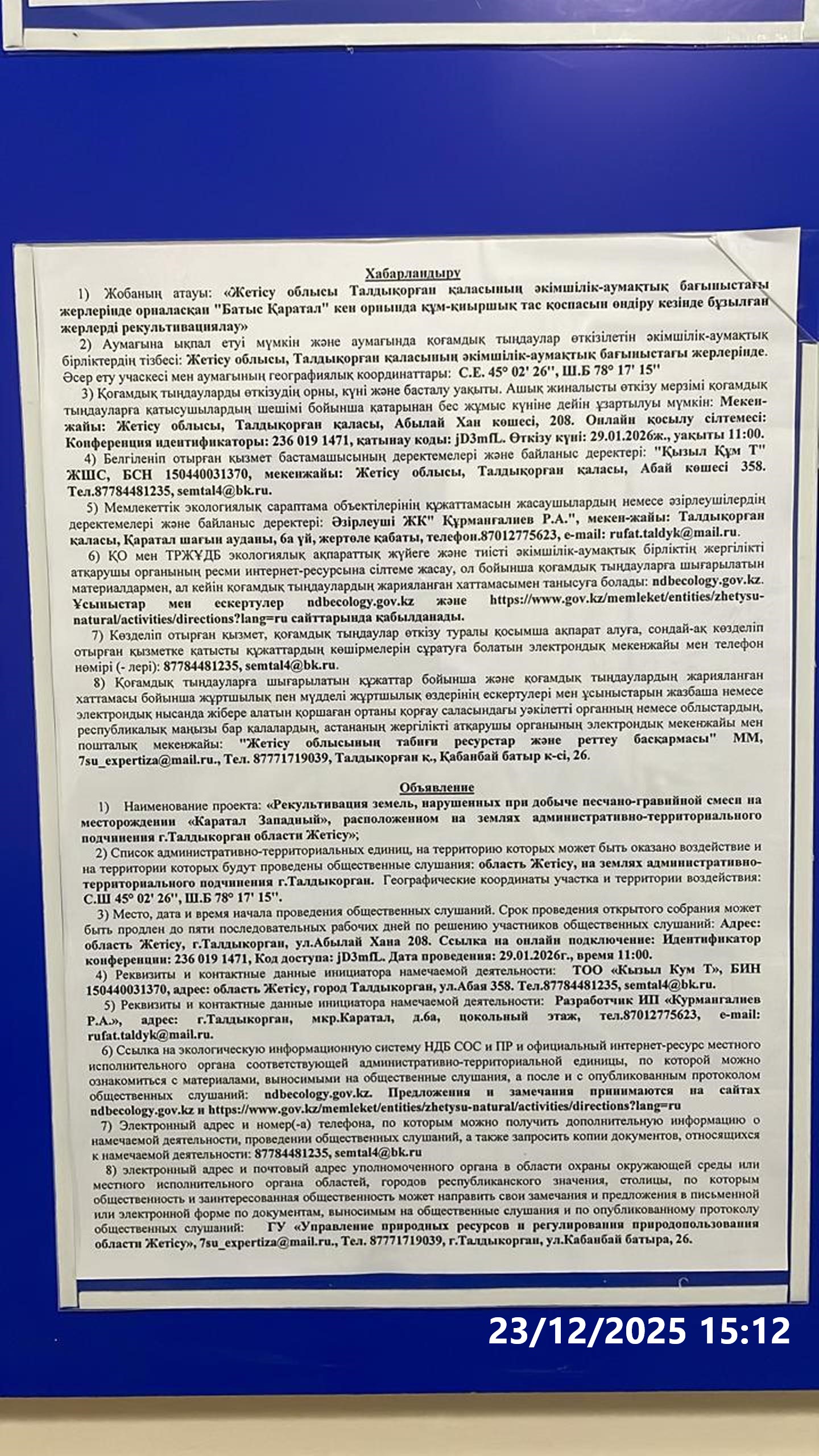 По проекту: Рекультивация земель, нарушенных при добыче песчано-гравийной смеси на месторождении «Каратал Западный», расположенном на землях административно-территориального подчинения г.Талдыкорган области Жетісу