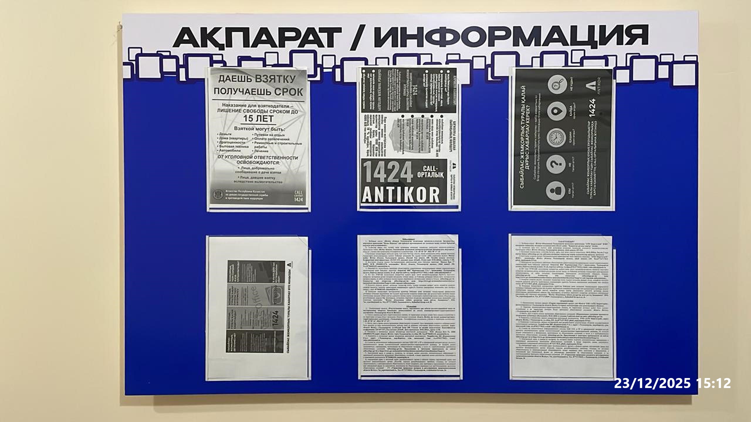 6.3. расположение мест, специально предназначенных для Размещения печатных объявлений (доски объявлений): Доска объявлений Акимата