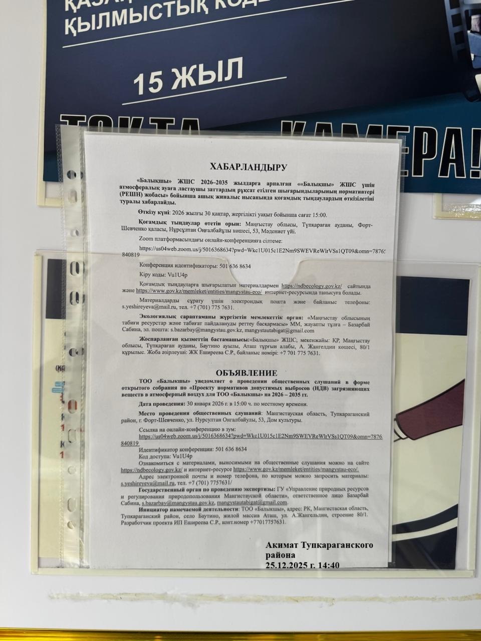 1.4. Описание для подключения к онлайн трансляции при прохождении общественного слушания: Svetlana Yeshireyeva приглашает вас на запланированную конференцию: Zoom. Тема: ПРОЕКТ НОРМАТИВОВ ДОПУСТИМЫХ ВЫБРОСОВ (НДВ) ЗАГРЯЗНЯЮЩИХ ВЕЩЕСТВ В АТМОСФЕРНЫЙ ВОЗДУХ ДЛЯ ТОО «БАЛЫКШЫ» НА 2026 – 2035 ГГ. Время: 30 янв. 2026 03:00 PM Астана, Алматы Подключиться к конференции Zoom https://us04web.zoom.us/j/5016368634?pwd=Wkc1U015c1E2Nm9SWEVReWlrVSs1QT09&omn=78765840819 Идентификатор конференции: 501 636 8634 Код доступа: Vu1U4p