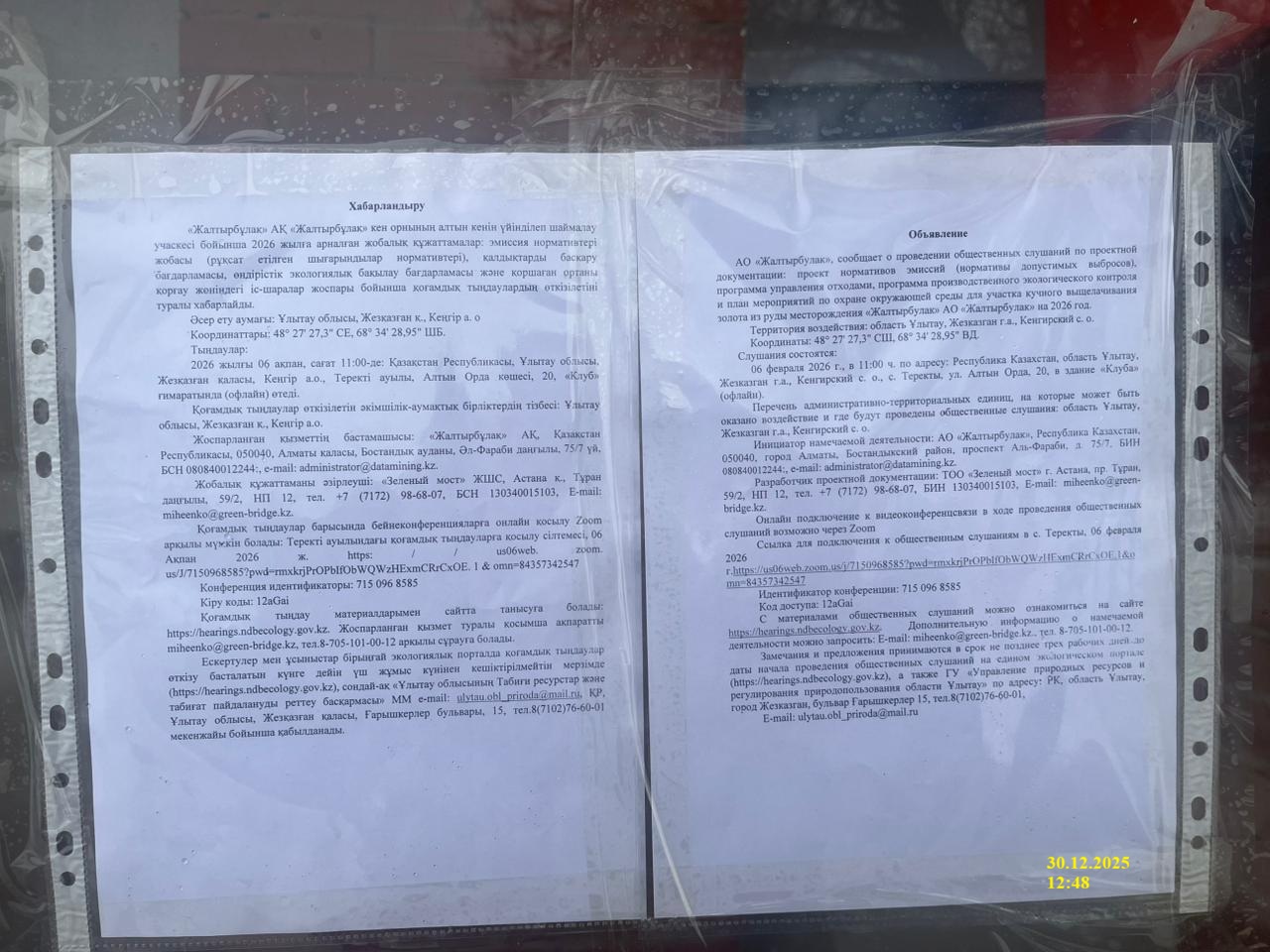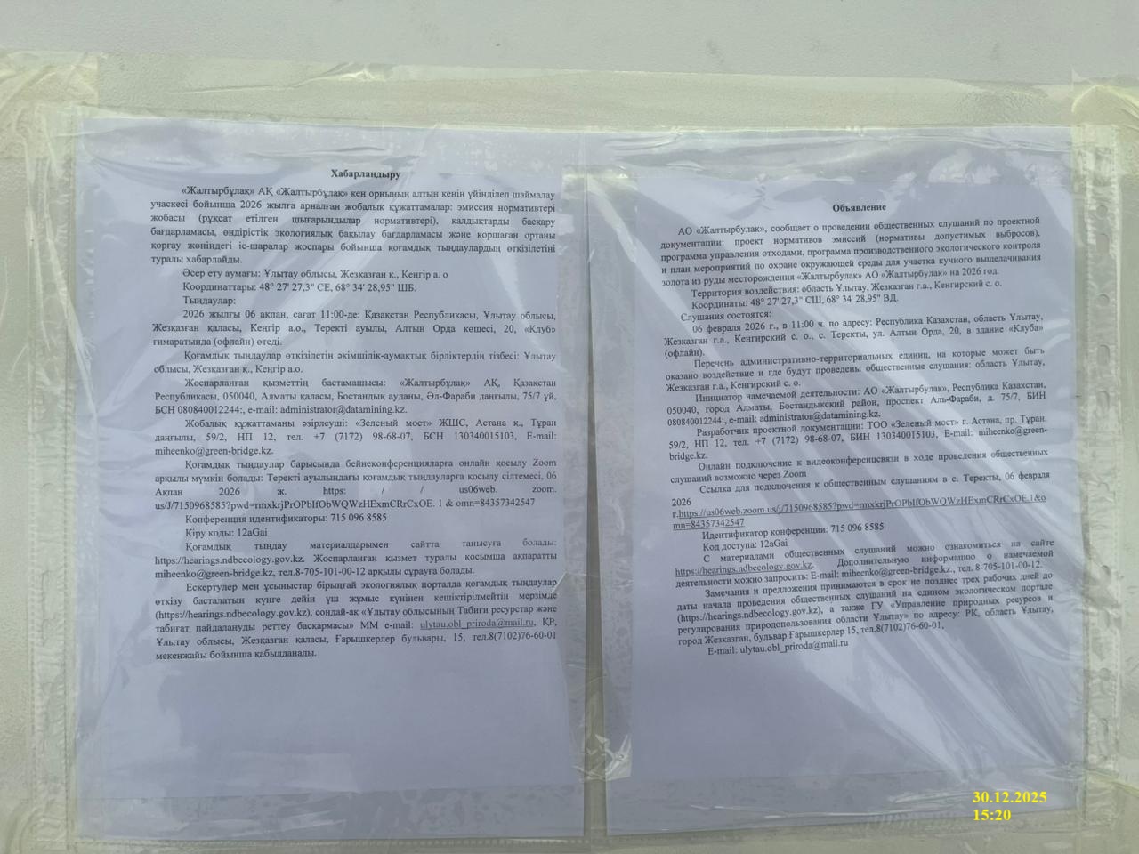 По проекту: Проект нормативов эмиссий (нормативы допустимых выбросов) для участка кучного выщелачивания золота из руды месторождения «Жалтырбулак», программа управления отходами для участка кучного выщелачивания золота из руды месторождения «Жалтырбулак», АО «Жалтырбулак» на 2026 г., программа производственного экологического контроля для участка кучного выщелачивания золота из руды месторождения «Жалтырбулак», АО «Жалтырбулак» на 2026 г. и План мероприятий по охране окружающей среды на 2026 год.