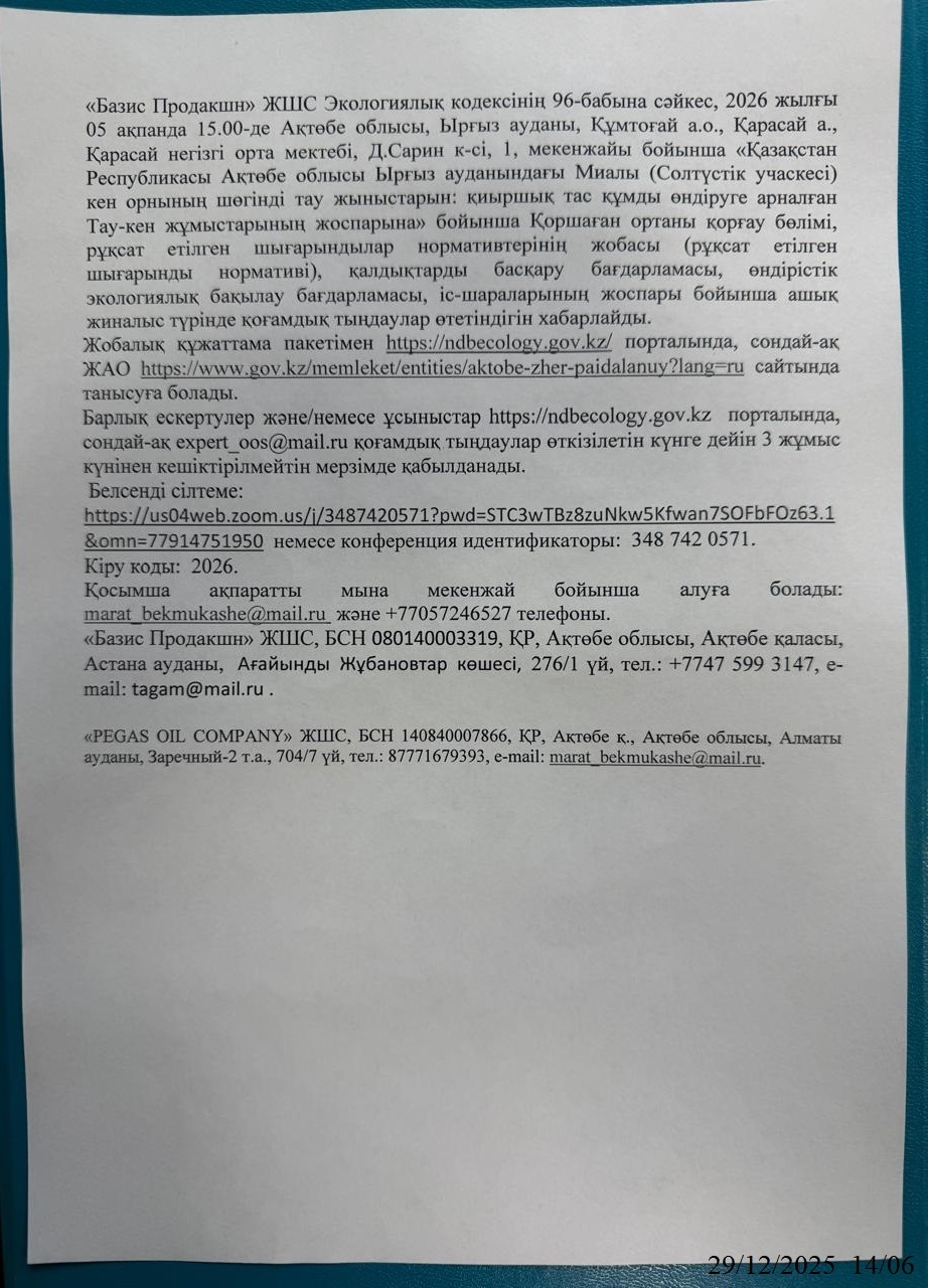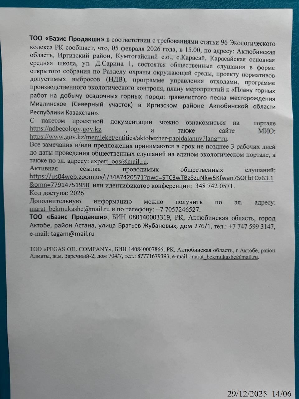 4. Повестка дня общественных слушаний: Миалинское месторождение гравелистого песка расположено в 4,8 км на юг от пос.Кирова, в 100 км на северо-запад от с.Иргиз (по дорогам), и административно входит в Иргизский район Актюбинской области Республики Казахстан. Разработка месторождения начнется с северо-западной части Лицензионного участка с дальнейшим продвижением на юг. Освоение участка начнется с проведения горно-строительных работ в объеме, обеспечивающим подготовку запасов к выемке, гарантирующих проектный уровень добычных работ, а также строительство объектов, необходимых для нормального функционирования карьера, т.е. сдачи карьера в эксплуатацию. Разработка объекта добычи начнется с проведения горно-строительных и горно-капитальных работ, с параллельным проведением добычи. Заданием на проектирование определена годовая производительность карьера по ГПС: в 2025-2034 годы – 160,0 тыс. м3. Отработка карьера с указанной производительностью в год обеспечивается в течении 10 лет до 2034 г. до окончания срока лицензии на добычу. Режим работы карьера на добыче 220 рабочих дней в году с семидневной рабочей неделей в одну смену по 8 часов; всего в год – 1760 рабочих часов. Горно-технологическое оборудование Из вышеизложенного следует, что на производстве горных работ будут задолжены следующие механизмы. На вскрышных и зачистных работах - бульдозер типа SHANTUI SD-16 - фронтальный погрузчик типа SDLG L968F - автосамосвал на вывозе пород вскрыши и зачистки типа Shacman (25 т) На добычных работах - экскаватор-драглайн типа ЭО-5111Б - экскаватор типа ЭКГ-5А - автосамосвал на вывозе полезного ископаемого типа Shacman (25 т) На вспомогательных работах: - бульдозер (тот же, что на вскрыше) - машина поливомоечная - автобус типа Газель, - автозаправщик. 1 ед. Суммарный выброс загрязняющих веществ в атмосферу от рассматриваемого объекта на период горнодобывающих работ составит: 2026 - 2027 год – 4.6137283 тонн. 2028 год – 3.9984283 тонн. 2029 – 2033 год – 2.8014283 тонн. Виды отходов: 2026-2027гг Смешанные коммунальные отходы (ТБО) – 0.75тн/г Промасленная ветошь-0.1905тн/г Вскрышные породы-25542тн/год 2028-2033гг Смешанные коммунальные отходы (ТБО) – 0.75тн/г Промасленная ветошь-0.1905тн/г Предварительный расход воды составят: питьевой- 34м3, хозяйственной -170м3. Расход воды для пылеподавления согласно плану горных работ составят 1786 м3. «Базис Продакшн» ЖШС Экологиялық кодексінің 96-бабына сәйкес, 2026 жылғы 05 ақпанда 15.00-де Ақтөбе облысы, Ырғыз ауданы, Құмтоғай а.о., Қарасай а., Қарасай негізгі орта мектебі, Д.Сарин к-сі, 1, мекенжайы бойынша «Қазақстан Республикасы Ақтөбе облысы Ырғыз ауданындағы Миалы (Солтүстік учаскесі) кен орнының шөгінді тау жыныстарын: қиыршық тас құмды өндіруге арналған Тау-кен жұмыстарының жоспарына» бойынша Қоршаған ортаны қорғау бөлімі, рұқсат етілген шығарындылар нормативтерінің жобасы (рұқсат етілген шығарынды нормативі), қалдықтарды басқару бағдарламасы, өндірістік экологиялық бақылау бағдарламасы, іс-шараларының жоспары бойынша ашық жиналыс түрінде қоғамдық тыңдаулар өтетіндігін хабарлайды. Жобалық құжаттама пакетімен https://ndbecology.gov.kz/ порталында, сондай-ақ ЖАО https://www.gov.kz/memleket/entities/aktobe-zher-paidalanuy?lang=ru сайтында танысуға болады. Барлық ескертулер және/немесе ұсыныстар https://ndbecology.gov.kz порталында, сондай-ақ expert_oos@mail.ru қоғамдық тыңдаулар өткізілетін күнге дейін 3 жұмыс күнінен кешіктірілмейтін мерзімде