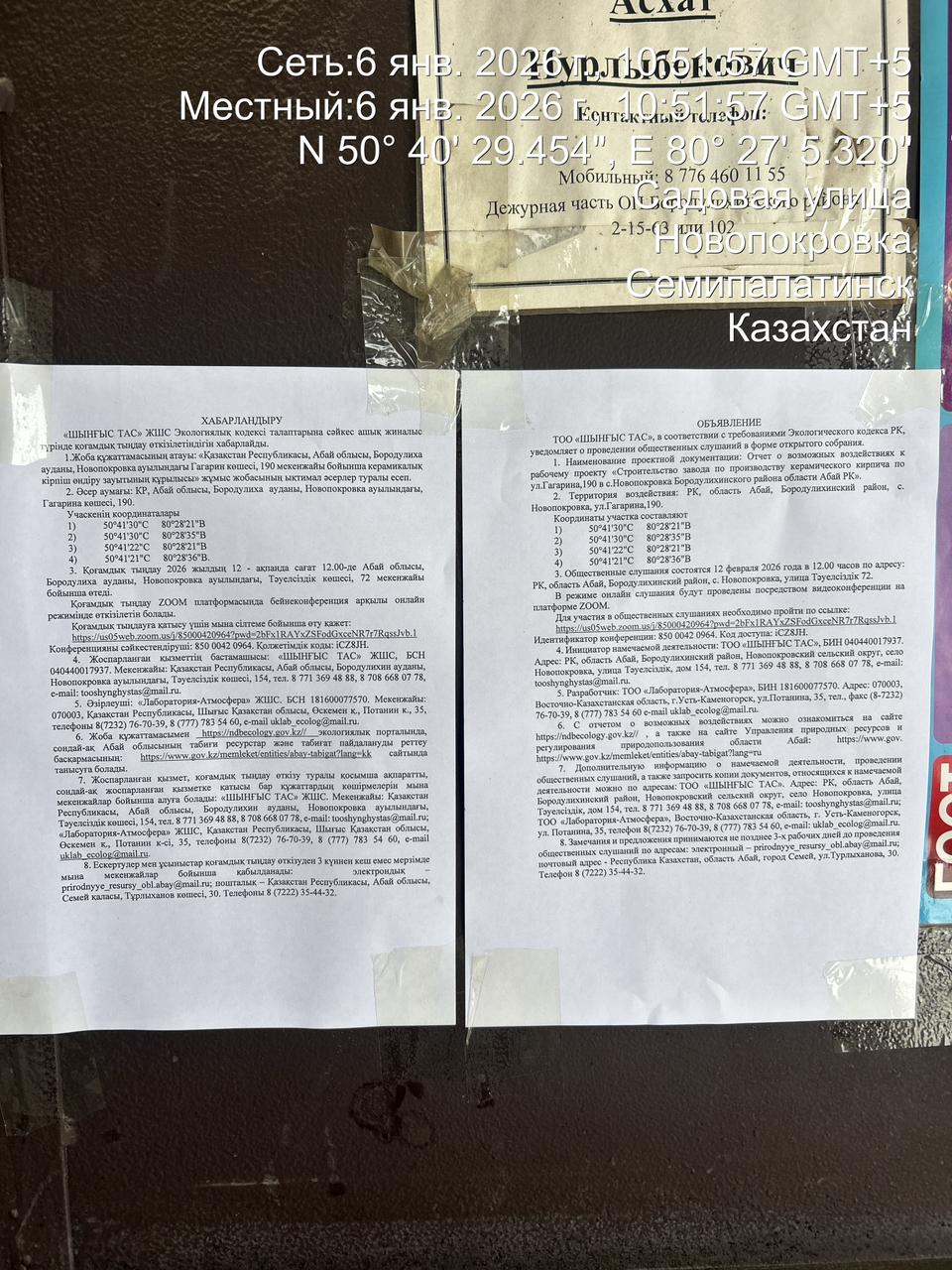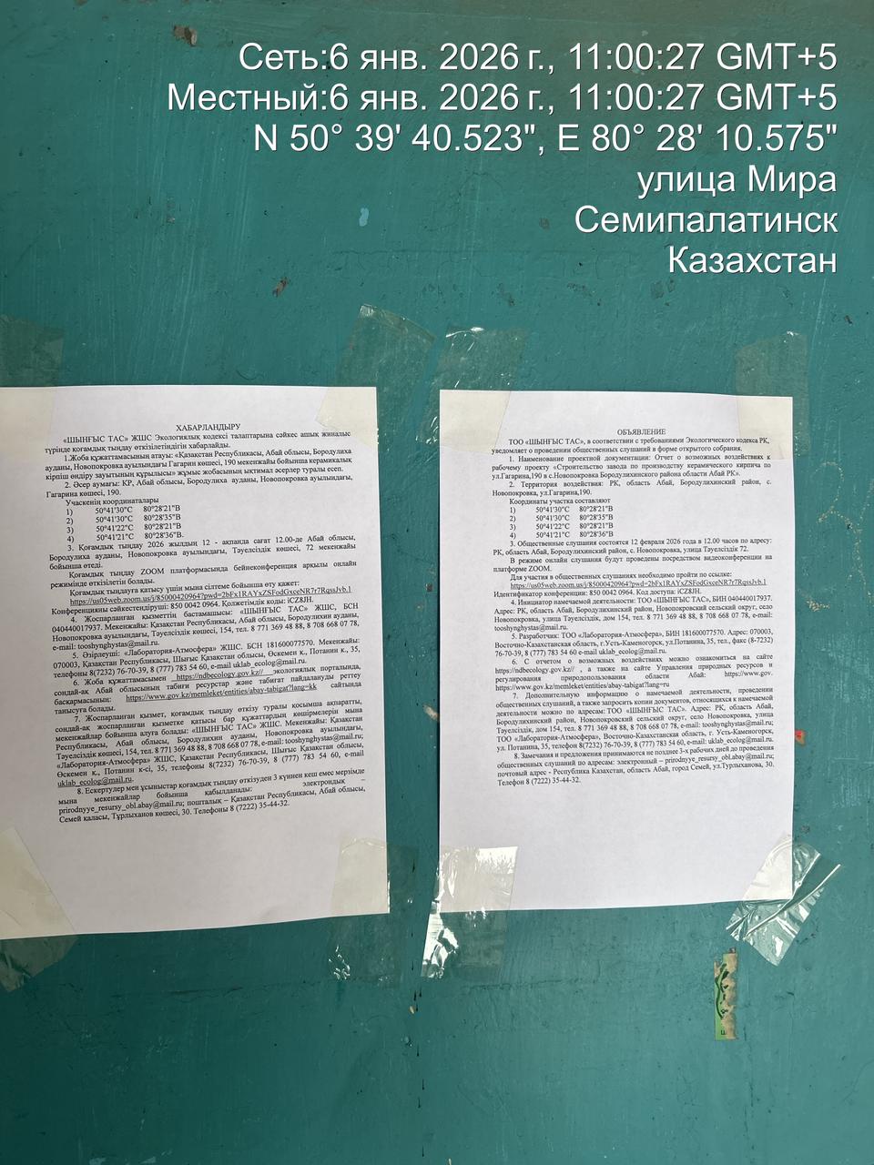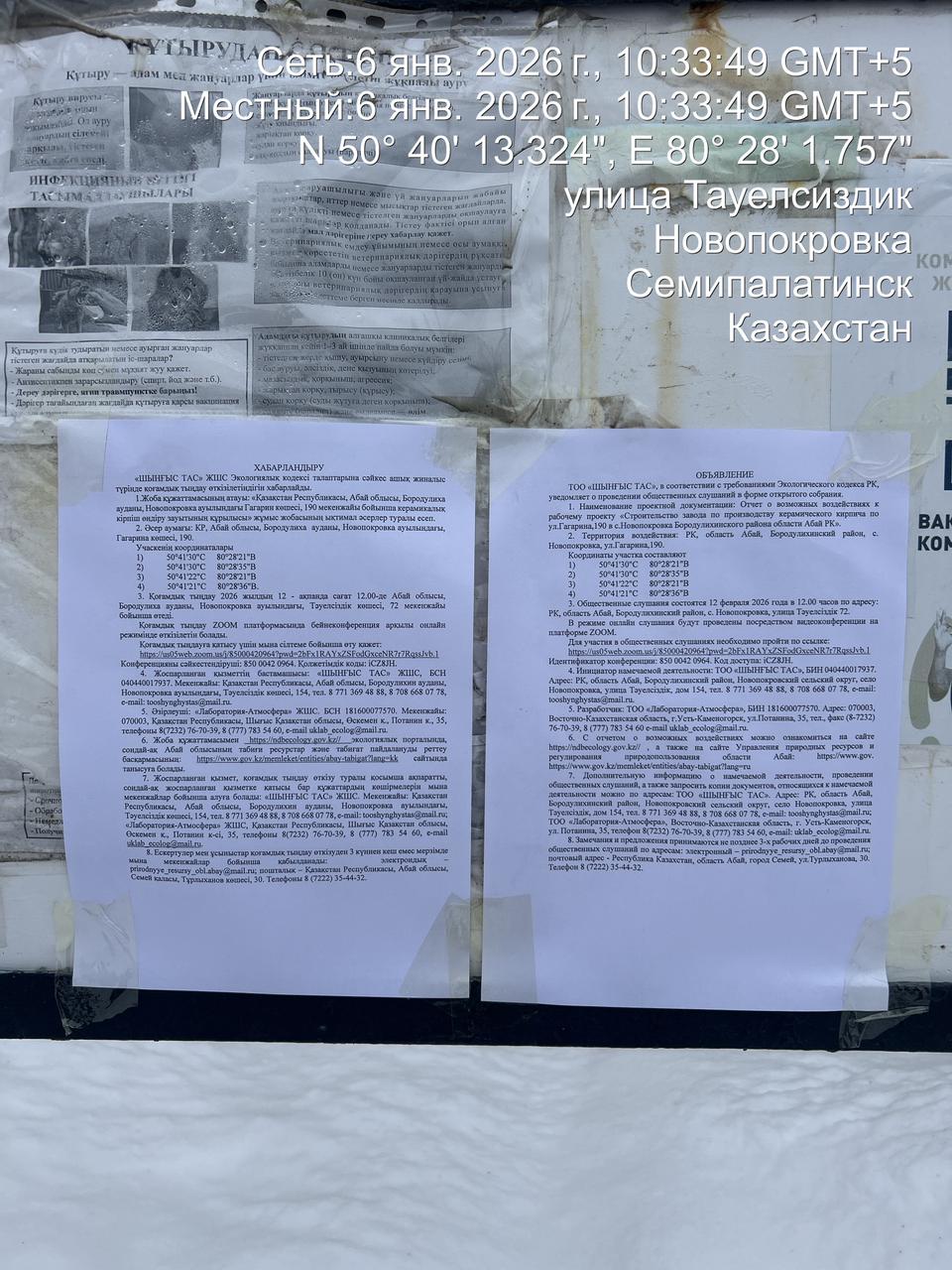 6. Объявление о проведении общественных слушаний на казахском и русском языках будет распространено следующими способами: