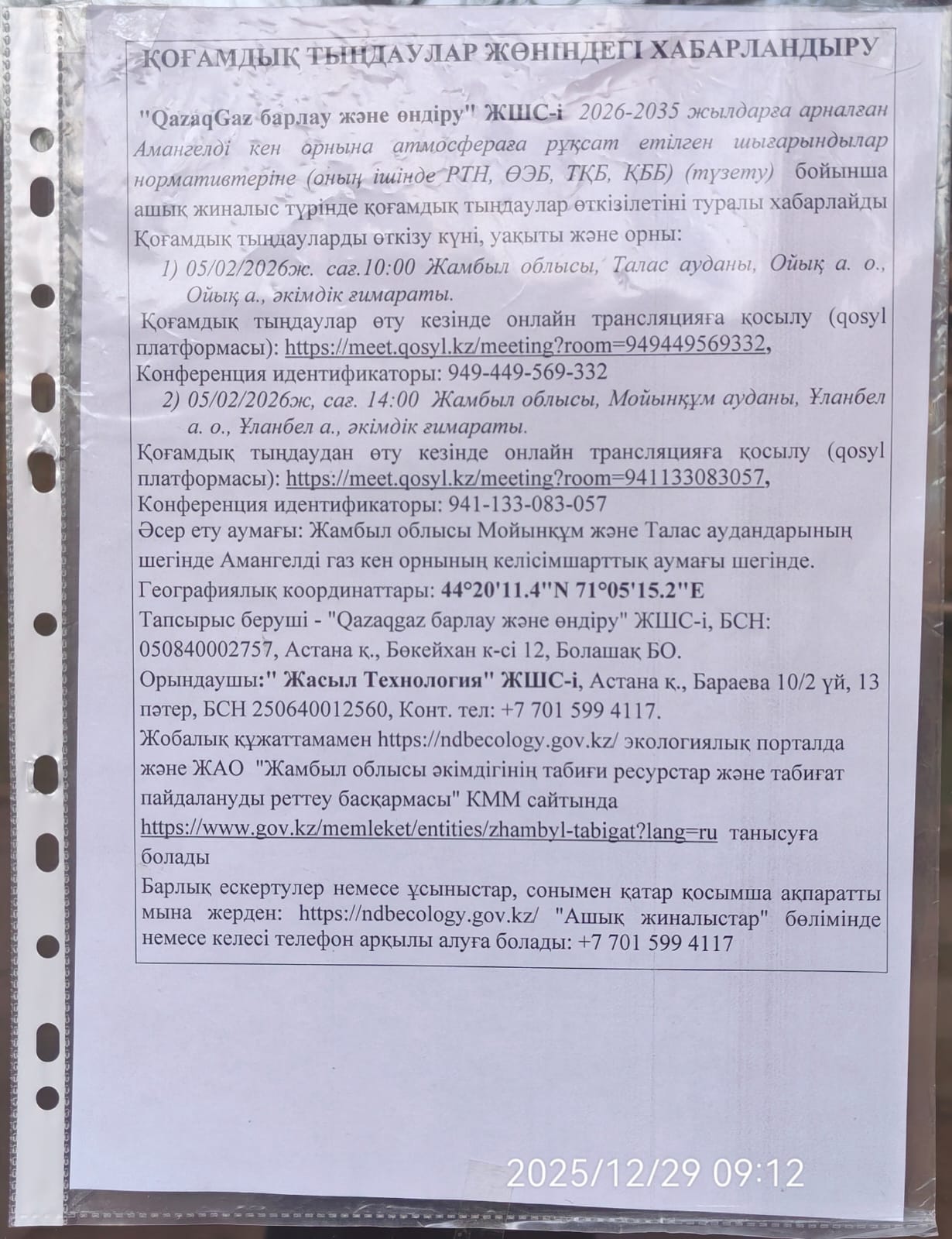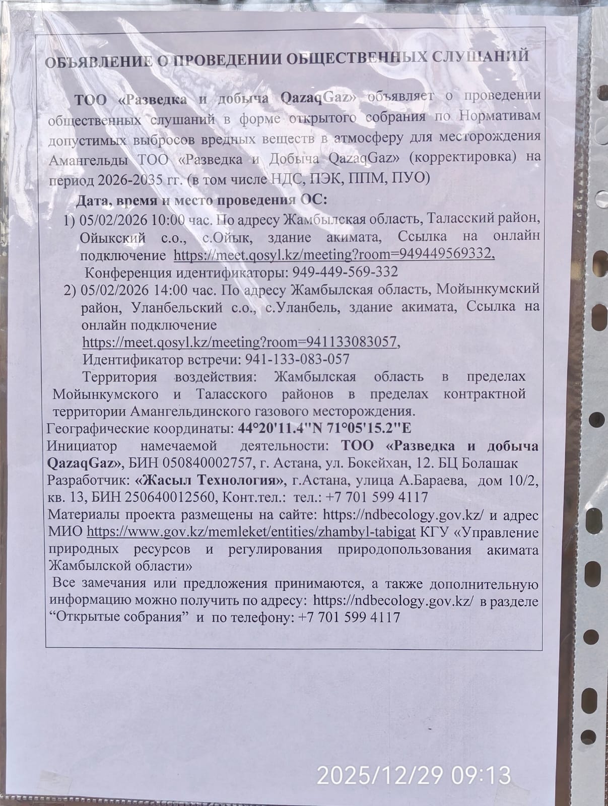1.4. Описание для подключения к онлайн трансляции при прохождении общественного слушания: Приглашение на запланированную встречу в Qosyl Тема встречи: ТОО «РАЗВЕДКА И ДОБЫЧА QAZAQGAZ» Время встречи: 05.02.2026 10:00 Длительность встречи: 01 час. Идентификатор встречи: 949-449-569-332 Подключиться к встрече в Qosyl: https://meet.qosyl.kz/meeting?room=949449569332