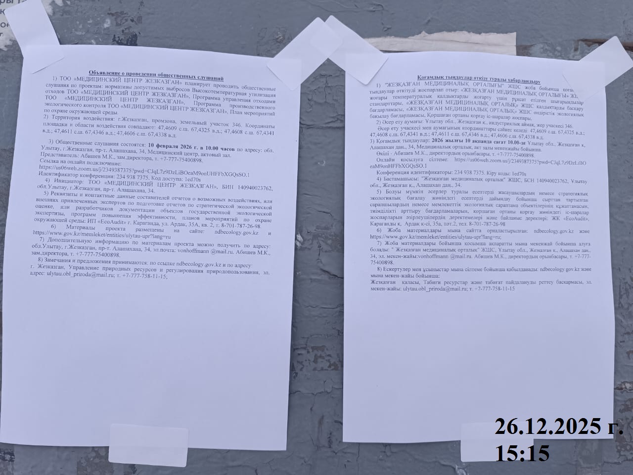 1.4. Описание для подключения к онлайн трансляции при прохождении общественного слушания: в соответствии с пп.4, п.11 прил. 3 Правил, информация о проведении общественных слушаний должна быть распространена на государственном и русском языках на досках объявлений местных исполнительных органов административно-территориальных единиц и в местах, специально предназначенных для размещения объявлений. В связи с чем необходимо дополнительно разместить печатные объявления на досках объявлений в акимате и в местах, специально предназначенных для размещения объявлений.