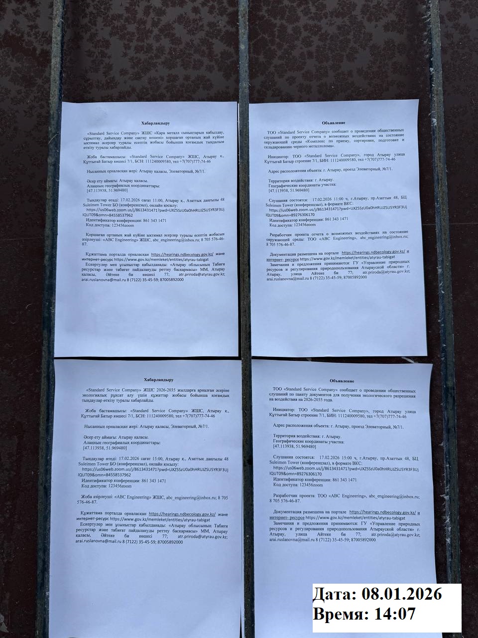 6. Объявление о проведении общественных слушаний на казахском и русском языках будет распространено следующими способами: