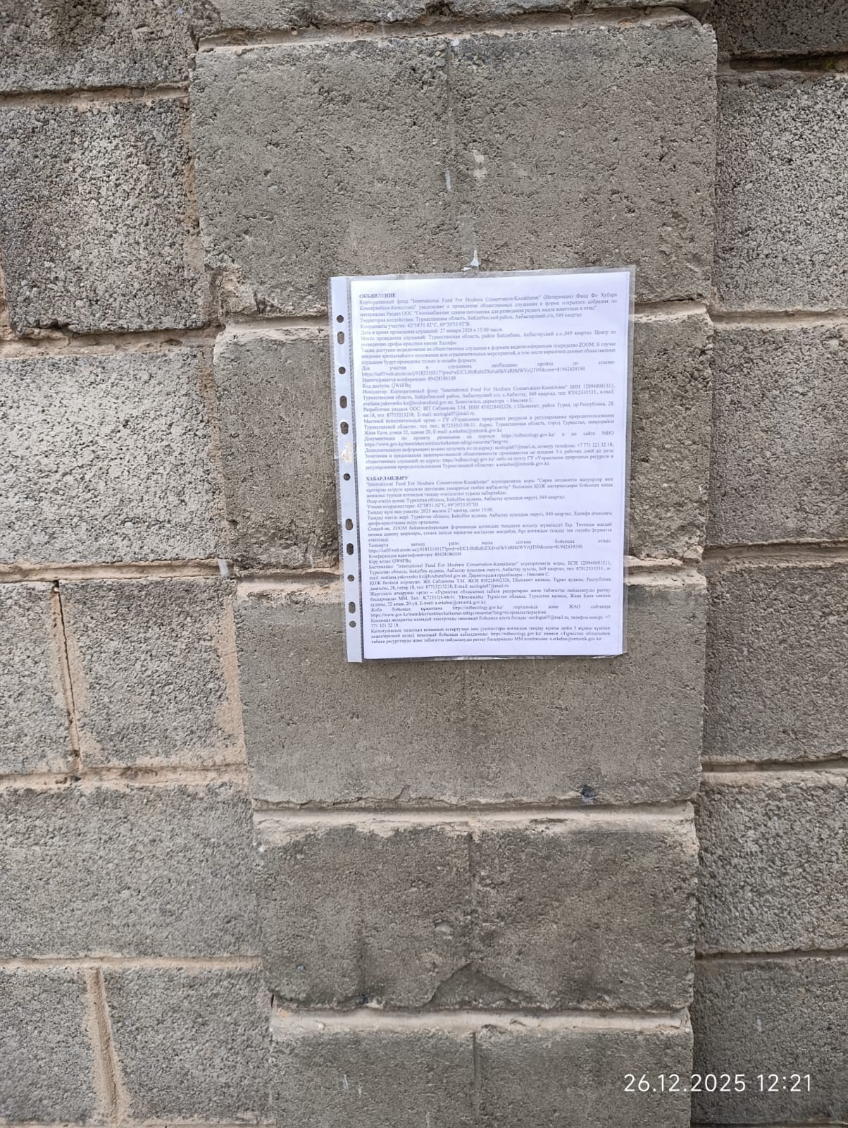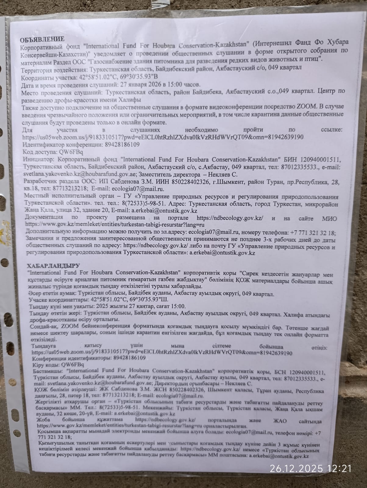 3. Общественные слушания организованны: Управление природных ресурсов и регулирования природопользования Туркестанской области, a.erkebai@ontustik.gov.kz,