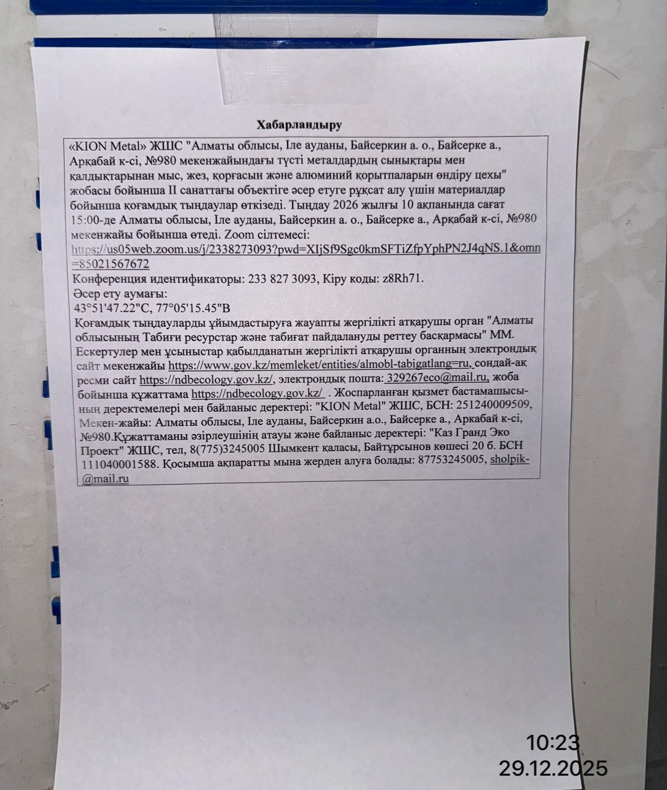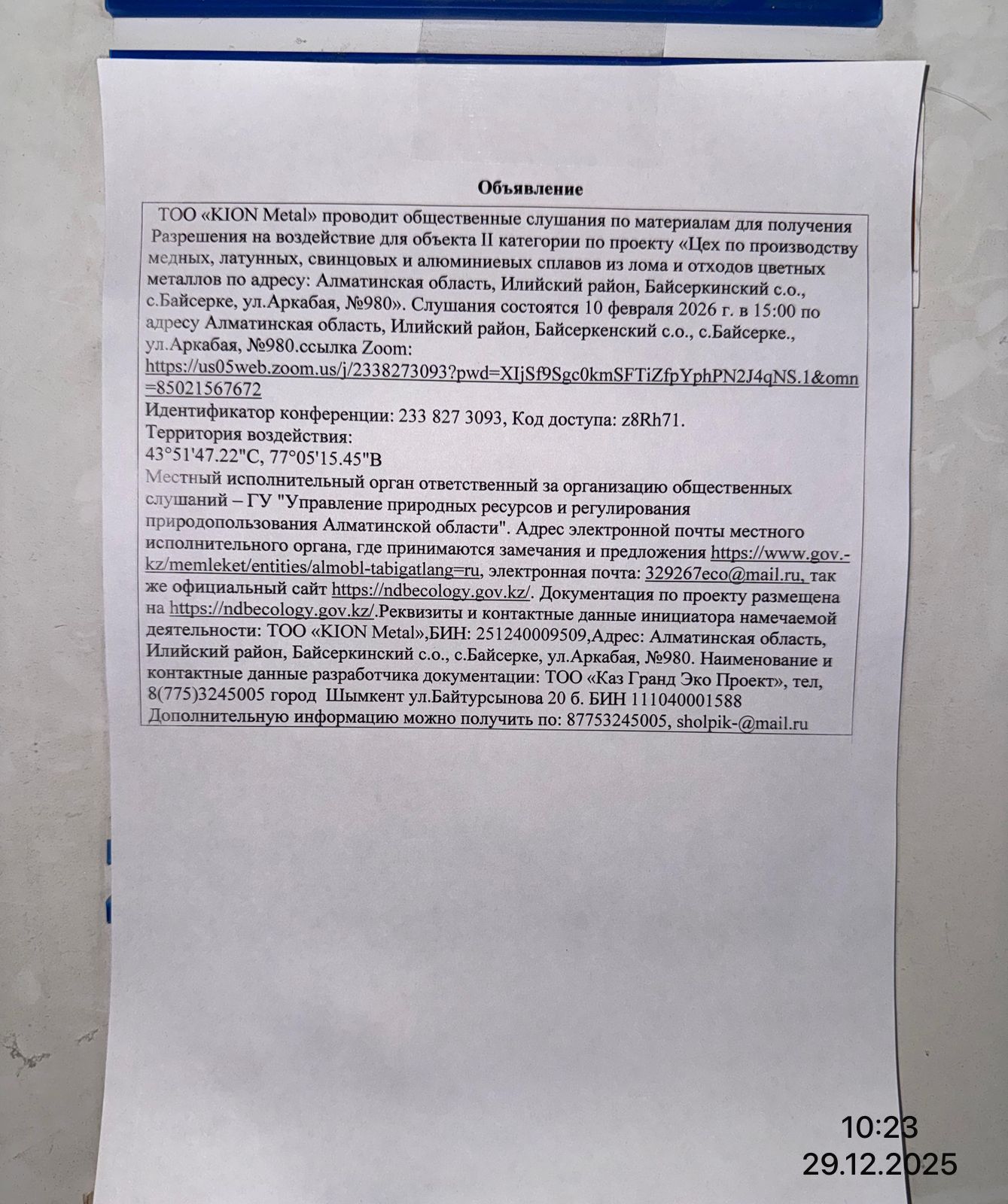 4. Повестка дня общественных слушаний: Производственный цех ТОО «KION Metal» расположен на арендован-ной территории, принадлежащей ИП «Балагазин», по адресу: Алматинская область, Илийский район, Байсеркинский с.о., с.Байсерке, ул.Аркабая, №980. Согласно договору аренды №2025/17 от 08 12 2025 года, ТОО «KION Metal» осуществляет свою производственную деятельность на территории площадью 6000 кв.м. в помещении, площадью 2800 кв.м. Территория участка производственного цеха со всех сторон граничит с производственными и складскими помещениями. С западной стороны на расстоянии около 400 метров проходит ул.Аркабая. Ближайшая жилая за-стройка (с.Байсерке) расположена на расстоянии более 300 метров от территории участка в восточном направлении. Ближайший поверхностный водный объект, река Карасу-Байсерке протекает с восточной стороны на расстоянии более 600 метров.