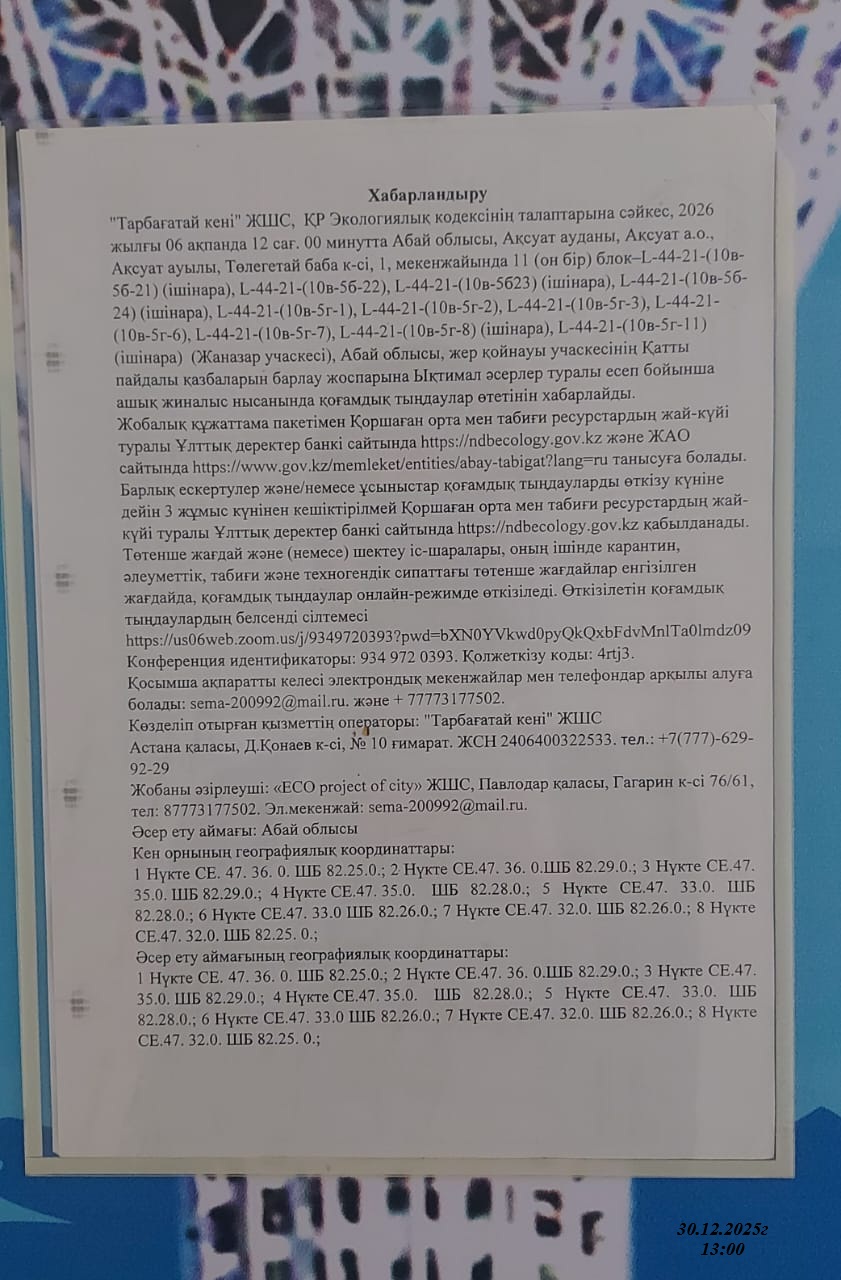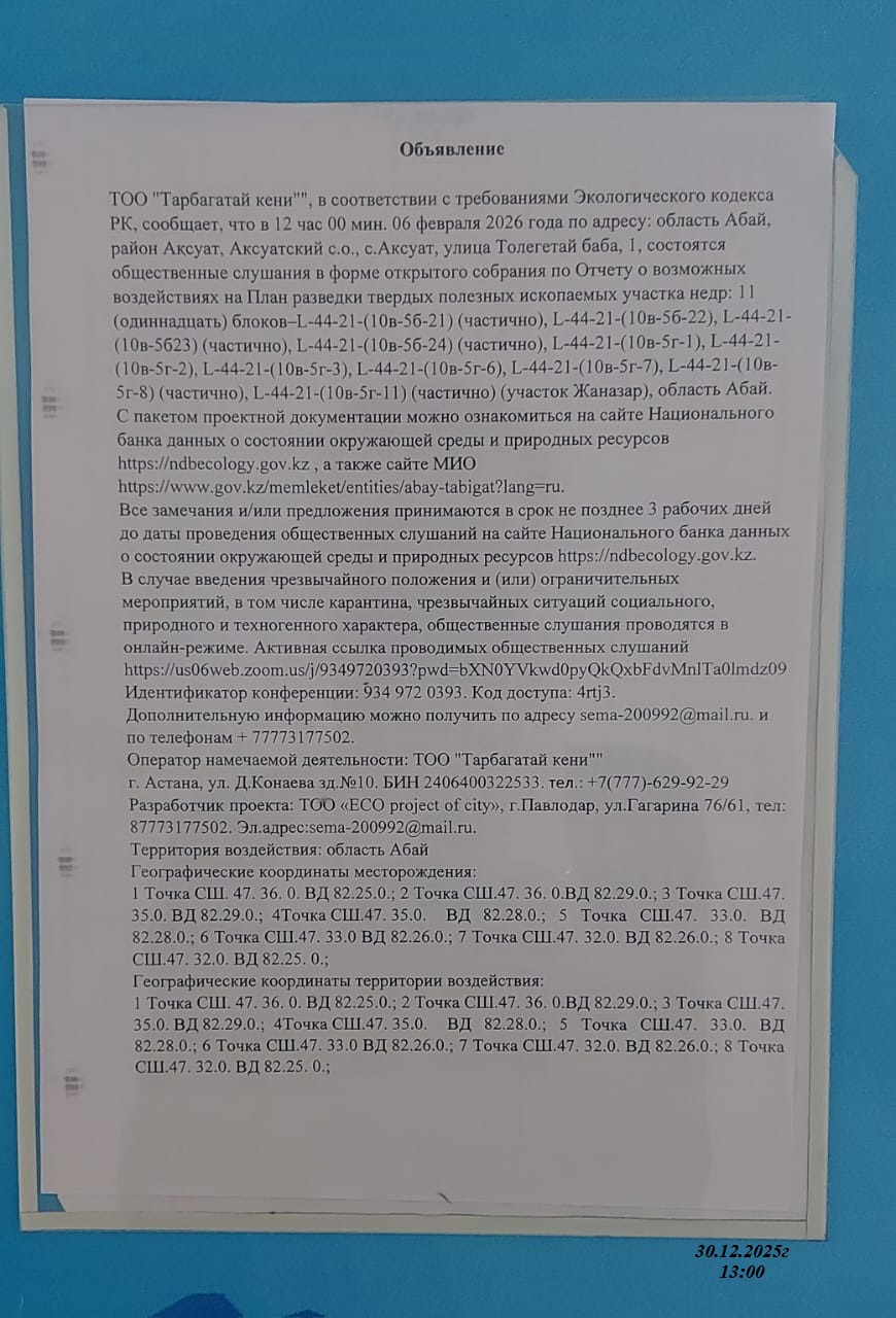 4. Повестка дня общественных слушаний: Отчет о возможных воздействиях на План разведки твердых полезных ископаемых участка недр: 11 (одиннадцать) блоков–L-44-21-(10в-5б-21) (частично), L-44-21-(10в-5б-22), L-44-21-(10в-5б23) (частично), L-44-21-(10в-5б-24) (частично), L-44-21-(10в-5г-1), L-44-21-(10в-5г-2), L-44-21-(10в-5г-3), L-44-21-(10в-5г-6), L-44-21-(10в-5г-7), L-44-21-(10в-5г-8) (частично), L-44-21-(10в-5г-11) (частично) (участок Жаназар), область Абай.В случае введения чрезвычайного положения и (или) ограничительных мероприятий, в том числе карантина, чрезвычайных ситуаций социального, природного и техногенного характера, общественные слушания проводятся в онлайн-режиме. Активная ссылка проводимых общественных слушаний https://us06web.zoom.us/j/9349720393?pwd=bXN0YVkwd0pyQkQxbFdvMnlTa0lmdz09 Идентификатор конференции: 934 972 0393. Код доступа: 4rtj3.