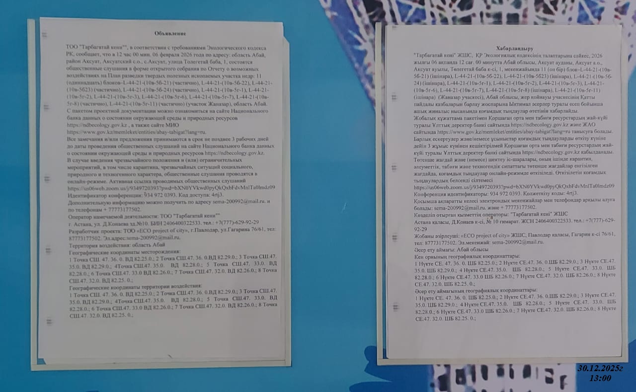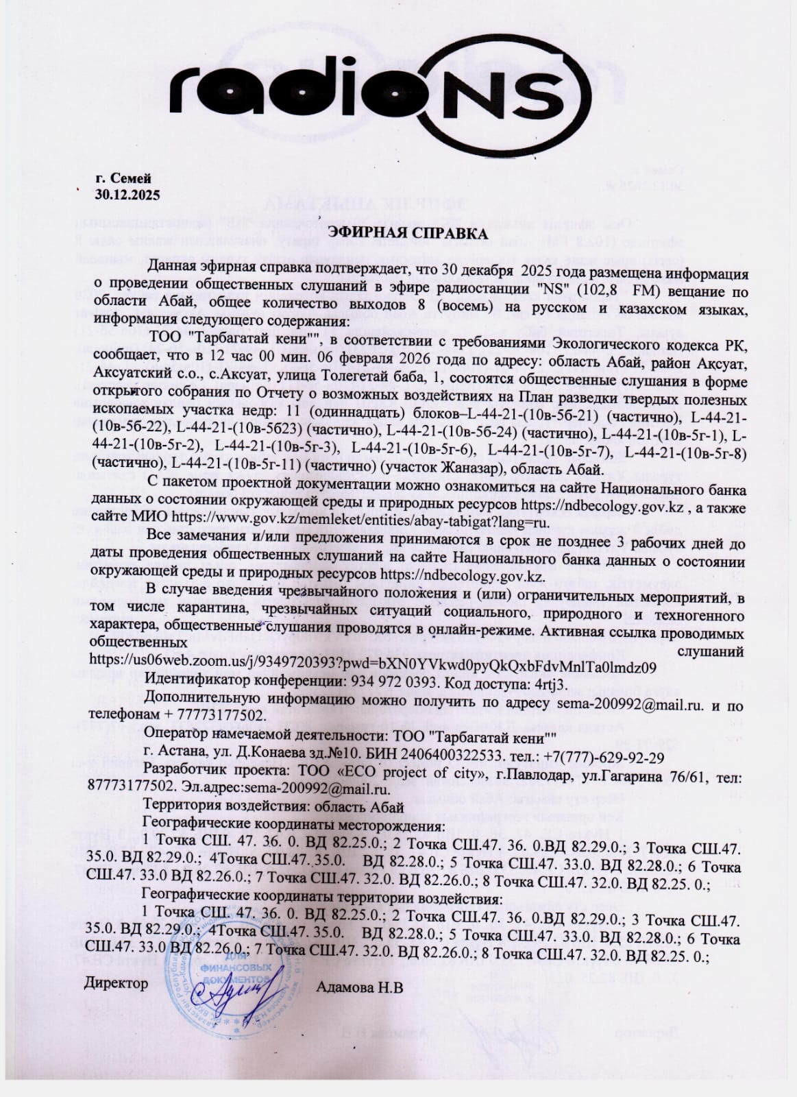 3. Общественные слушания организованны: Главный специалист УПР и ПР область Абай, prirodnyye_resursy_obl.abay@mail.ru,