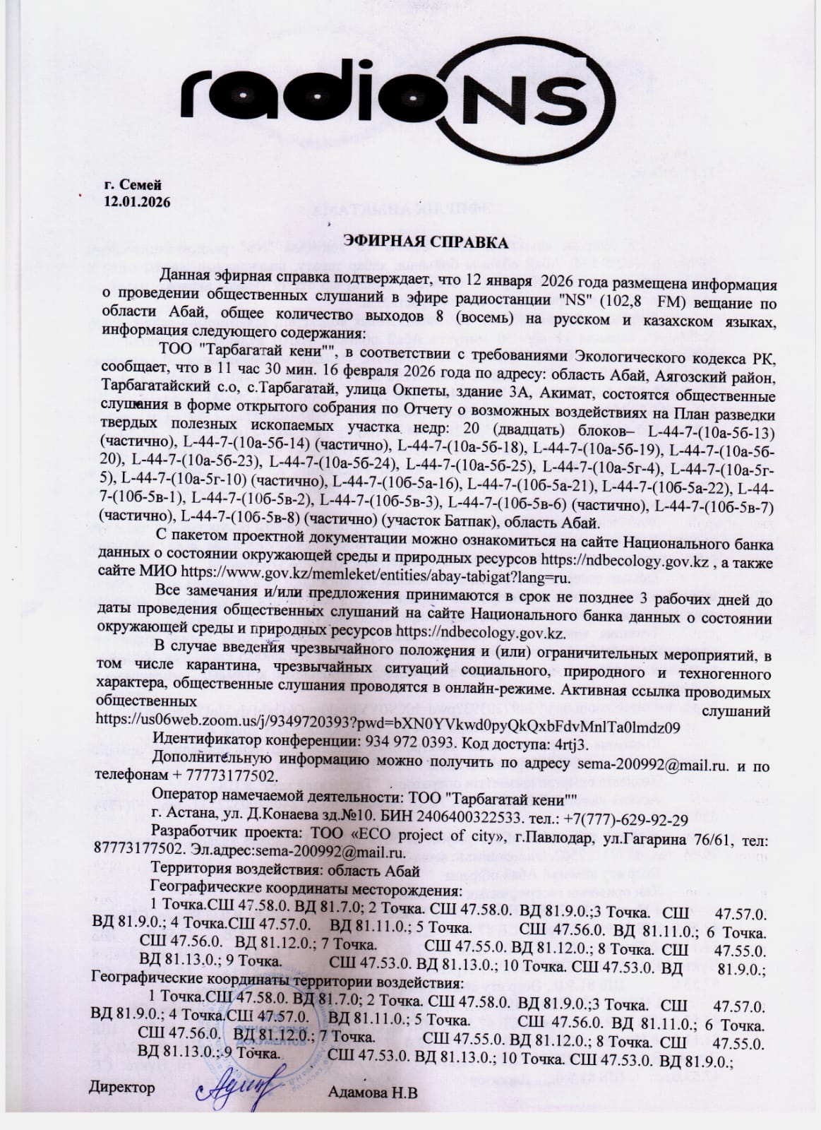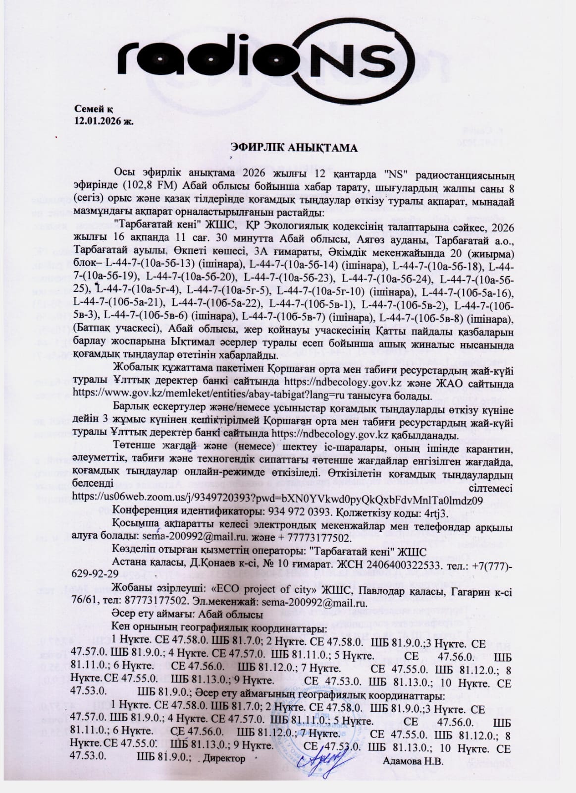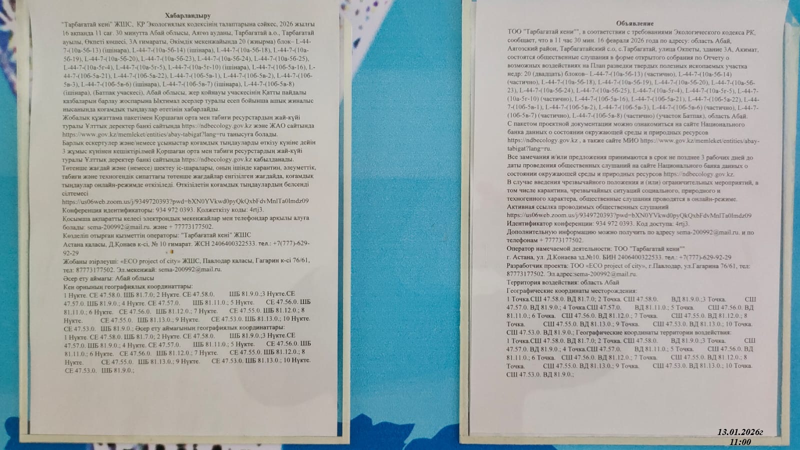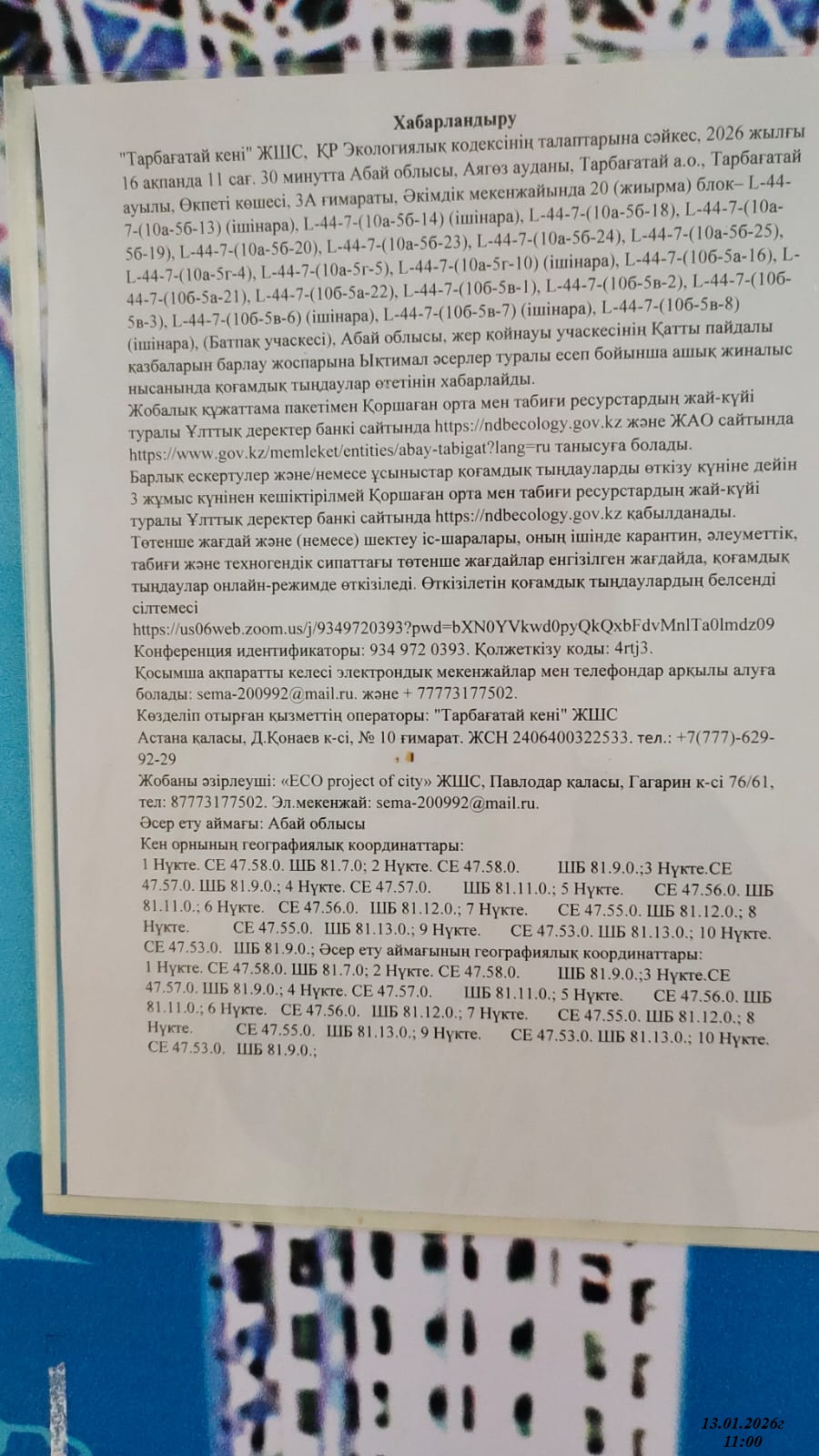 4. Повестка дня общественных слушаний: Отчет о возможных воздействиях на План разведки твердых полезных ископаемых участка недр: 20 (двадцать) блоков– L-44-7-(10а-5б-13) (частично), L-44-7-(10а-5б-14) (частично), L-44-7-(10а-5б-18), L-44-7-(10а-5б-19), L-44-7-(10а-5б-20), L-44-7-(10а-5б-23), L-44-7-(10а-5б-24), L-44-7-(10а-5б-25), L-44-7-(10а-5г-4), L-44-7-(10а-5г-5), L-44-7-(10а-5г-10) (частично), L-44-7-(10б-5а-16), L-44-7-(10б-5а-21), L-44-7-(10б-5а-22), L-44-7-(10б-5в-1), L-44-7-(10б-5в-2), L-44-7-(10б-5в-3), L-44-7-(10б-5в-6) (частично), L-44-7-(10б-5в-7) (частично), L-44-7-(10б-5в-8) (ча-стично) (участок Батпак), область Абай В случае введения чрезвычайного положения и (или) ограничительных мероприятий, в том числе карантина, чрезвычайных ситуаций социального, природного и техногенного характера, общественные слушания проводятся в онлайн-режиме. Активная ссылка проводимых общественных слушаний https://us06web.zoom.us/j/9349720393?pwd=bXN0YVkwd0pyQkQxbFdvMnlTa0lmdz09 Идентификатор конференции: 934 972 0393. Код доступа: 4rtj3