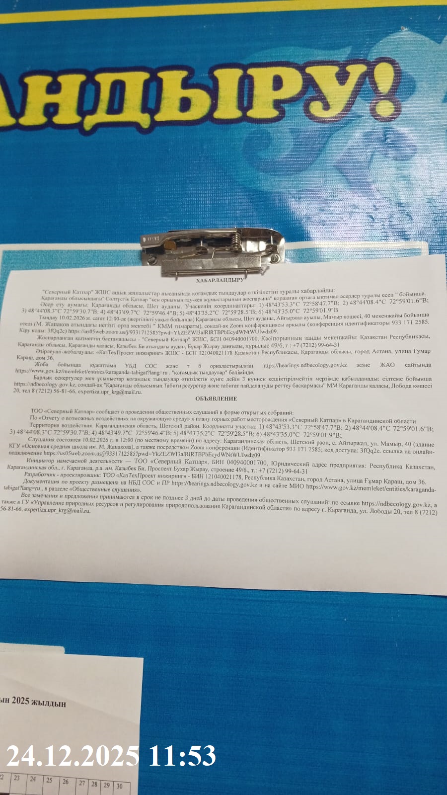 4. Повестка дня общественных слушаний: Месторождение «Северный Катпар» расположено в Шетском районе Карагандинской области Республики Казахстан. Месторождение размещается в благоприятных географо-экономических условиях, вблизи от крупных транспортных и энергетических коммуникаций. В 130 км к северу от месторождения располагается крупный областной и промышленный центр – город Караганда. Ближайшими населенными пунктами являются: Айгыржал - 10 км к юго-западу; Унрек – 11 км к северу; центральная усадьба совхоза «Шетский» - в 12 км к северу; железнодорожная станция Нельды в 21 км к юго-западу и поселок Верхний Кайракты в 15 км к югу от месторождения Северный Катпар. Железнодорожная сеть района представлена электрифицированной магистральной 2-х путной линией и железнодорожной линией местного значения. Непосредственно через месторождение проходит железнодорожная ветка Жарык-Верхнее Кайракты. Ближайшей к месторождению станцией является узловая участковая станция Жарык (23 км к северо-западу). По данным технико-экономических исследований существующие участки железной дороги имеют достаточный резерв пропускной способности для обслуживания ожидаемого внешнего грузооборота будущего предприятия. Автодорожная сеть района представлена государственными магистралями с капитальным покрытием, грейдерной автомагистралью. Кайрактинским ГМК до месторождения построены две ЛЭП: ЛЭП-110 кв от промплощадки; ЛЭП-35 кв от пос. Верхнее Кайракты. Историко-архитектурные и природные памятники, охраняемые законами Республики Казахстан в районе проектируемой деятельности, отсутствуют, письмо ГУ «Управление культуры, архивов и документации Карагандинской области» от 12.12.2025 года (Приложение В) Месторождение Северный Катпар в водоохранную зону реки Апасу, которая составляет 500 метров, а ширина прибрежной защитной полосы 35 метров. Письмо ГУ «Управление природных ресурсов и регулирования природопользования Карагандинской области» от 18.12.2025 года (Приложение В). Схема расположения испрашиваемого земельного участка ТОО «Северный Катпар» относительно реки Апарсу по состоянию на 17.12.2025 г, полученная в Филиал НАО «Государственная корпорация «Правительство для граждан» по Карагандинской области Управление земельного кадастра (Приложение В) Сибироязвенные захоронения и скотомогильники в районе проектируемой деятельности отсутствуют, письмо КГП на ПХВ «Шетская районная ветеринарная станция» Управления ветеринарии Карагандинской области от 10.12.2025 года. В зоне воздействия объекта отсутствуют земли лесного фонда и особо охраняемые природные территории., письмо РГУ «Карагандинская областная территориальная инспекция лесного хозяйства и животного мира» от 12.12.2025 года. Площадь горного отвода на поверхности составляет 0,92 кв. км, глубиной –400 м. посредством Zoom конференции (Идентификатор 933 171 2585; код доступа: 3fQq2c. ссылка на онлайн-подключение https://us05web.zoom.us/j/9331712585?pwd=YkZEZWI3alRlRTBPbEcydWNtWUIwdz09
