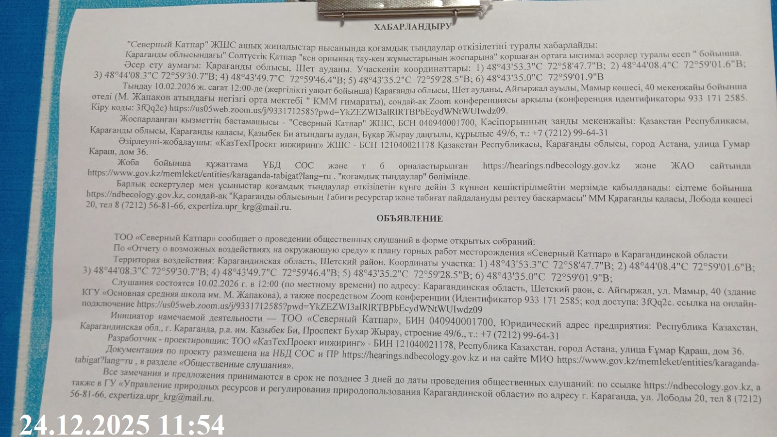 3. Общественные слушания организованны: Управление природных ресурсов и регулирования природопользования Карагандинской области, expertiza.upr_krg@mail.ru,