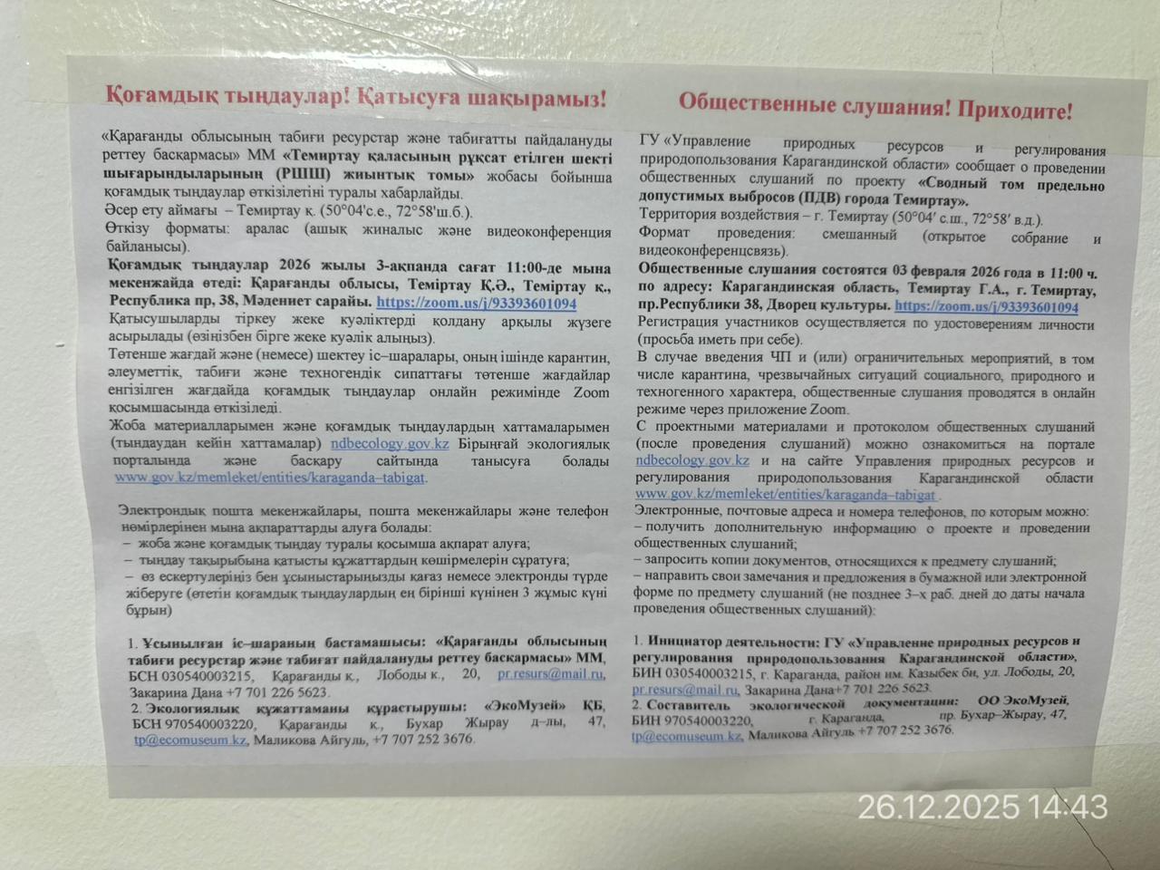 3. Общественные слушания организованны: Управление природных ресурсов и регулирования природопользования Карагандинской области, expertiza.upr_krg@mail.ru,