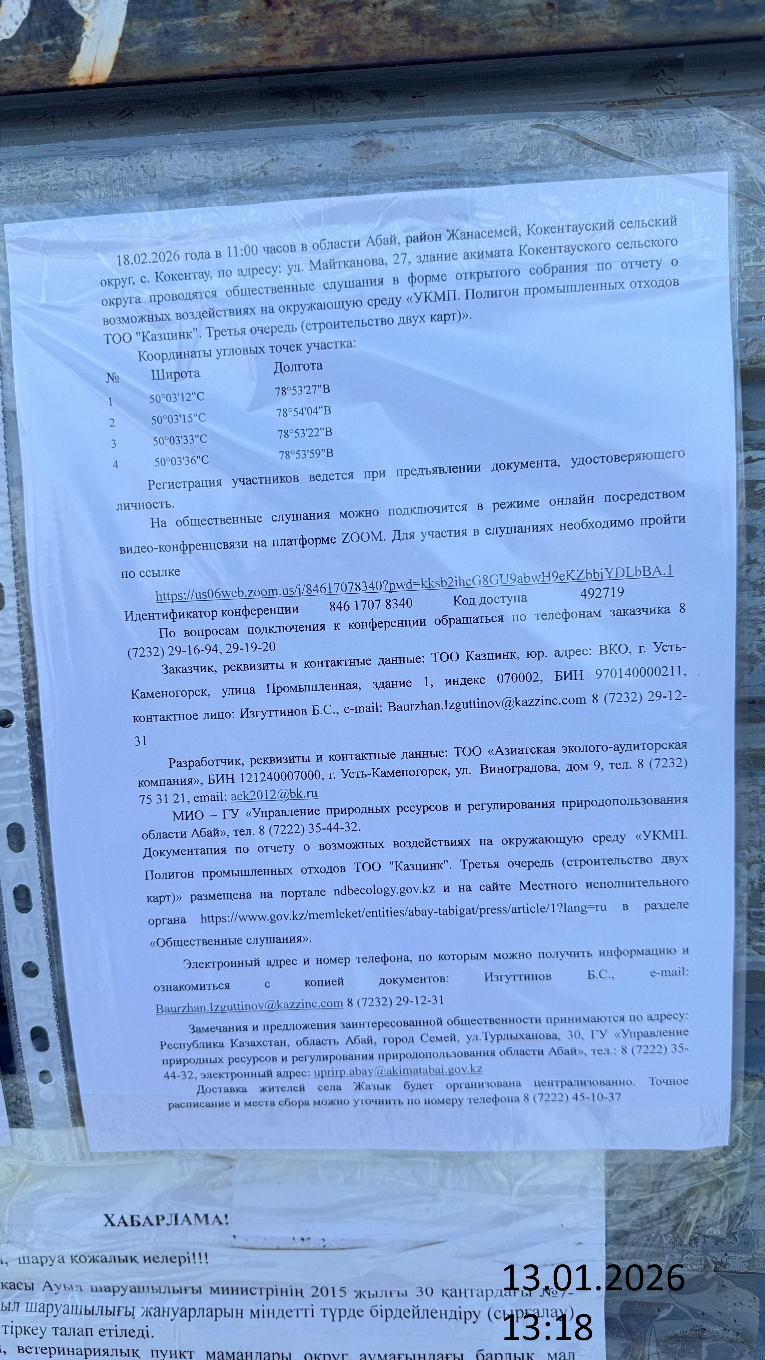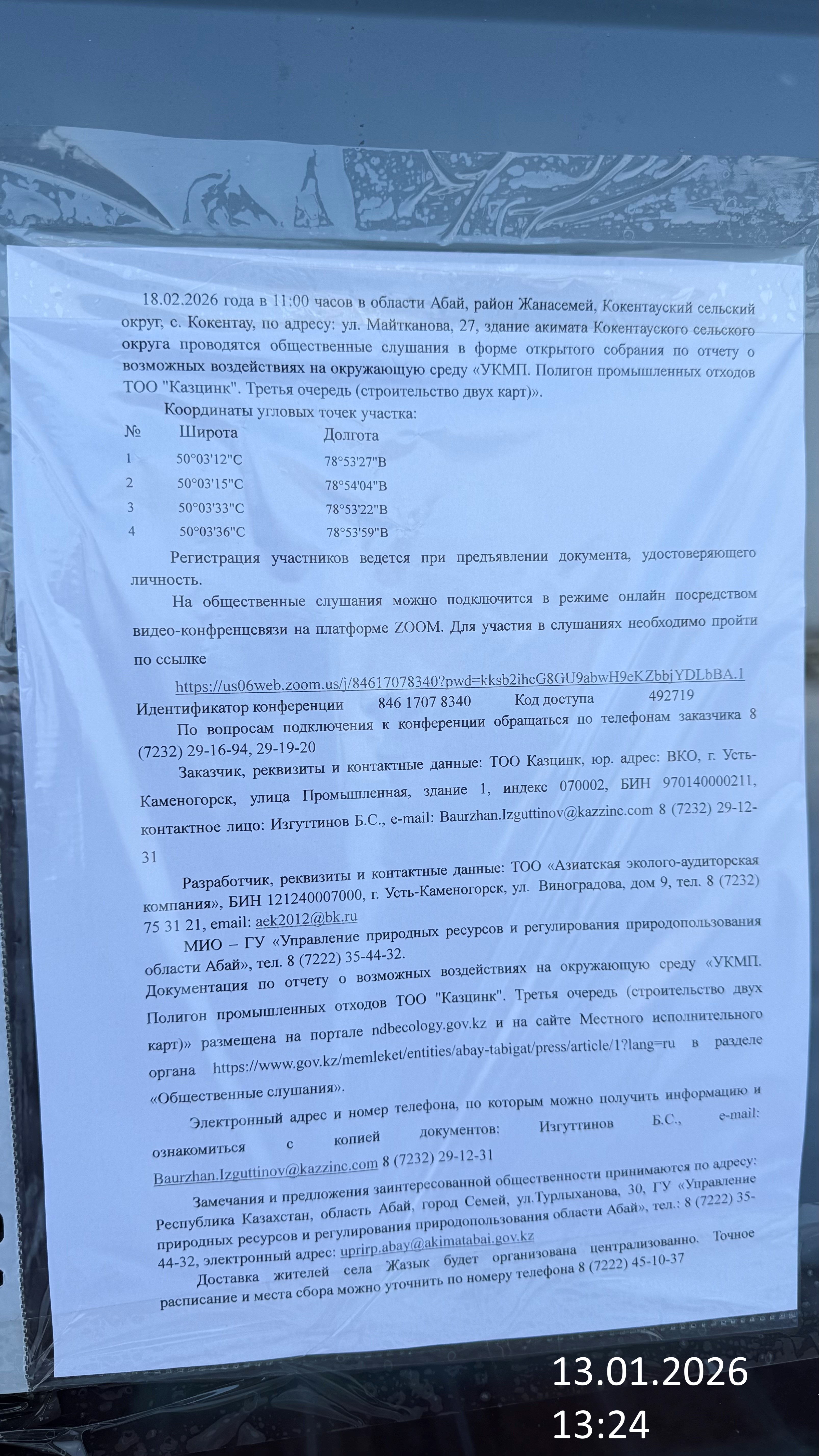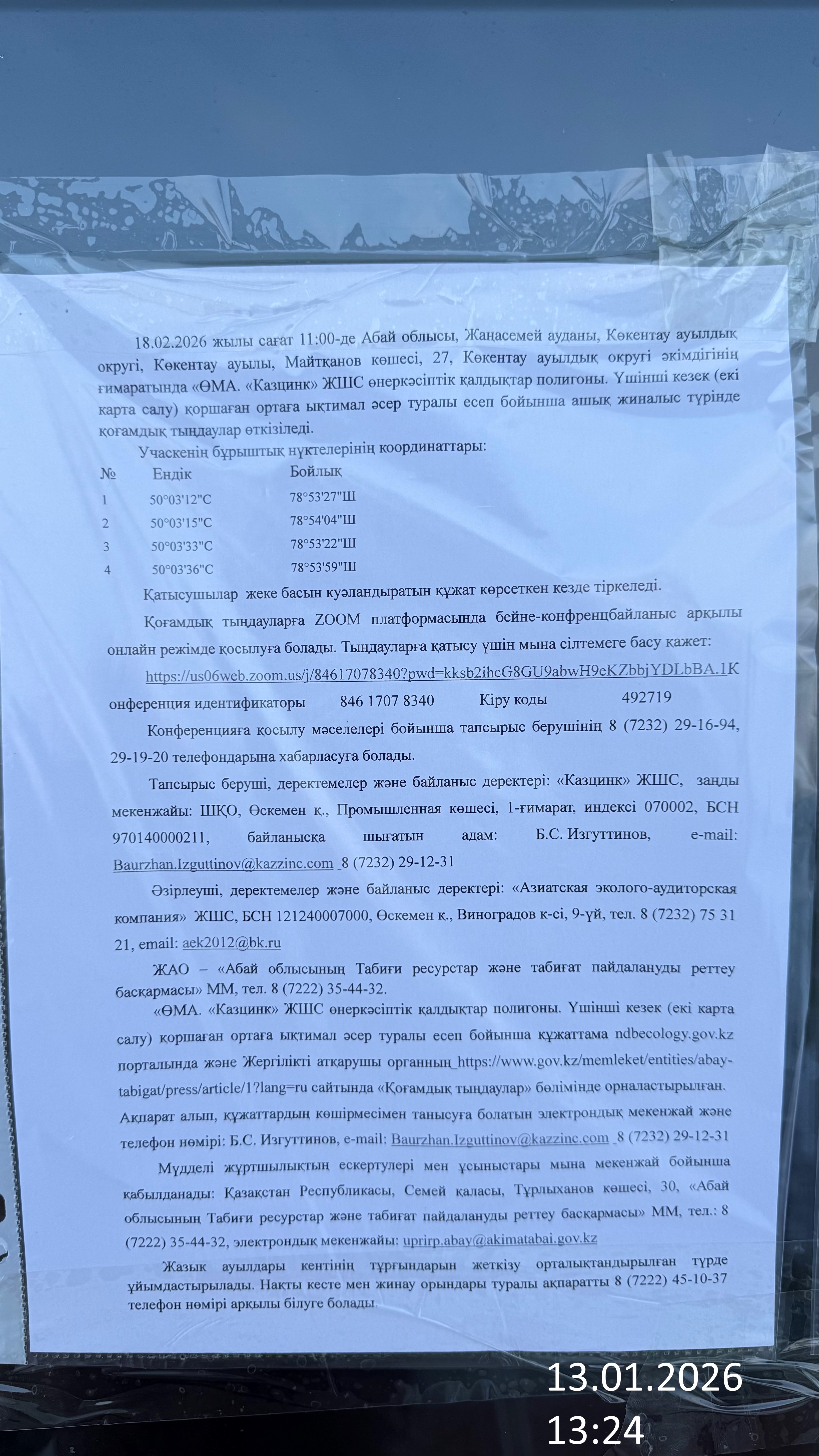 3. Общественные слушания организованны: Главный специалист УПР и ПР область Абай, prirodnyye_resursy_obl.abay@mail.ru,