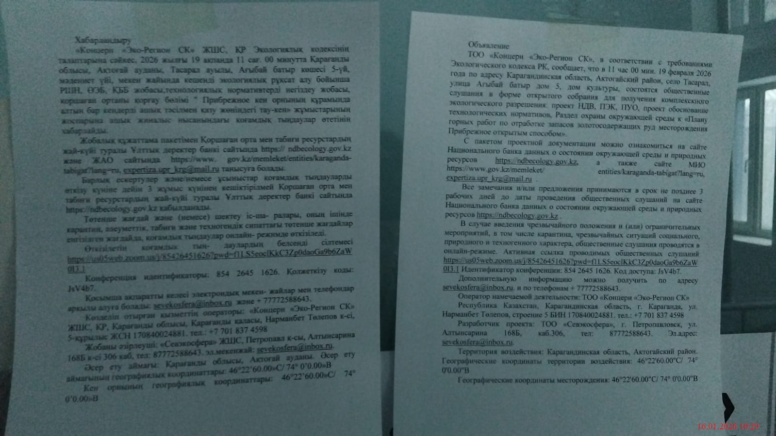 3. Общественные слушания организованны: Управление природных ресурсов и регулирования природопользования Карагандинской области, expertiza.upr_krg@mail.ru,
