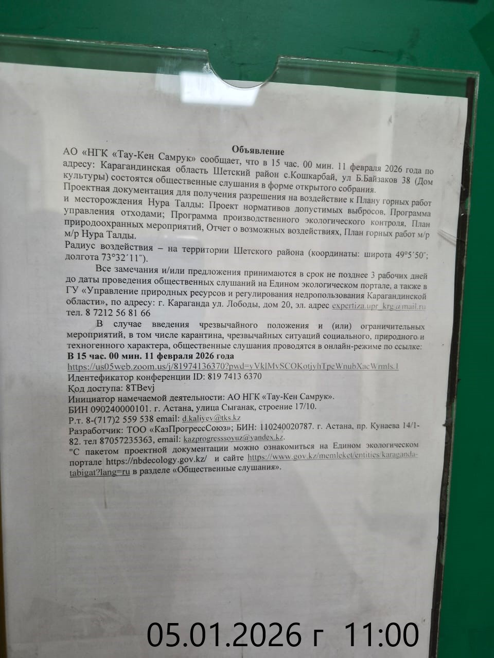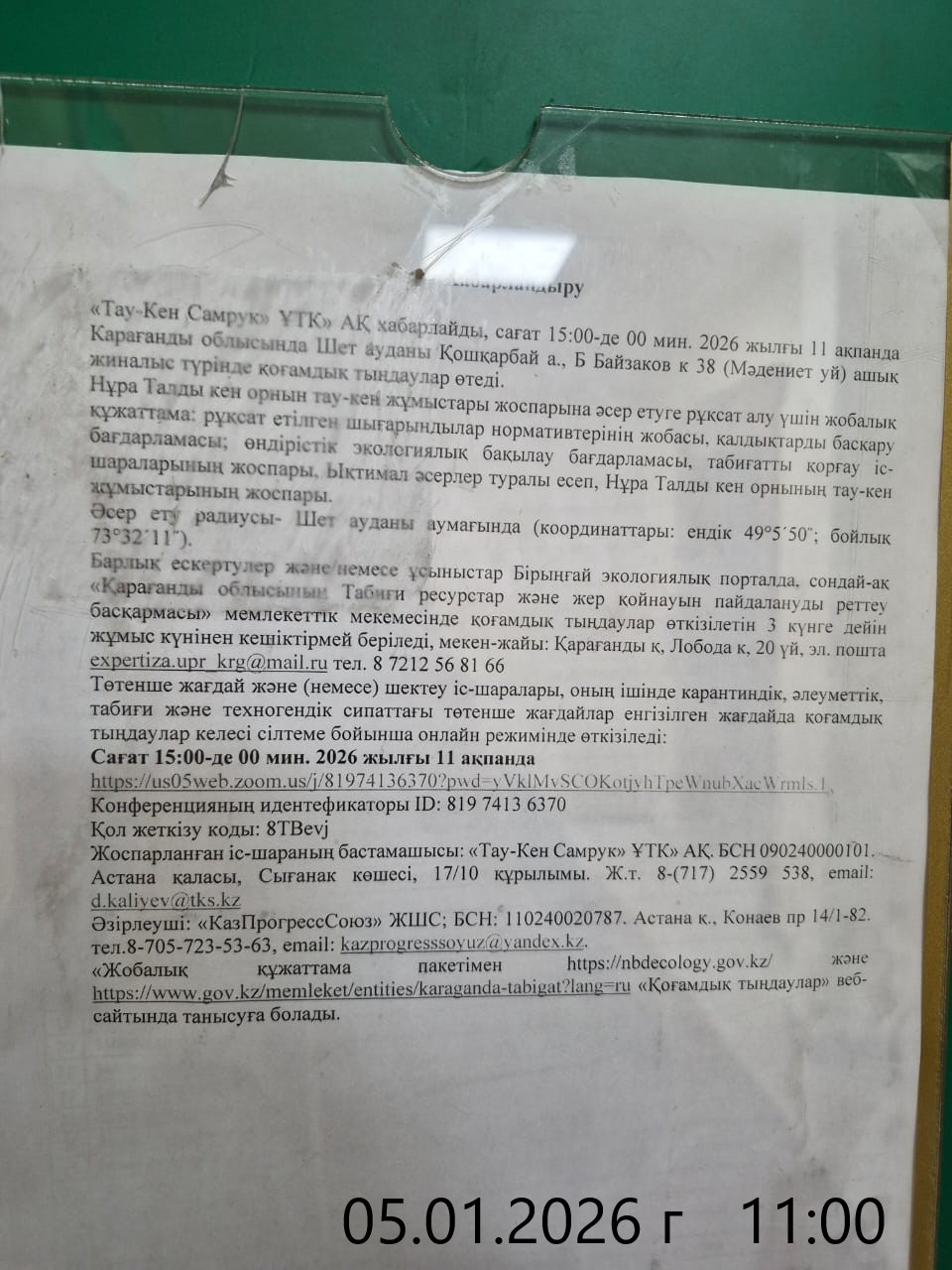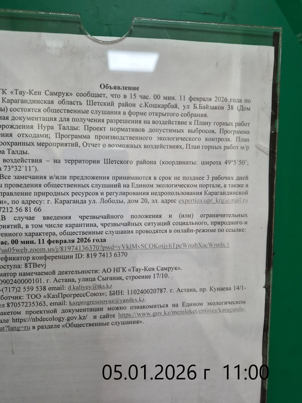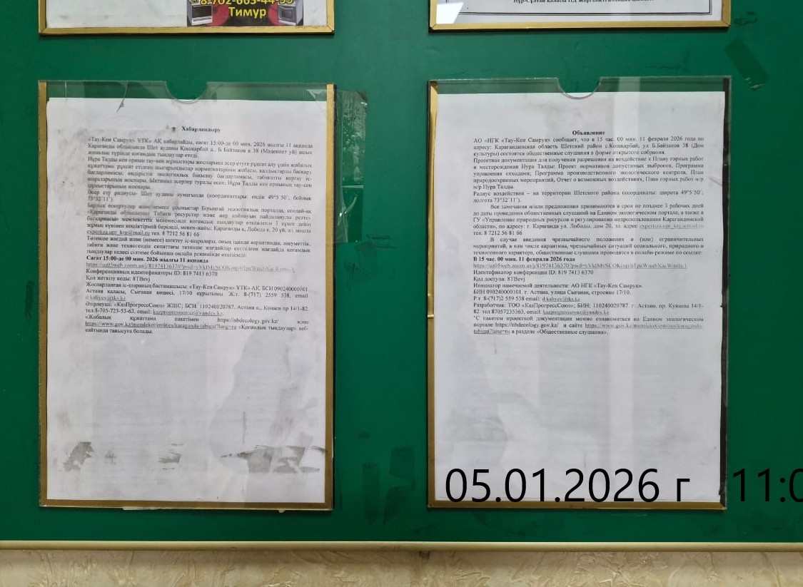 3. Общественные слушания организованны: Управление природных ресурсов и регулирования природопользования Карагандинской области, expertiza.upr_krg@mail.ru,