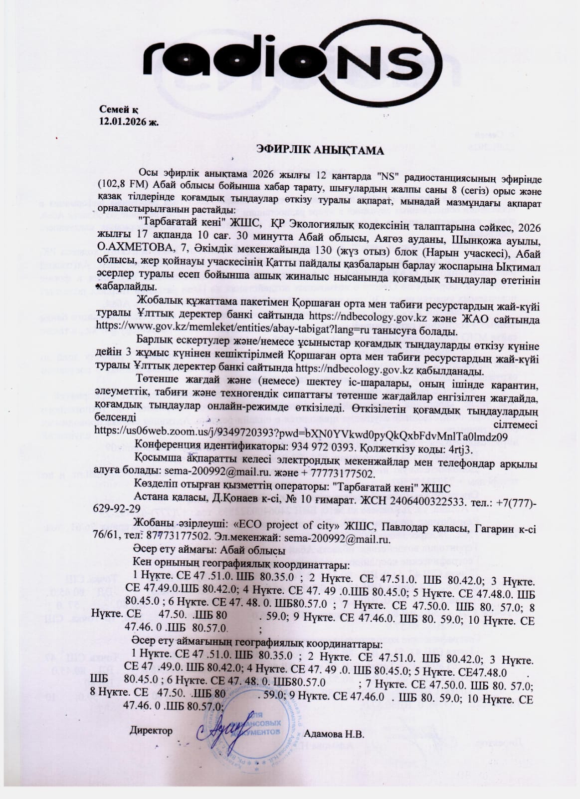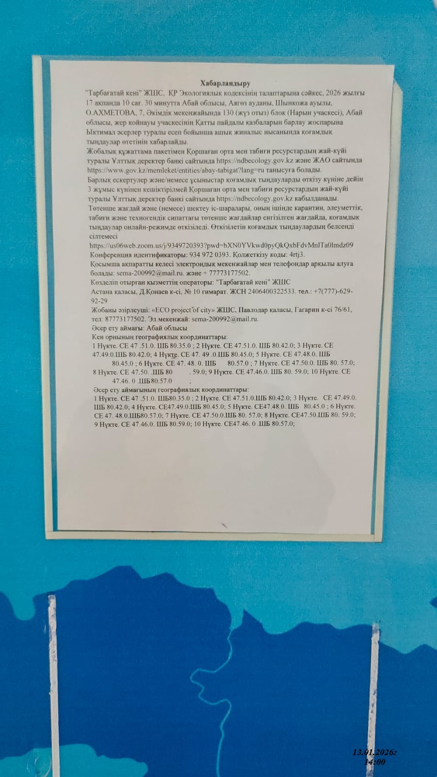 3. Общественные слушания организованны: Главный специалист УПР и ПР область Абай, prirodnyye_resursy_obl.abay@mail.ru,