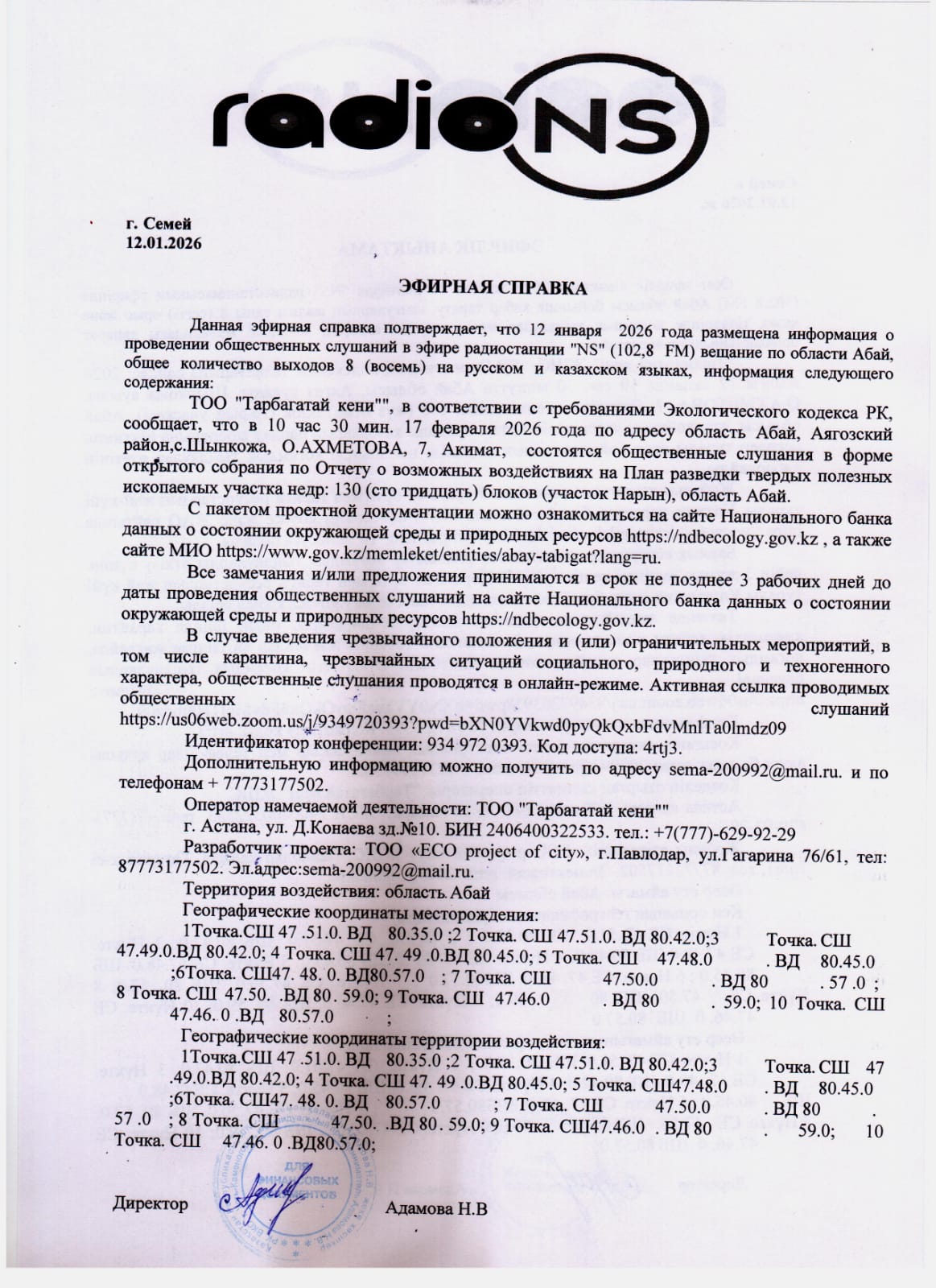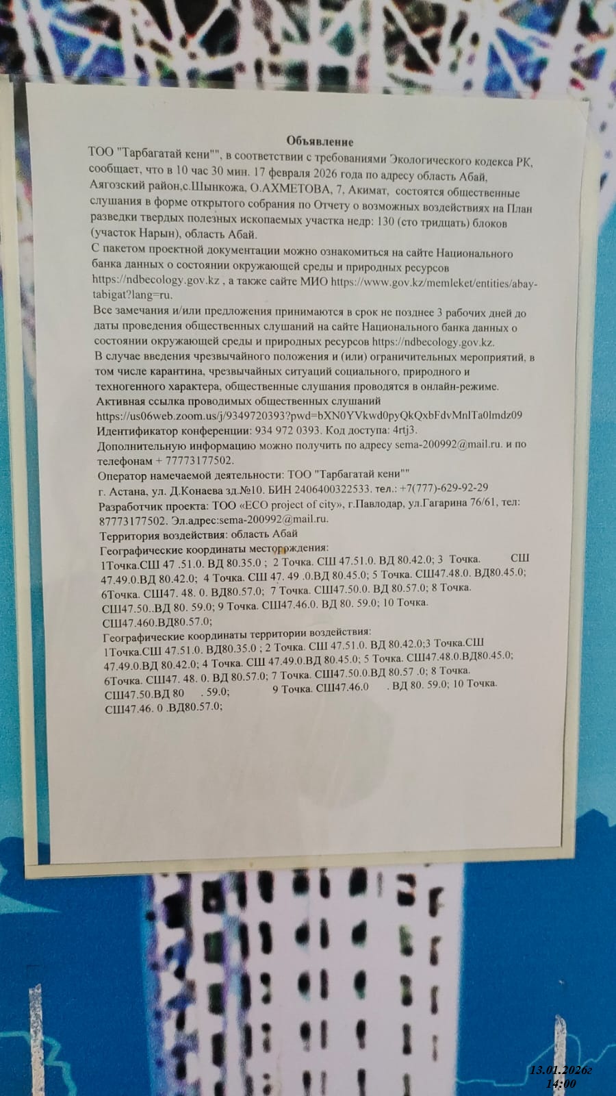 4. Повестка дня общественных слушаний: Отчет о возможных воздействиях на План разведки твердых полезных ископаемых участка недр: 130 (сто тридцать) блоков (участок Нарын), область Абай..В случае введения чрезвычайного положения и (или) ограничительных мероприятий, в том числе карантина, чрезвычайных ситуаций социального, природного и техногенного характера, общественные слушания проводятся в онлайн-режиме. Активная ссылка проводимых общественных слушаний https://us06web.zoom.us/j/9349720393?pwd=bXN0YVkwd0pyQkQxbFdvMnlTa0lmdz09 Идентификатор конференции: 934 972 0393. Код доступа: 4rtj3.